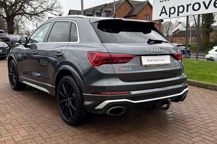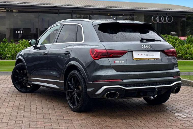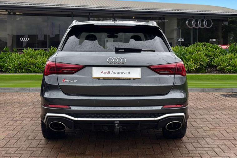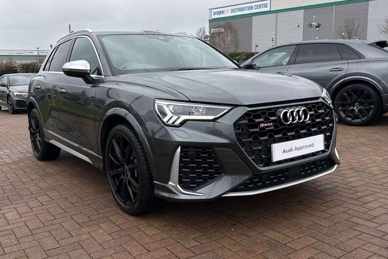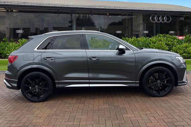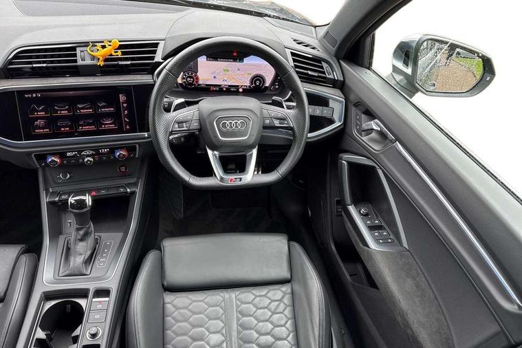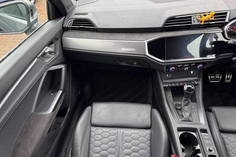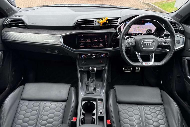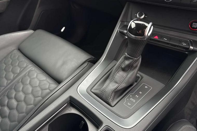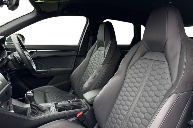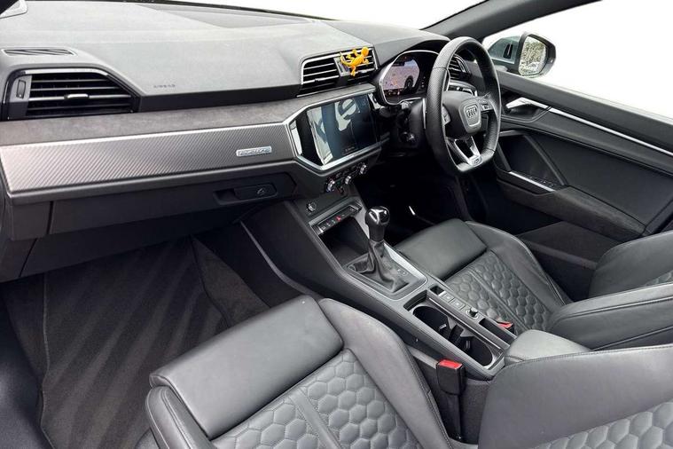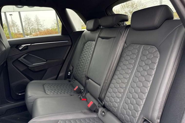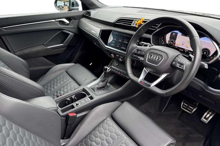 Audi connect safety and service (e-call), Audi drive select with new RS modes, Audi lane departure warning, Audi parking system plus with front and rear sensors, Audi virtual cockpit plus - 12.3 inch display, Bluetooth interface, Camera based traffic sign recognition, MMI Navigation Plus with high resolution 10.1 inch touchscreen colour display, Power operated tailgate, Progressive steering, Smartphone interface includes wireless Apple carplay/Android Auto, Start stop system with recuperation, Voice control system with natural language interaction, Quattro all wheel drive, 2 USB-C ports with charge and data functions, Audi sound system, DAB digital radio module, Acoustic windscreen, Aluminium roof rails, Aluminium window trim, Audi Beam uses LEDs to project the Audi Sport logo, Auto dimming frameless rear view mirror, Body colour rear spoiler, Electrically folding, adjustable and heated door mirrors with integrated LED side indicators and kerb view function for passenger side, Flared wheel arches, Flat slits on single frame grille, Front spoiler blade, side blades, inserts on door trim strips and diffuser insert in matt aluminium look, Headlight washers, High gloss black finish B and C pillars, Honeycomb radiator grille in gloss black, Illuminated door sill trims with RS logo, LED headlights with LED daytime running lights and dynamic rear indicator, LED rear lights, Privacy glass dark tinted rear and rear-side windows (from B-pillar backwards), Rain and light sensors, RS specific bumpers with large front air inlets in black, 4 way electric lumbar support for driver and front passenger, Adjustable rear seat bench/backrest with centre armrest and cupholder, Black Alcantara elements - dashboard and the armrests in the front and rear doors, Black cloth headlining, Dual zone electronic climate control, Electrically adjustable front seats, Fine Nappa leather upholstery with front sports seats + honeycomb stitching and RS embossed logo, Front and rear floor mats, Front and rear head restraints, Front centre armrest, Heated front seats, ISOFIX child seat mounting for front passenger with airbag deactivation and outer rear seat including top tether attachment point for outer rear seats, Stainless steel luggage compartment sill finisher, Stainless steel pedals, Ambient lighting pack - RS Q3, Non smoking pack - RS Q3, 3x3 point rear seatbelts, 6 airbags - Driver, front passenger, curtain and side windows, Audi pre-sense front with pedestrain and cyclist recognition, Electrically operated child locks on rear doors, Electromechanical parking brake, Electronic stabilisation control including ABS, ASR and EDL, Hill descent control, Hill hold assist, Pre sense basic, RS brake system, Seatbelt monitoring, Tyre pressure warning, Warning triangle and first aid kit, Advanced key, Anti theft alarm, Anti theft wheel bolts, Aluminium look interior elements, Detail dashboard around MMI touch colour display in glass look, black with surround in aluminium look, Inlays in aluminium race anthracite, Tool kit, Tyre repair kit,