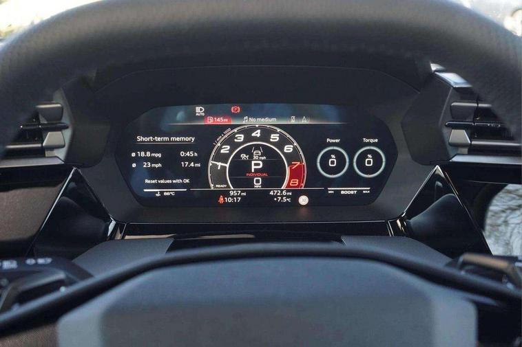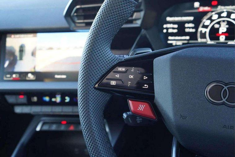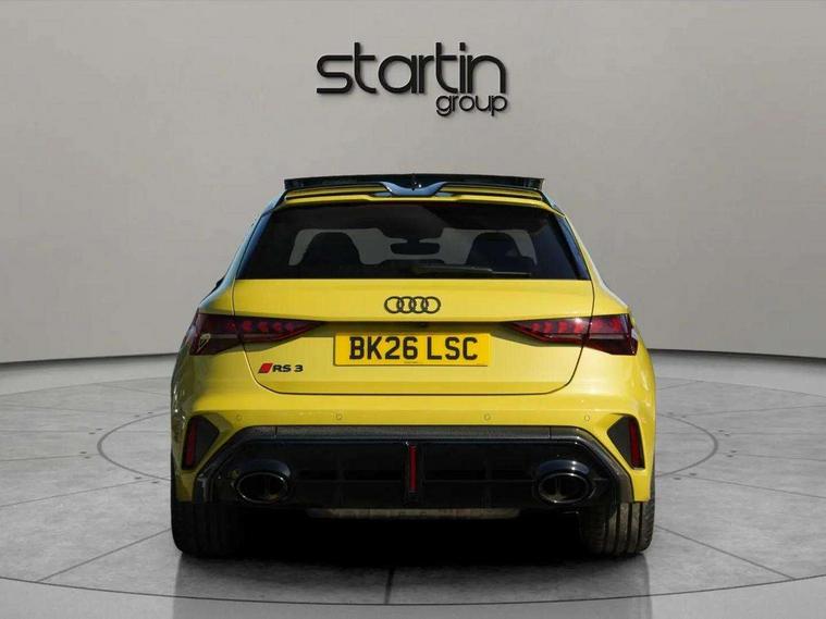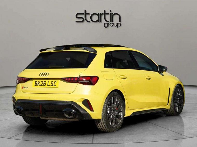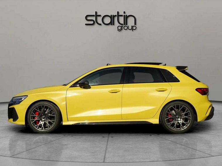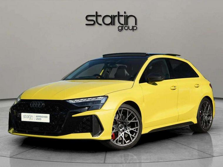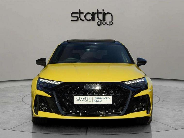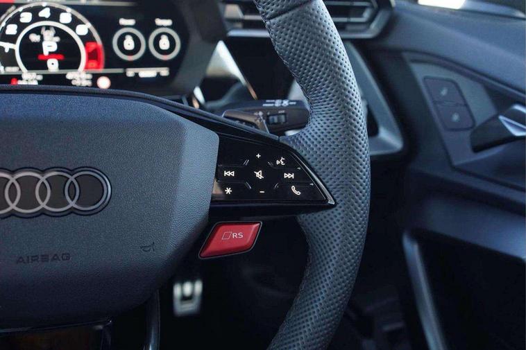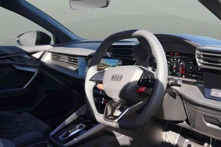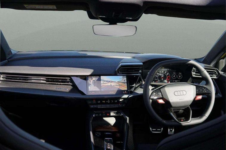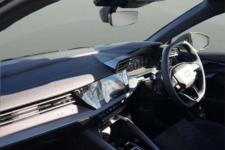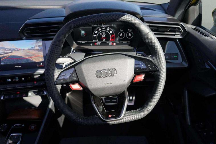 Adjustable speed limiter, Audi drive select comfort, auto, dynamic and efficiency, Audi virtual cockpit plus with RS specific design and 12.3" display with additional graphic display options, Automatic start/stop system with recuperation, Bluetooth interface, Camera based traffic sign recognition, Collision avoidance assistant, Driver attention and fatigue detection, e-Call (emergency call), MMI Navigation Plus with high resolution 10.1" colour touch screen display, Progressive steering, RS specific driving modes - RS Individual, RS Performance and RS Torque rear, Service indicator, Smartphone interface with app store includes wireless Apple carplay, Android auto and Amazon alexa integration, Trip computer, Voice control system with natural language interaction, Adaptive suspension, Increase of top speed to 174 mph, Quattro permanent four wheel drive, Audi Phonebox light with wireless charging, DAB Digital radio, USB ports with charging function in the rear, Audi beam LED projection of RS logo on ground as you exit, Auto dimming frameless rear view mirror, Carbon door mirror housings, Electrically adjustable/heated/folding/auto dimming door mirrors with integrated LED indications + kerb view function for passenger side, Engine compartment cover with carbon trim, Exterior model badging, Front electric windows, Heat insulating glass windscreen, LED 3rd brake light, Light and rain sensors, Privacy glass - dark tinted rear window, rear door and side windows, Rear electric windows, Rear side wing doors, Rear wiper, Roof edge spoiler in carbon, RS sport exhaust system - dual branch with flap control and gloss black oval tailpipe trims, 12V socket and storage compartment in front centre console, 3 seat bench in 2nd row, 3 Spoke flat top and bottomed black leather multi function steering and gear shift paddles, 3-zone deluxe automatic air conditioning, 40/20/40 split folding rear seat bench, Black cloth headlining, Black front and rear floor mats, Front and rear headrests, Front centre armrest, Front door sill trims with RS 3 logo, Heated front seats, Height and reach adjustable steering wheel, Manual boot compartment lid, Rear centre armrest with cupholder, Seat side bolsters, Single front passenger seat, Stainless steel pedals and front footrest in black, Vanadium look - Interior door handles, Door trim, power latching, Air vents, window controls, mirror adjust, rear door lock, Selector lever in centre console, Black Styling plus package - RS3, Extended ambient lighting package Pro with Multi-coloured contour lighting of instrument panel - RS3, RS exterior features pack in carbon and gloss black - RS3, Storage package - RS3 Sportback, 3x3 point rear seat belts, Driver and front passenger airbag with passenger airbag deactivation, Electronic Stabilisation Control (ESC) including ABS, ASR and EDL, First aid kit with warning triangle and 2 safety vests, Hill hold assist, Pre-sense front with pedestrian and cyclist detection, Seatbelt monitoring, Tyre pressure loss indicator, Anti theft alarm, Anti-theft wheel bolts, Electronically operated child locks, Immobiliser, Black dashboard, Inlays in carbon atlas structure, Tyre repair kit,