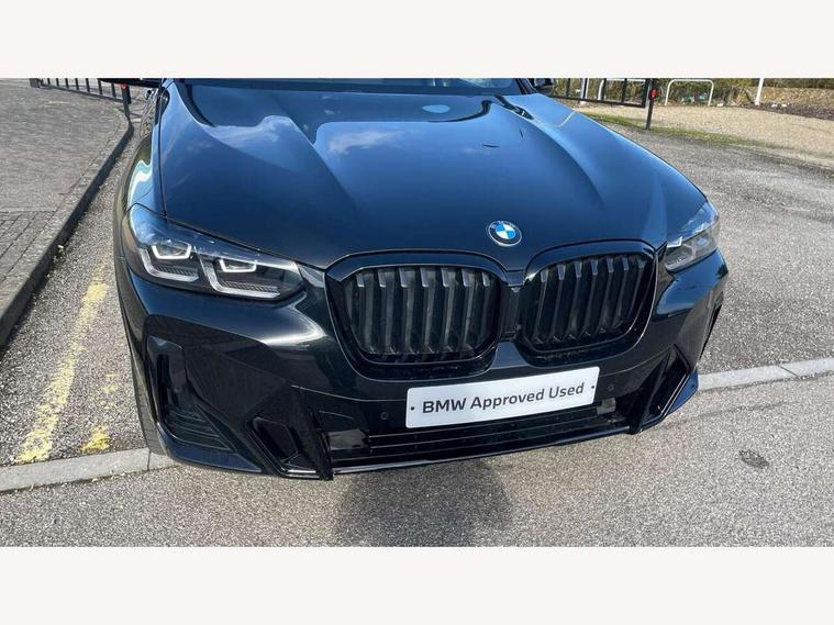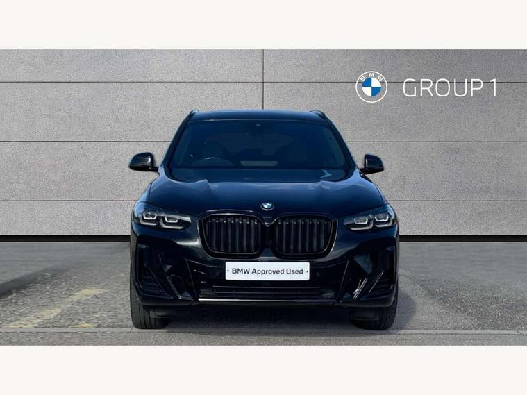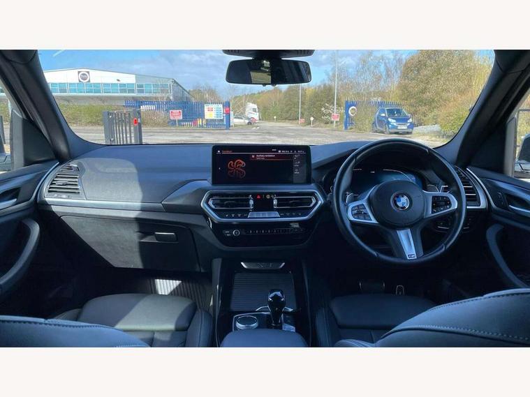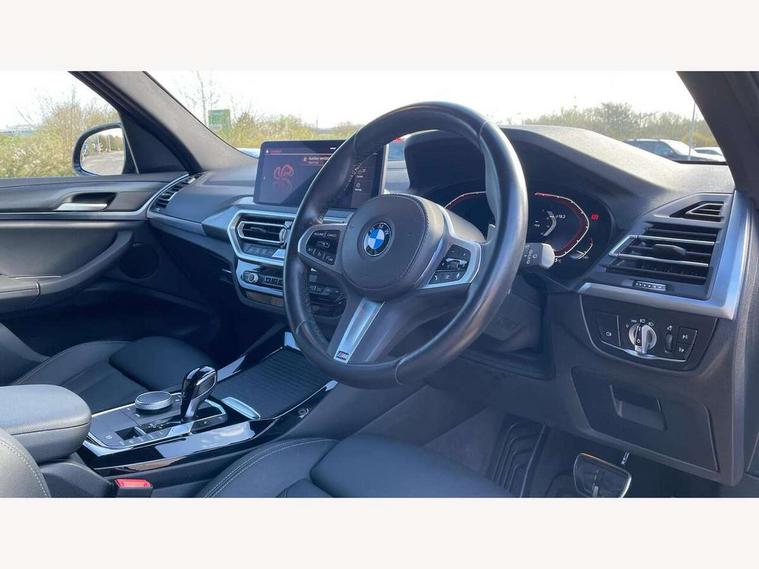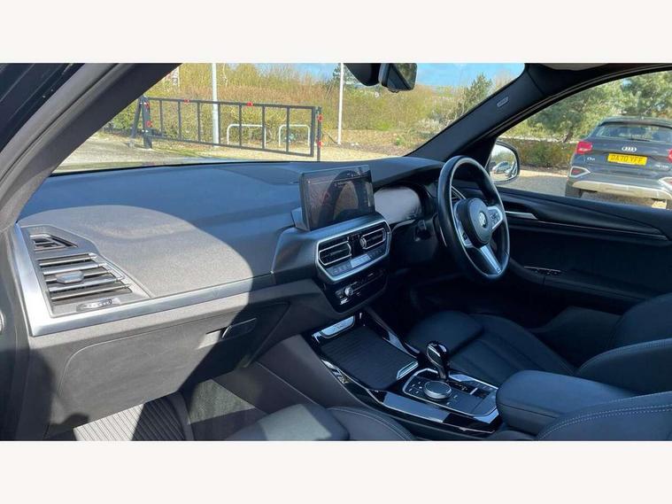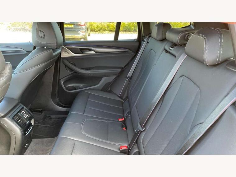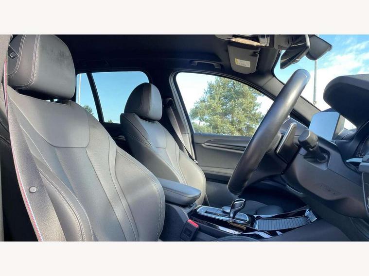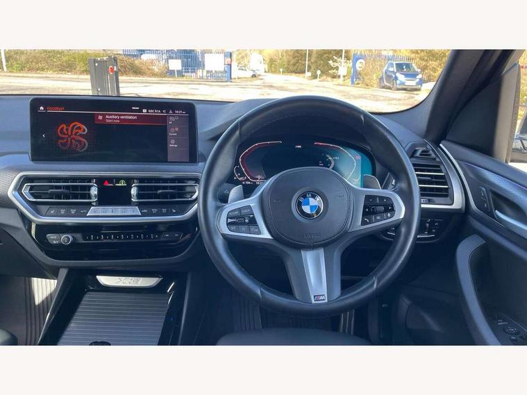 Active Guard, Attentiveness assist, BMW Live Cockpit Professional nav system including 12.3" instrument display + 12.3 high resolution control display, BMW Online services, BMW Teleservices, Brake pad wear indicator in front and rear, Check Control warning system for monitoring of lights and door/luggage compartment open warning, Condition based service - BMW service history, electronic service booklet, integrated owner's handbook, Connected drive services, Electric boot lid, Front/rear Parking distance control, iDrive touch controller with 8 favourite buttons, Instrument cluster with speedometer with mph readout, tachometer, fuel gauge and oil temperature gauge, Lights on warning by audio warning signal when ignition is switched off, Oil sensor for level and grade, warning by check control system, On board computer - average speed+fuel consumption, service interval, clock/date, odometer/trip meter, outside temperature display and ice warning, Optimum shift indicator, Personal Profile - automatic lock when driving away selectable, Run flat indicator, Stop/start system, Variable sports power steering with drive performance control Sport+ mode, Automatic transmission with gearshift paddles, Incorrect fuelling protection, M sport suspension, Multi-link rear suspension, BMW professional radio/CD/MP3, DAB tuner, Acoustic glazing, Automatic windscreen wipers and automatic headlight, Black finish on B pillars, Body colour door handles, Body colour electric adjust heated aspherical door mirrors, Body colour roof mouldings, Body coloured bumpers, Direction indicator, side repeaters, integrated in exterior mirrors, Dynamic brake lights, Exhaust tailpipes - dual, round, split left and right with chrome finisher, Fingertip control / anti-trap function on electric window, Folding wing mirrors with auto dimming, Follow me home headlights, Front and rear bumper system with replaceable deformation elements, Front and rear electric windows, Gloss chrome tailpipes finishers, Green tinted heat insulating glass, Heated windscreen washer jets, High beam assistant, High gloss black shadow line roof rails, High gloss shadowline exterior trim in decorative moulding side frame/recess cover/guide rail/B, C pillars/mirror frame and triangle with mirror base, High level 3rd brake light incorporating LED Technology, Interior rear view electrochromatic mirror with automatic anti dazzle function, LED tail lights, Lightweight engineering, M aerodynamic bodystyling, M Sport entry door sill strips, Model designation, Rain sensor, Rear side wing doors, Rear wing door, Rear wiper, Shark fin antenna, Side exterior M designation badges, Visible VIN plate, Welcome lighting, Windscreen wipers with adjustable interval, 12V power point in luggage area, 12V power socket in front centre console, 2 x USB Type C ports for charging and data transmission (front centre console) and 2 x USB Type C ports for charging (rear centre console), 3 rear headrests, 3 seat bench in 2nd row, 3 zone automatic air conditioning, 4 lashing points to secure luggage, 40:20:40 split folding rear seat with loading system, Ambient lighting, Anthracite headlining, Automatic interior light when door is opened/ignition switched off or via remote key, Floor mats in velour, Foldable storage floor with compartment, Four grab handles integrated in roof lining, Front and rear bottle holders integrated into door trim storage compartments, Front and rear side armrests integrated into door trim, Front centre armrest with storage compartment, Front footwell lights, Front head restraints, Front passenger seat, Front sports seats, Front/rear courtesy lights with soft on/off dimming, Front/rear reading lights, Heated front seats, Isofix rear child seat preparation, Leather gear knob, Lockable glove compartment, Luggage area underfloor compartment, Luggage compartment lighting, M sport leather steering wheel, Multifunction steering wheel, Parcel shelf removeable and storable under boot floor, Reach and rake adjustable steering column, Rear centre armrest with 2 cupholders, Removable / retractable luggage cover, Slope adjustable rear seats, Storage compartment in rear centre console and front/rear door trims, Sun visors with vanity mirrors and ticket pocket, Toolkit located in luggage compartment, Two front cupholders with removable oddments tray/lid, Connected pro pack - X3, ADB - Automatic Differential Brake, Anti-lock braking system (ABS) with brake assist, Automatic Stability Control (ASC), Battery safety cut-off, BMW emergency call, Brake drying, Brake energy regeneration, Braking pre-tensioning, Child locks on rear doors, Cornering brake control (CBC), Crash Sensor - activation of central locking release, hazard warning light and interior lighting, Deactivation of fuel pump in the event of a crash, Driver and front passenger front and side airbags with passenger deactivation and ITS front and rear head airbags, Driver and front passenger knee airbag, DSC+, Dynamic brake control, Dynamic Traction Control - DTC, Electromechanical parking brake, Hill descent control, Hill start assist, Seatbelt security check for front seats, Side impact protection, Three point seatbelts to all seats with front and outer rear pyrotechnic belt tensioners and seat belt force limiters, Two tone horn, Tyre pressure sensor, Ventilated front and rear disc brakes, Warning triangle and first aid kit, Central locking switch for all doors, fuel filler cap and luggage compartment, Electronic engine immobiliser, Locking wheel nuts, Remote control including two integrated key - one button for open/close all lockable content, windows and separate button for open luggage compartment, Remote control Thatcham category 1 alarm, Start/stop button with Comfort Go keyless engine start and auto Start/stop deactivation button, Low rolling resistance tyres,