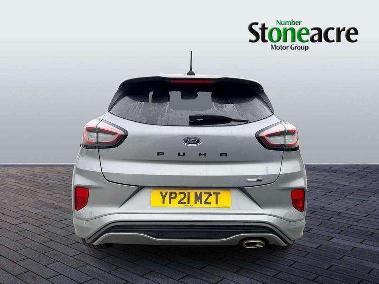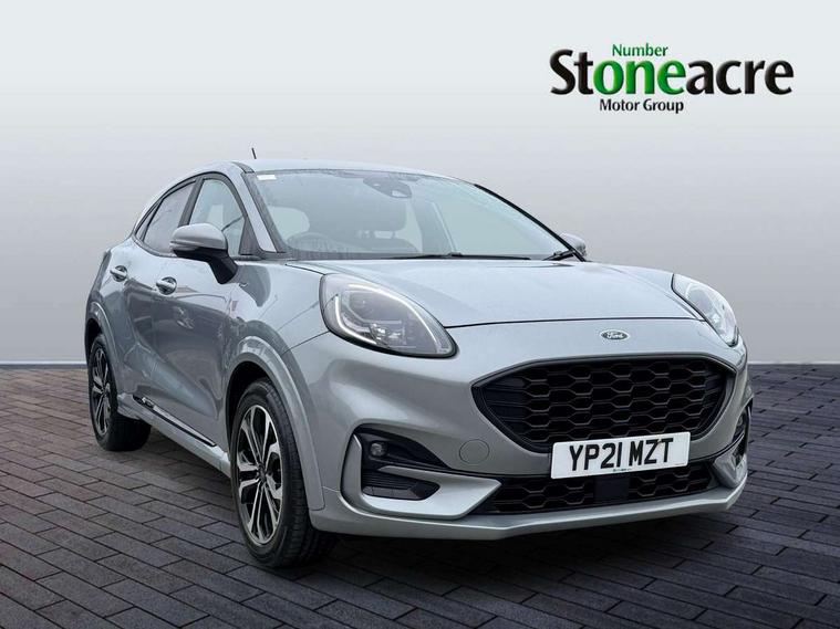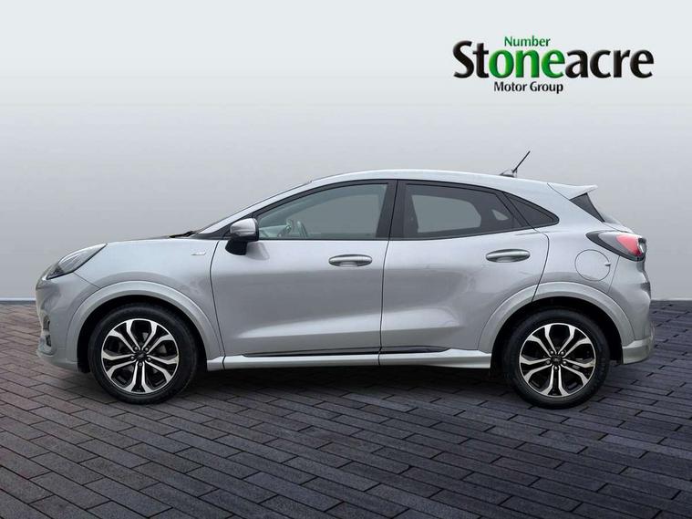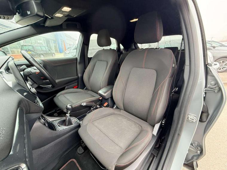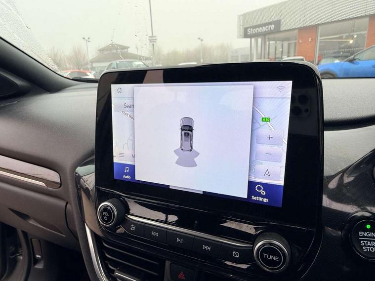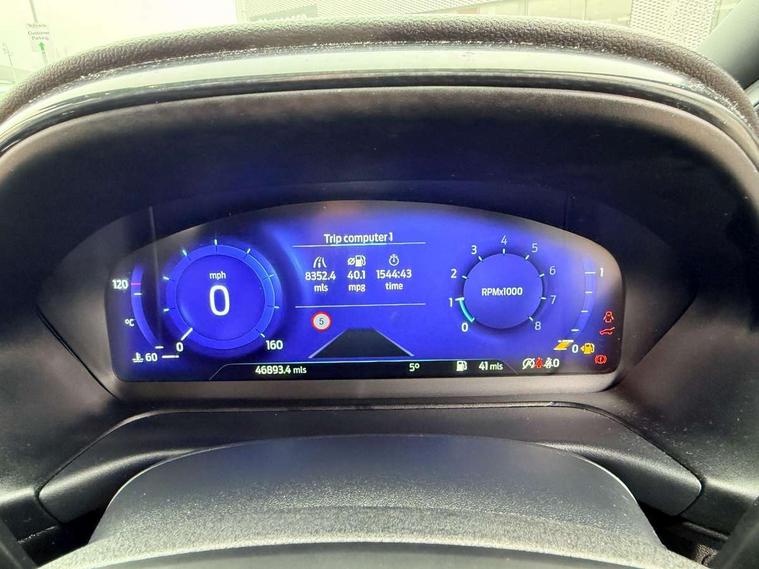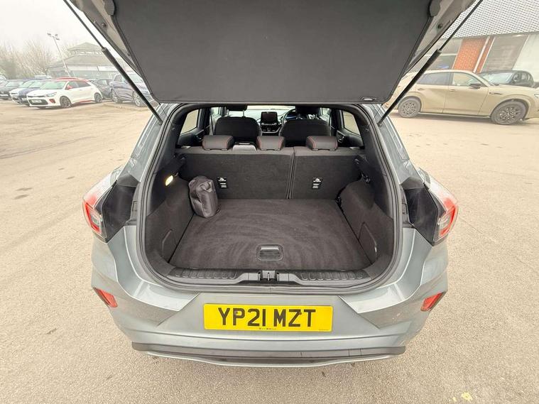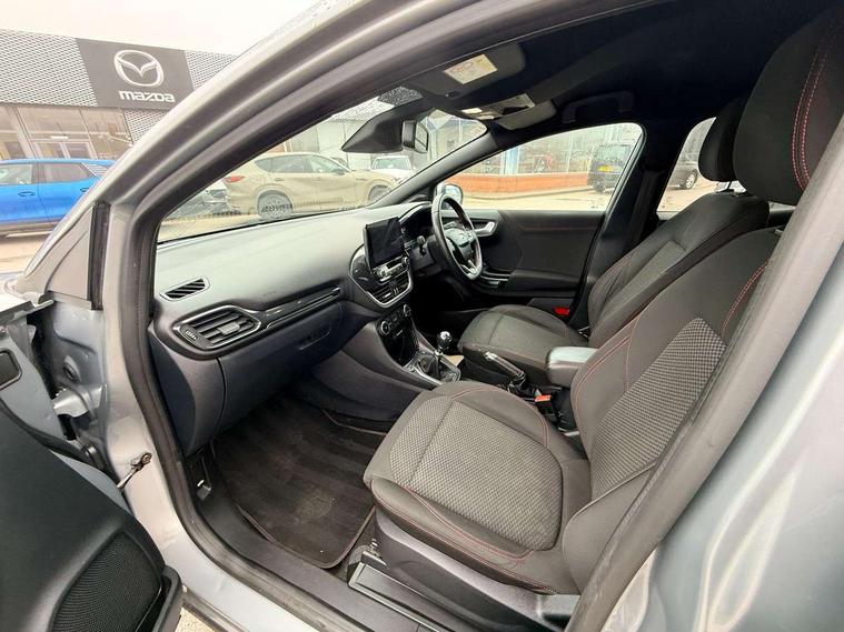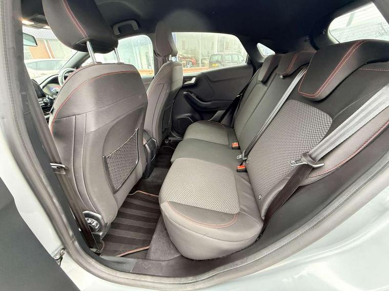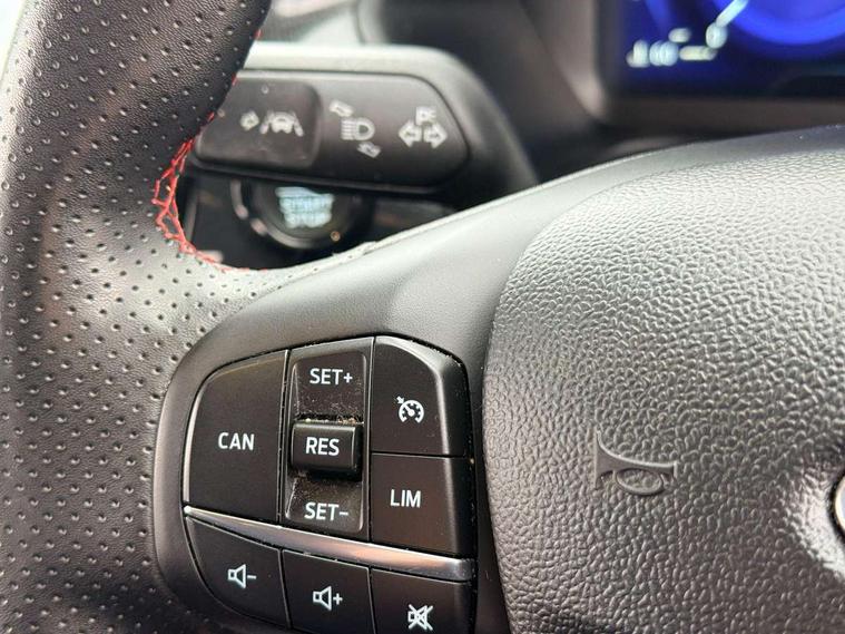 Ford easy fuel, Full digital 12.3" instrument cluster, Lane keeping aid with lane departure warning, Power assist steering, Power start button, Rear parking sensor, Selectable drive modes(Normal, Eco, Sport, Slippery and Trail), Automatic headlights with rain sensing wipers and auto high beam, Body coloured door mirrors, Front fog lights with cornering lights and LED rear lamps, Power foldable heated door mirrors with puddle lamps, Projector headlamps with LED day time running lights, Quickclear heated windscreen, Rear wiper, ST-Line body kit with large rear spoiler wth sports suspension, Centre console with armrest and stowage, Cloth upholstery, Driver seat height/lumbar adjust, Ford megabox extended bootspace, Front and rear floor mats, Front and rear head restraints, Manual air conditioning, ST-Line flat bottomed sensico leather steering wheel with leather handbrake and aluminium gear knob, Ford SYNC 3 navigation pack - Puma, 3 rear seatbelts, Electronic stability control (ESC) and hill start assist, Pre-collision assist with autonomous emergency braking, pedestrian/cyclist detection & post-collision braking, Tyre pressure monitoring system (TPMS), Thatcham alarm,