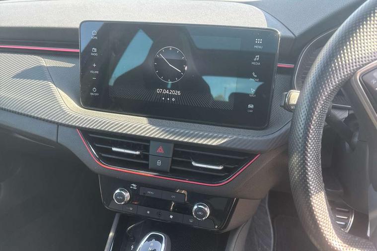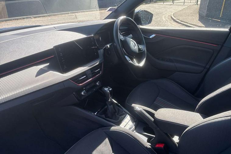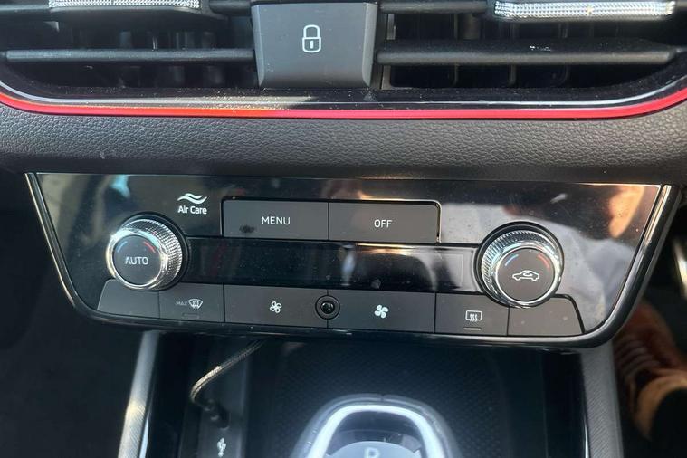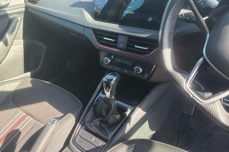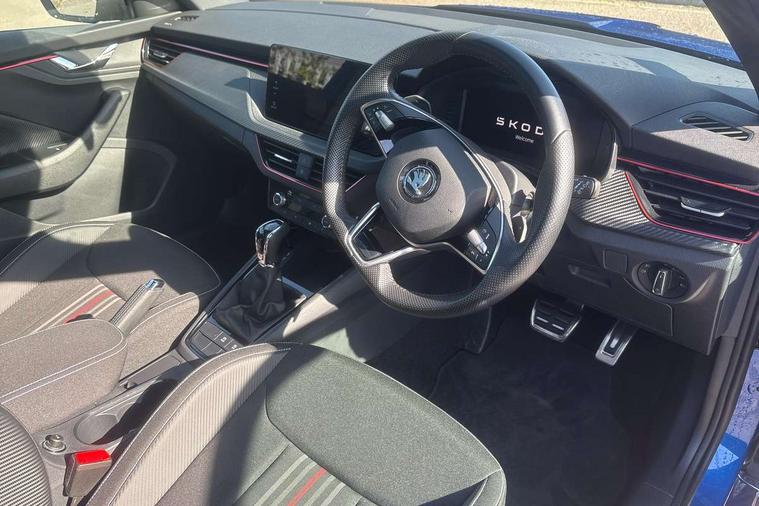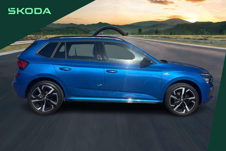 Advanced driver attention and drowsiness monitor, Bluetooth system, E-call, Front assist system, PAS, Rear parking sensors, Service indicator, Speed limiter, Traffic sign recognition, Virtual cockpit with 10.25" display, Voice control system, Wireless smartlink, 4 USB C ports, 8 speakers, 9.2" Skoda navigation display, DAB Digital radio, Auto dimming rear view mirror, Automatic headlight control with coming home and leaving home feature, Automatic headlights, Black door mirrors, Black radiator grille, Black rear diffuser, Black roof spoiler, Body colour bumpers, Body colour door handles, Boot lettering in black, Extended tailgate glass, Front and rear electric windows, Heated rear window, LED daytime running lights, LED high beam, LED low beam, LED third brake light, Monte carlo plaque, Panoramic sunroof with black roof rails, Privacy glass, Rear side wing doors, Rear wiper, Ticket holder inside windscreen, 12V socket in luggage compartment, 3 seat bench in 2nd row, Aluminium pedals, Ambient lighting in white/red, Art leather carbon decor inserts, Art leather carbon door inserts, Black roof lining, Cargo elements, Chrome inner door handles, Driver and passenger sun visors with vanity mirror, Dual zone climate control, Front and rear roof lights, Front centre armrest, Front head restraints, Glove compartment with illumination, Height adjustable driver seat, Height adjustable front passenger seat, Ice scraper, Inner circulation control with pollen filter, ISOFIX on front passenger seat, Isofix preparation for back seats, Leather gearknob and handbrake lever, Manual lumbar support for front seats, Monte Carlo cloth upholstery, Net package and top tether hooks in boot space, Net under rear shelf, Pocket on the back of both front seats include mobile phone pockets, Rake/reach adjustable steering wheel, Reading lights, Rear centre armrests, Red hotstamping, Single front passenger seat, Sports seats, Textile floor mats, Third rear headrest, Top tether for front passenger seat, Umbrella in driver's door, Light and view plus package - Kamiq, 3x3 point rear seatbelts, Airbags - driver and front passenger, Disc brakes, ESP, Extended and predictive pedestrian/cyclist protection, Front passenger airbag deactivation switch, Front side airbags with curtain airbags, Hill hold control, Manual leather parking brake, Manual rear child locks, One tone horn, Seatbelt reminder for driver an co-driver, Traction control, Tyre pressure monitor, Anti-theft alarm system with interior monitoring, backup horn, towing protection and remote central locking with SAFE system, Anti-theft wheel bolts, Electronic engine immobilizer, 18" Ursa black diamond cut alloy wheels,
