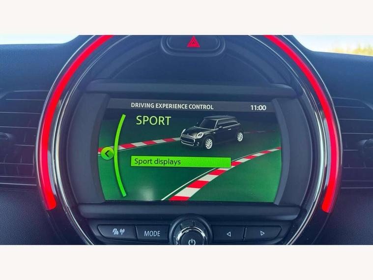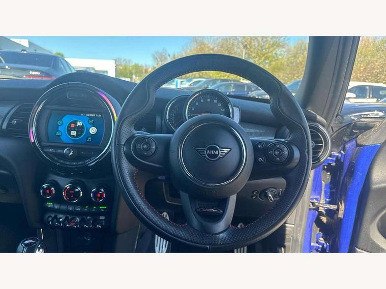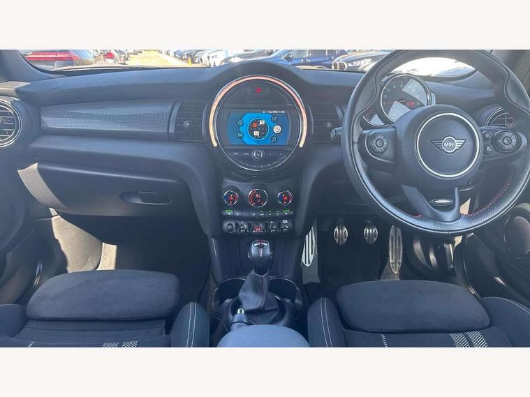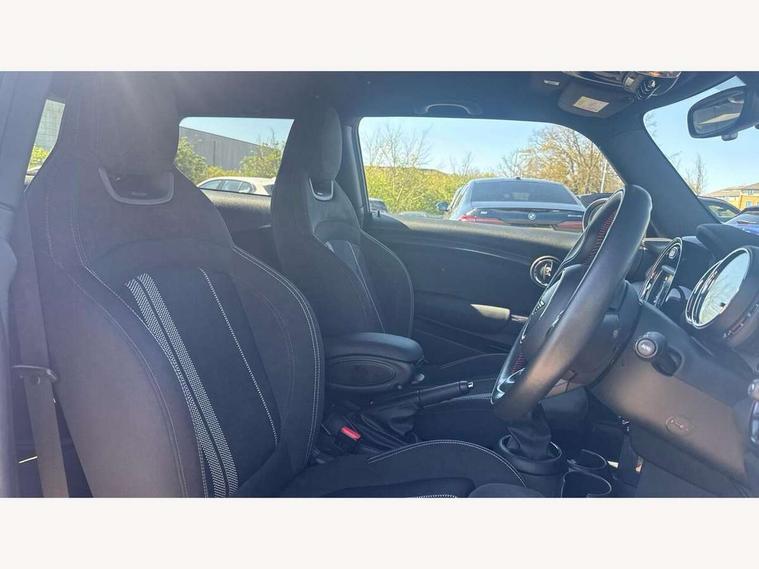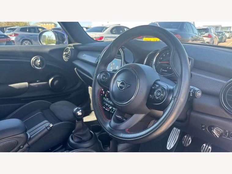 Automatic start/stop function with brake energy recuperation, Compatible mobile phone bluetooth with audio streaming, Electro-mechanical speed dependant steering assistance, Instrument cluster, Mini E-call, MINI TeleServices, On board computer, Service interval indicator, Double Vanos system, Fully variable valve control, High precision injection, Performance Control, 6.5" touchscreen with LED ring, FM tuner and DAB digital radio, Automatic headlight activation switch, Body colour fuel filler cap, Chrome border high gloss black slats radiator grille, Dynamic brake lights, Electric front+rear windows, Heated rear window, Heated windscreen washer jets, John Cooper Works - aerodynamic kit (front and rear apron, spoiler), front and rear sport bumpers and part-painted side sills with door sill finishers, John Cooper Works rear spoiler, LED headlight with closed ring and daytime driving lights, Left exhaust tailpipe with chrome finisher, Metal door sill strips with MINI imprint, Model logo Cooper on right of tailgate, Rain sensor window wipers, Rear fog lights, Rear LED lights with union jack design, Rear window wiper, Side scuttle panel with integrated indicator, Sun/heat protection glass, White indicator lenses, 12V Accessory socket in centre console, 4 lashing eyes in luggage compartment, 60/40 split folding rear seat, Anthracite headlining, Chrome interior highlights, Cupholders, Front and rear head restraints, Front and rear isofix with front passenger airbag deactivation, Glove compartment, Height and length steering column adjustment, Interior lighting with 12 basic colours selectable via toggle switch in roof, John Cooper Works leather steering wheel with contrasting stitching in Chilli Red with John Cooper Works logo, John Cooper Works Logo in seat, Leather gearshift lever and handbrake gaiters, LED reading lights, vanity mirror lights, front foot well light and spotlight on front seats, Manual air conditioning, Mechanical seat adjustment, driver seat height adjust, forward/back and front seats backrest, Mini logo projection on floor from drivers exterior mirror, Multifunction steering wheel, Storage compartments in doors, Sunvisors with vanity mirrors, 3 point seatbelts on all four seats, 6 Airbags - front, side, head and seat belt tensioners, Anti-lock braking system (ABS), DSC - Dynamic Stability Control, Front and rear disc brakes, Hill start assist, Single tone fanfare horn, Tyre pressure monitoring system, Alarm system with tilt sensor, monitoring doors, bonnet interior and tailgate, Electronic vehicle immobiliser, Start/stop toggle with keyless go, Tool kit,