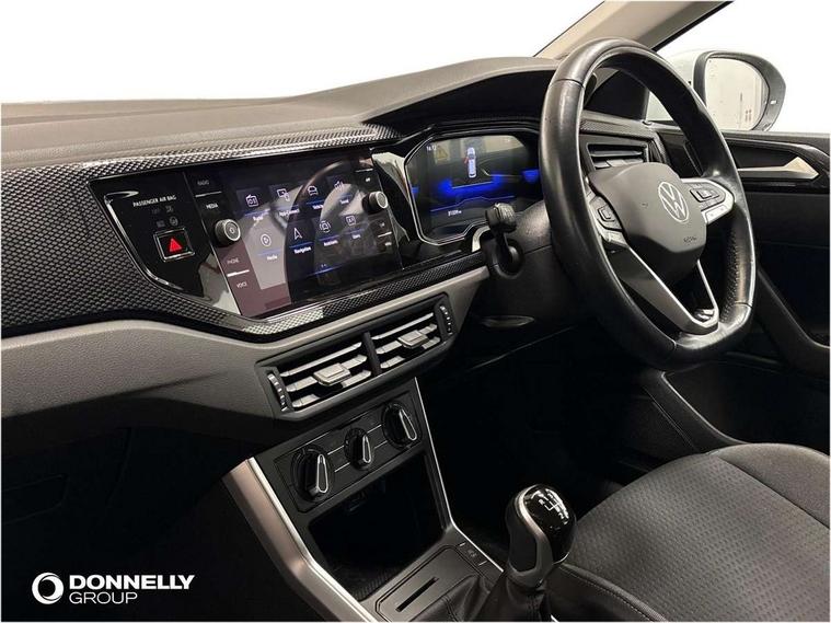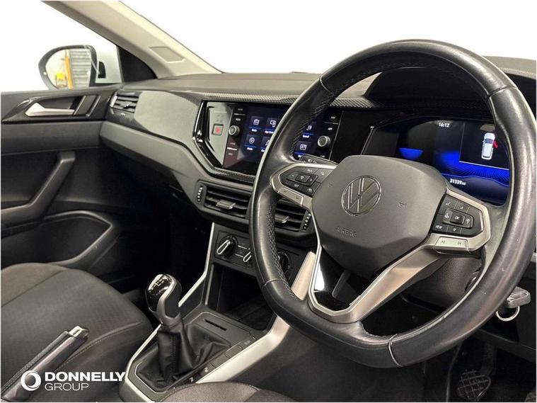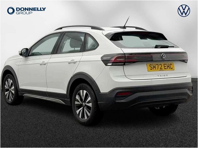 Driver alert system, e-Call (emergency call), Power Steering, Travel assist including emergency assist, Washer fluid level indicator, Wireless Charging including Bluetooth, Start-stop system with battery regeneration (recuperation - energy recovery during braking), WeConnect plus, Ambient lighting with logo projection, Aspherical driver's exterior mirror, Auto headlights, Body coloured bumpers, Body coloured exterior mirror housings and door handles, Electric windows, External USB type C socket and charging sockets, Front fog lamps with cornering function, Headlight range control, Heat insulating glass windscreen, LED headlamps, LED rear combination lamp, LED third brake light, Left convex exterior mirror, Power folding adjustable/heated exterior mirrors and front passenger exterior mirror lowering function, Rear fog light on one side, reversing light on both sides, Rear side wing doors, Rear wash/wipe with intermittent wipe setting, 'Slash/ Austin' Cloth upholstery, 12V socket in centre console, 2 front reading lights, 3 rear head restraints, 3 seat bench in 2nd row, Black carpets, Child seat anchor for child seat system i-Size, 2x top tether and child seat anchor in front on front passenger side, Door and side trim panels in titan black, Driver and front passenger seat height adjustment, Front centre armrest, Handbrake lever handle in leather, Height and reach adjustable steering wheel, Leather trimmed gear knob, Leather wrapped multifunction steering wheel, Luggage compartment floor, Luggage compartment light, Lumbar support for driver's and front passengers seat, Seat covers in titanium black, Single front passenger seat, Split folding backrest with centre armrest and unsplit rear seat bench, Storage compartment under front seats, Sun visors with illuminated vanity mirrors, Chrome Package - Taigo, Drivers assistance pack - Taigo, Light and Sight pack including High beam assist - Taigo, 2 x 3-point seatbelts/outer rear seats with ECE label, 3-point seat belts in front with pretensioner and height adjustment, 3-point seatbelt for centre rear seat, Driver and front passenger airbags with front passenger airbag de-activation, front side and curtain airbags, Driver and front passenger safety-optimised head restraints, Electronic stability control, Extended and predictive pedestrian/ cyclist protection, Front and rear disc brakes, Front curtain and side airbags with center airbag, Hill start assist, Manual rear child locks, Single tone horn, Tyre pressure loss indicator, Anti-theft alarm system with interior monitoring, backup horn, and towing protection, Anti-theft wheel bolts, Lava stone black gloss/matt decorative inserts in dash and front door panels, Low rolling resistance tyres,