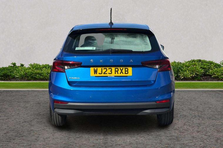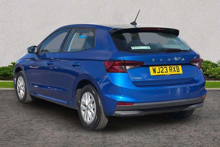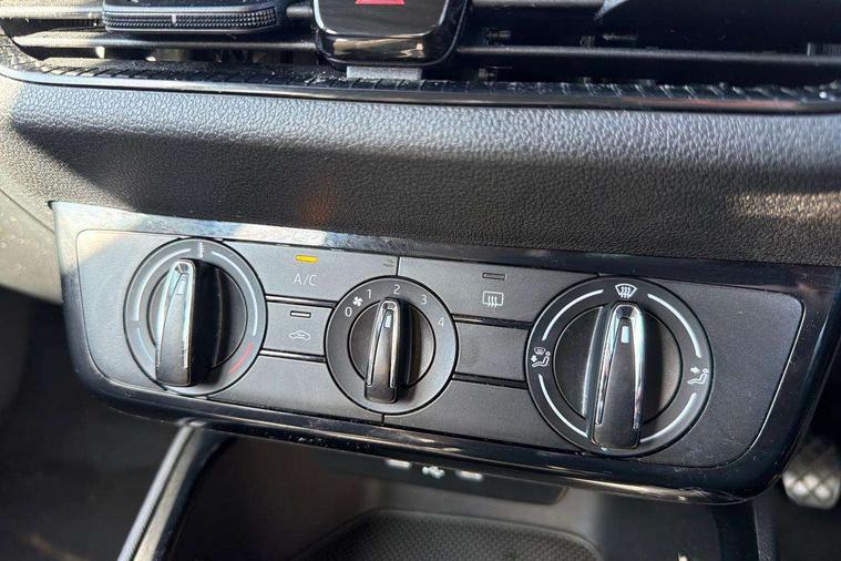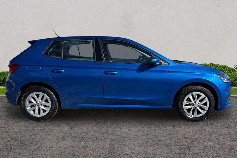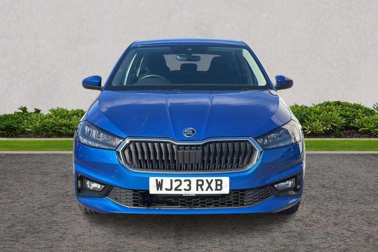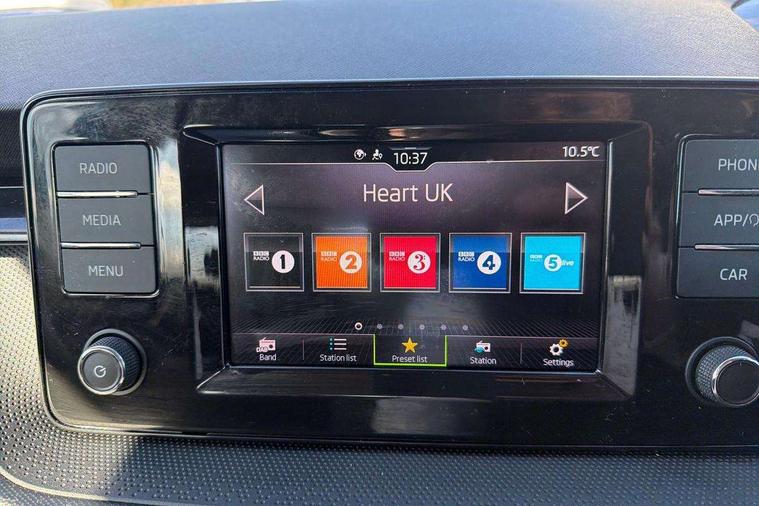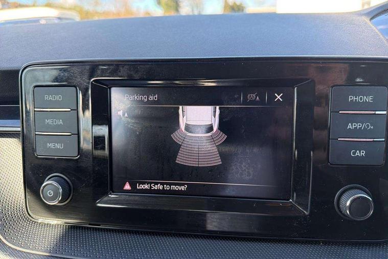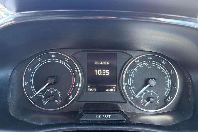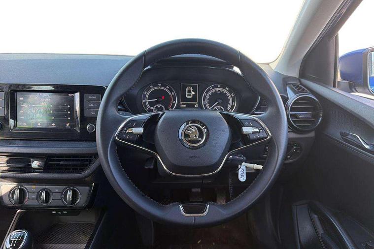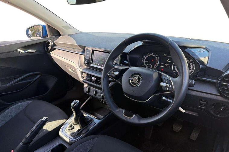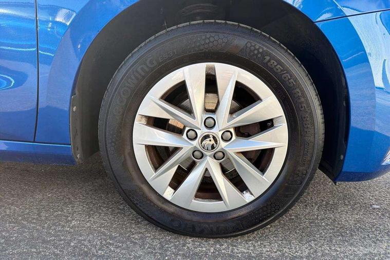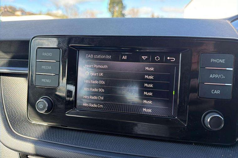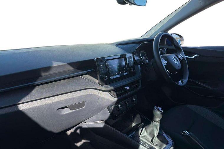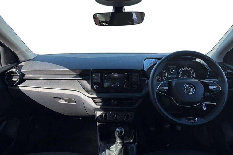Bluetooth connection, Driver alert system - DAS, Electromechanical power steering, Exterior temperature gauge, Lane assist including road edge detection, Multifunction trip computer in black and white, Service interval indicator, Speed limiter, 2x USB-C in the front (for data transmission and charging), 4 speakers in front, Auxiliary socket for external MP3 player, DAB digital radio reception, Radio Swing with 6.5" colour display, Basic LED Headlights, Basic rear lights, Body colour door mirrors, Body coloured bumpers, Dimming rear view mirror with black frame, Door mirror integrated indicators, Electrically adjustable and heated door mirrors, Electrically adjustable front windows with function auto up/down, Front fog lights, Front window wiper intermittent control, Headlight range control - Automatic, Ice scraper in fuel cap, LED daytime running lights with coming and leaving home feature, Mechanical adjustable rear windows, Rain sensor, Rear LED fog light, Rear side wing doors, Rear window wiper with washing nozzles, Roof mounted spoiler, SKODA tailgate lettering in chrome, Third brake light, 2 reading lights in front and 2 reading lights in rear, 2 spoke leather multifunction steering wheel, 3 rear headrests, Backrest split and folding, Central console with fixed cup holder and storage box, Chrome handbrake release button, Fabric upholstery, Gearshift knob/handle in leather, Grain satin black interior door handles, Hand brake lever handle in leather, Height adjustable front headrests, Height adjustable front seats, Height adjustable steering wheel, ISOFIX and TopTether anchorage points to the outer rear seats, ISOFIX and TopTether on the front passenger seat, Luggage compartment lighting, Manual air conditioning, Manually adjustable lumbar support in front seats, Pollen filter, Rear seat bench unsplit, Single front passenger seat, Storm grey headlining, Sun visors with mirror and airbag label on passenger side, Ticket holder, 3-point height adjustable front seats belts with pretensioner and force limiter, Automatic warning lights in case of crash, Driver and passengers airbag with switch off function, e-Call+, ESC including ABS, MSR, ASR, EDS, HBA and XDS, Front and rear seat belt warning, FRONT ASSIST (AEB City and AEB Inter Urban), Front side airbags, Head airbags, One tone horn, Pedestrian protection, Three rear 3-points safety seat belts with pretensioner and force limiter including stop function for outer rear seat belts, Tyre pressure monitoring system, Anti-theft alarm system including immobiliser, interior monitoring, backup horn, and towing protection, Central locking with radio remote control, interior controls, SAFE function and 2 foldable keys, Black painted air vents, Glossy black decorative trim, Grain satin black central console cover, Grain satin black lower decorative trim, Satin black door and side trim panel in front, Anti-theft wheel bolts protection, Super-low rolling resistance tyres,
