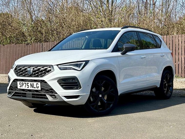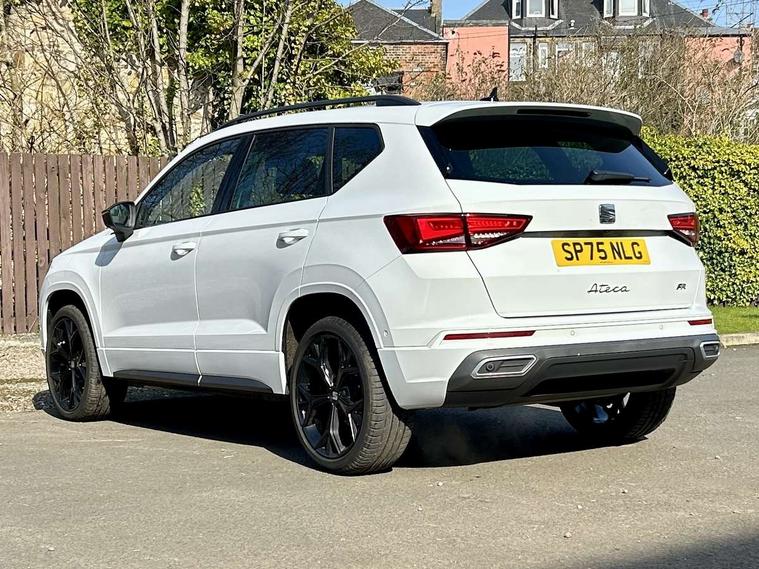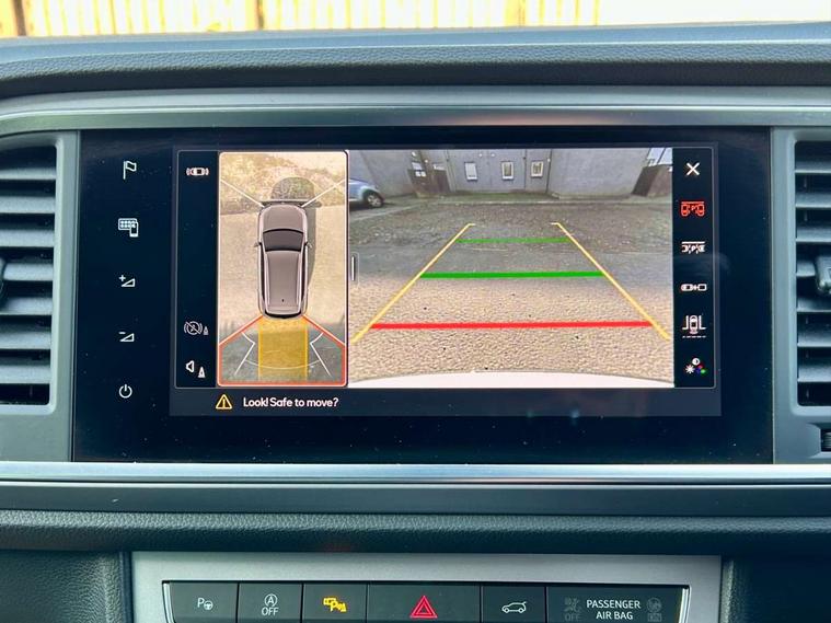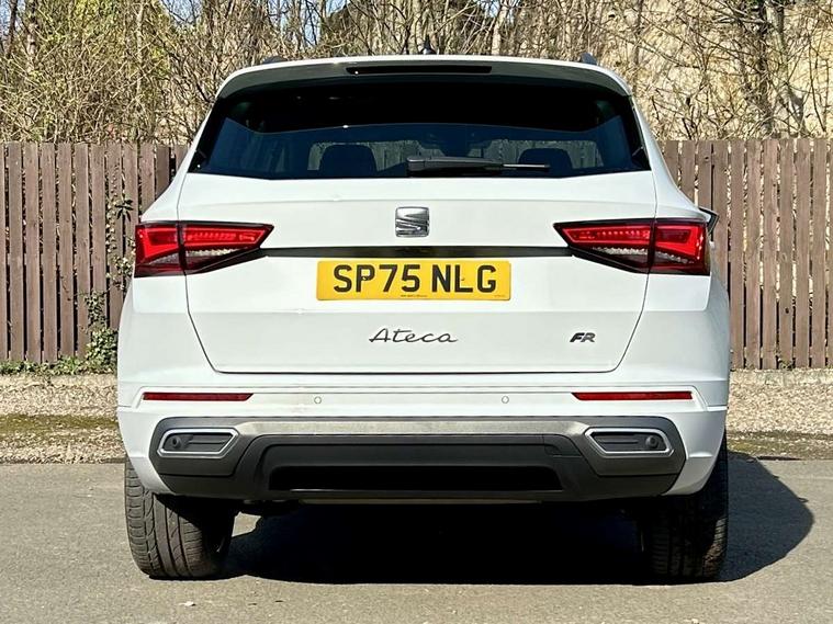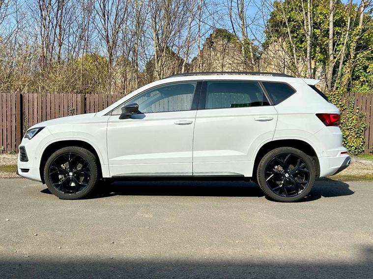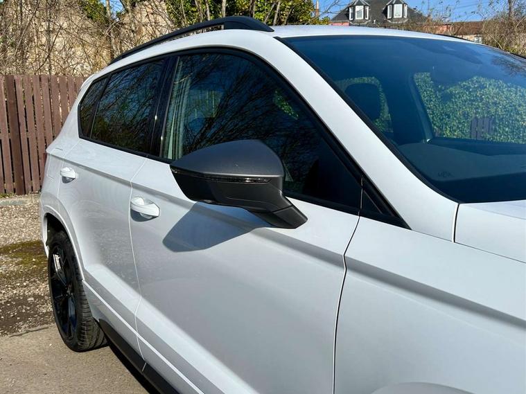 10" Digital cockpit, Bluetooth audio streaming with handsfree system, E-call, Electric tailgate with virtual pedal, Outside temperature gauge, Progressive power assisted steering, SEAT drive profile with driving experience button - Normal, Sport, Eco and Individual mode, gearshift, steering and throttle response, Self parking functionality (includes front and rear parking sensors), Speed limiter, Start/stop system, Top view camera with rear view camera, Trip computer, wired and wireless full link smartphone integration, Wireless phone charger, Steering wheel mounted audio/phone controls, Black roof rails, Black side window trim, Body colour bumpers, Body coloured wheel arch surrounds, Chrome front grille frame, Dark tinted rear windows, Daytime running lights, Door mirrors with welcome light silhouette, Dynamic headlight range control with self adjusting whilst driving, Electric adjustable/heated/folding door mirrors, Front and rear electric windows, Illuminated aluminium front door sill, LED 3rd brake light, LED headlamps with lens and LED front fog lamps with cornering function, LED rear tail lights with dynamic indicators, Rear exhaust tailpipe, Rear fog lights, Rear side wing doors, Rear spoiler, Rear wash/wipe, Variable front intermittent wipers, 12V socket in front, 3 seat bench in 2nd row, 60/40 split folding rear seat, Aluminium pedals, Black greenhouse interior roof, Dual zone climate control, Electric adjustable driver seat with memory function, Front and rear head restraints, Front centre armrest, Front seat back storage pockets, Heated front seats, Height adjustable passenger seats with lumbar adjustment, ISOFIX points in outer rear seats with top tether anchorage points, Leather sports steering wheel and gear knob, Leather upholstery with front comfort seats, Rear armrest and easy back seat release mechanism from boot, Single front passenger seat, Steering wheel mounted gearshift paddles, Convenience pack - Ateca, Interior lighting pack - Ateca, Navigation system pack with DAB - Ateca, Safety and driving pack (L) - Ateca, Safety and driving pack with attention and drowsiness assist - Ateca, 3x3 point rear seatbelts, ABS, Traction control system (TCS), Electronic stability control (ESC) and Electronic differential lock system (XDS), Airbags - Driver and front passenger airbag with deactivation, front side, two curtain and driver's knee airbags, Electric parking brake with auto hold function, Front and rear seatbelt reminder, Hill hold control, Manual rear child locks, Single tone horn, Tyre pressure monitoring system, Alarm, Keyless entry, Locking wheel bolts, Remote central locking, Chrome interior detailing, 19" Exclusive alloy whelels 36/10 in glossy black, Tool kit,