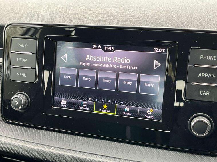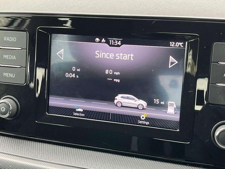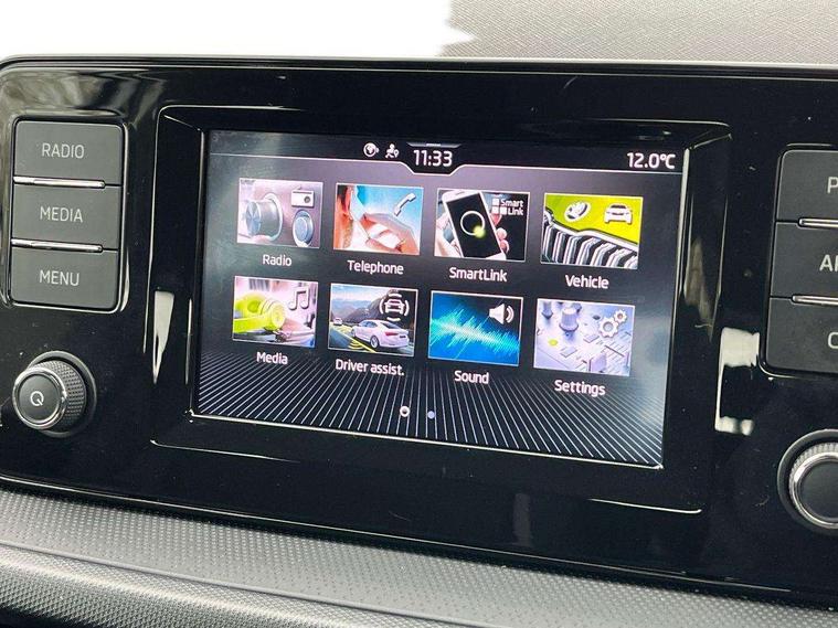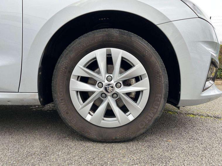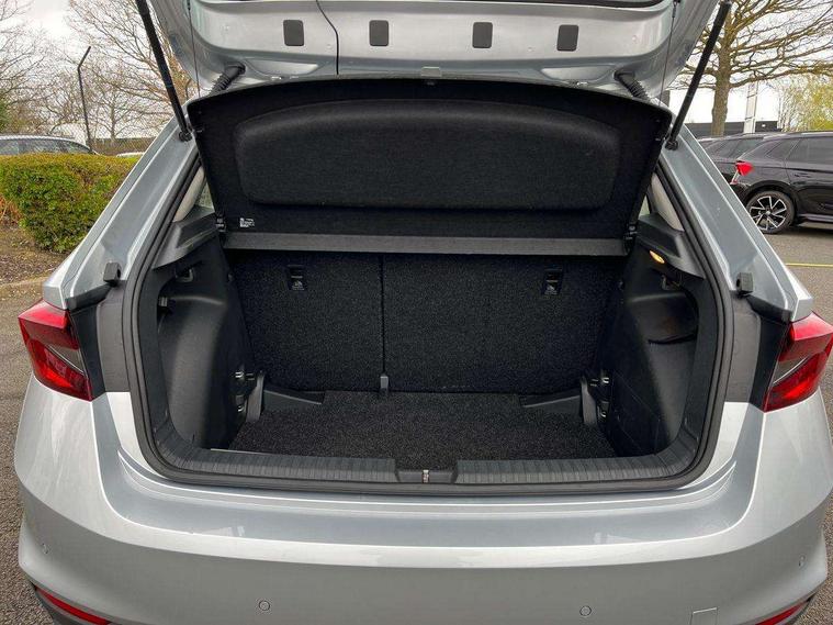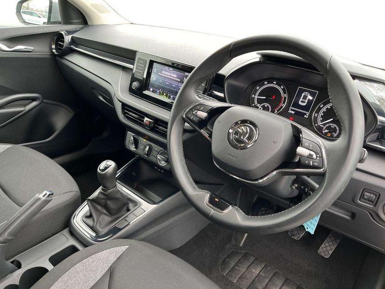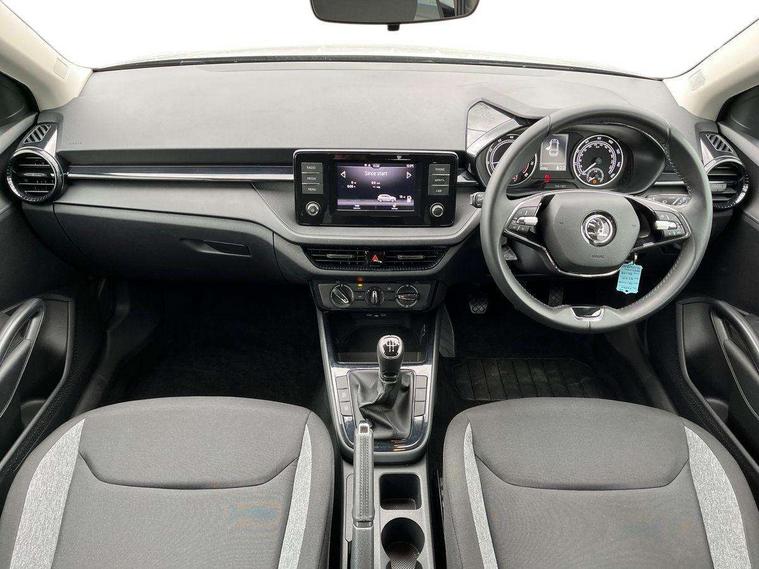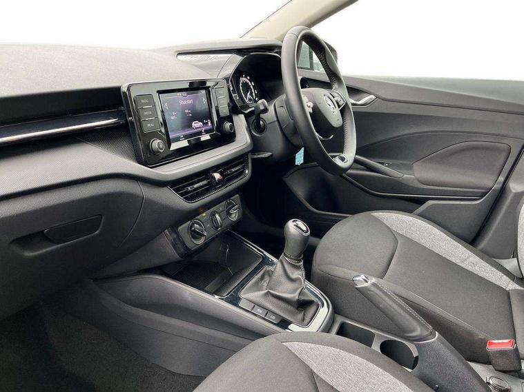 Bluetooth connection, Driver alert system - DAS, Electromechanical power steering, Exterior temperature gauge, Lane assist including road edge detection, Multifunction trip computer in black and white, Service interval indicator, Speed limiter, 2x USB-C in the front (for data transmission and charging), 4 speakers in front, Auxiliary socket for external MP3 player, DAB digital radio reception, Radio Swing with 6.5" colour display, Basic LED Headlights, Basic rear lights, Body colour door mirrors, Body coloured bumpers, Dimming rear view mirror with black frame, Door mirror integrated indicators, Electrically adjustable and heated door mirrors, Electrically adjustable front windows with function auto up/down, Front fog lights, Front window wiper intermittent control, Headlight range control - Automatic, Ice scraper in fuel cap, LED daytime running lights with coming and leaving home feature, Mechanical adjustable rear windows, Rain sensor, Rear LED fog light, Rear side wing doors, Rear window wiper with washing nozzles, Roof mounted spoiler, SKODA tailgate lettering in chrome, Third brake light, 2 reading lights in front and 2 reading lights in rear, 2 spoke leather multifunction steering wheel, 3 rear headrests, Backrest split and folding, Central console with fixed cup holder and storage box, Chrome handbrake release button, Fabric upholstery, Gearshift knob/handle in leather, Grain satin black interior door handles, Hand brake lever handle in leather, Height adjustable front headrests, Height adjustable front seats, Height adjustable steering wheel, ISOFIX and TopTether anchorage points to the outer rear seats, ISOFIX and TopTether on the front passenger seat, Luggage compartment lighting, Manual air conditioning, Manually adjustable lumbar support in front seats, Pollen filter, Rear seat bench unsplit, Single front passenger seat, Storm grey headlining, Sun visors with mirror and airbag label on passenger side, Ticket holder, 3-point height adjustable front seats belts with pretensioner and force limiter, Automatic warning lights in case of crash, Driver and passengers airbag with switch off function, e-Call+, ESC including ABS, MSR, ASR, EDS, HBA and XDS, Front and rear seat belt warning, FRONT ASSIST (AEB City and AEB Inter Urban), Front side airbags, Head airbags, One tone horn, Pedestrian protection, Three rear 3-points safety seat belts with pretensioner and force limiter including stop function for outer rear seat belts, Tyre pressure monitoring system, Anti-theft alarm system including immobiliser, interior monitoring, backup horn, and towing protection, Central locking with radio remote control, interior controls, SAFE function and 2 foldable keys, Black painted air vents, Glossy black decorative trim, Grain satin black central console cover, Grain satin black lower decorative trim, Satin black door and side trim panel in front, Anti-theft wheel bolts protection, Super-low rolling resistance tyres,
