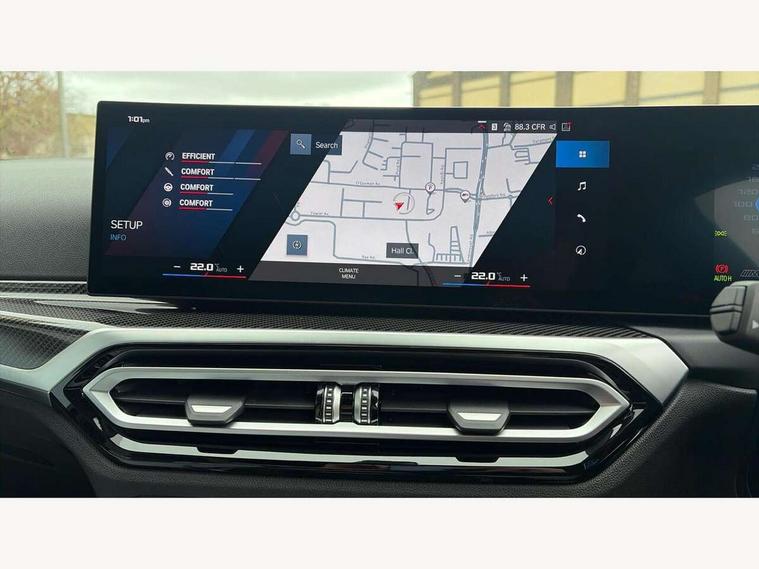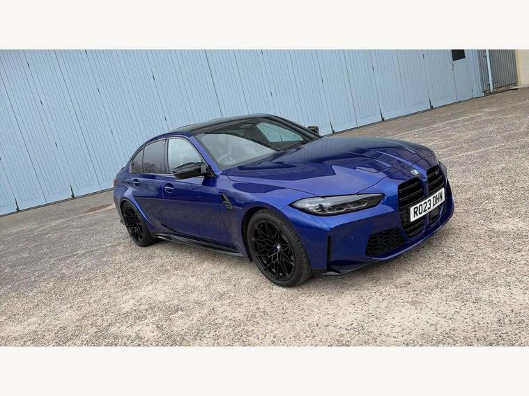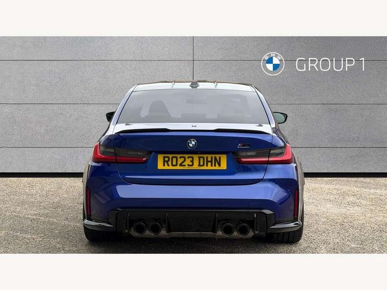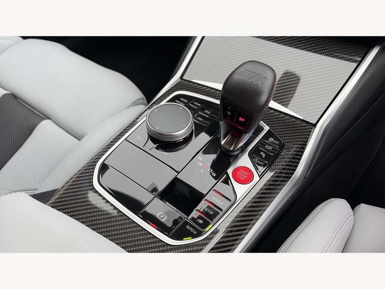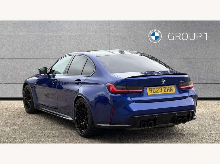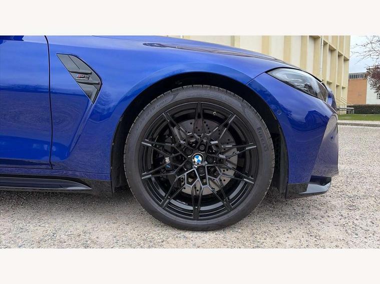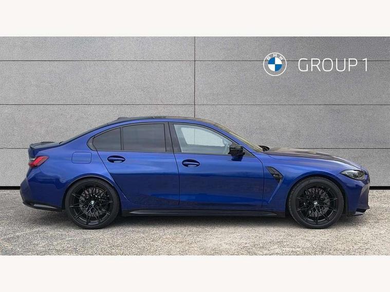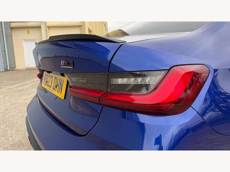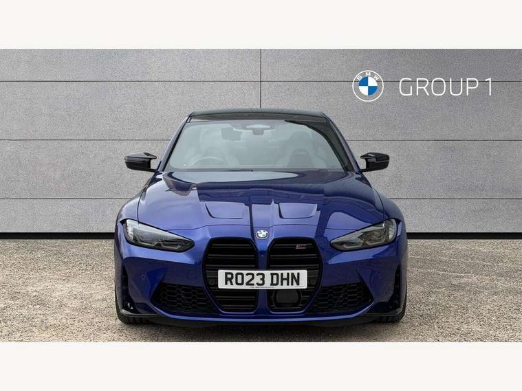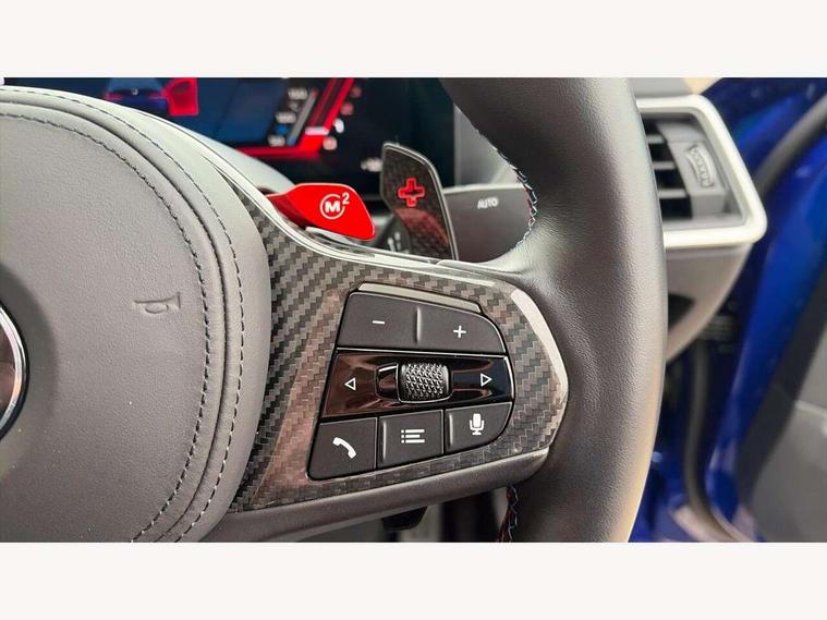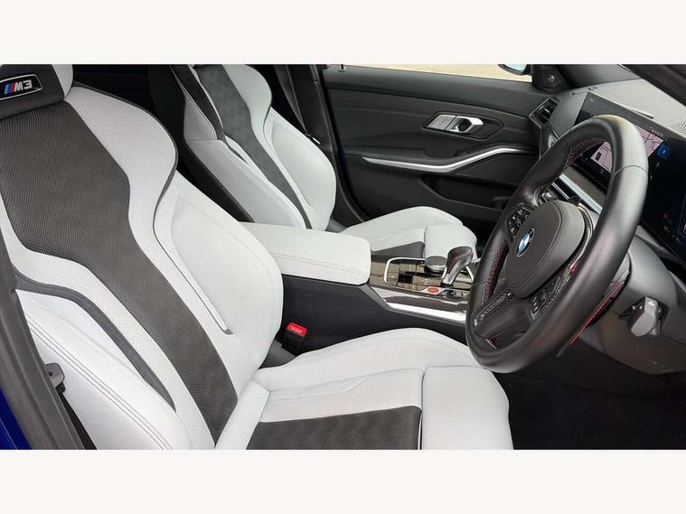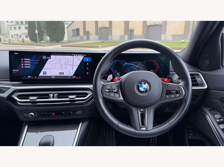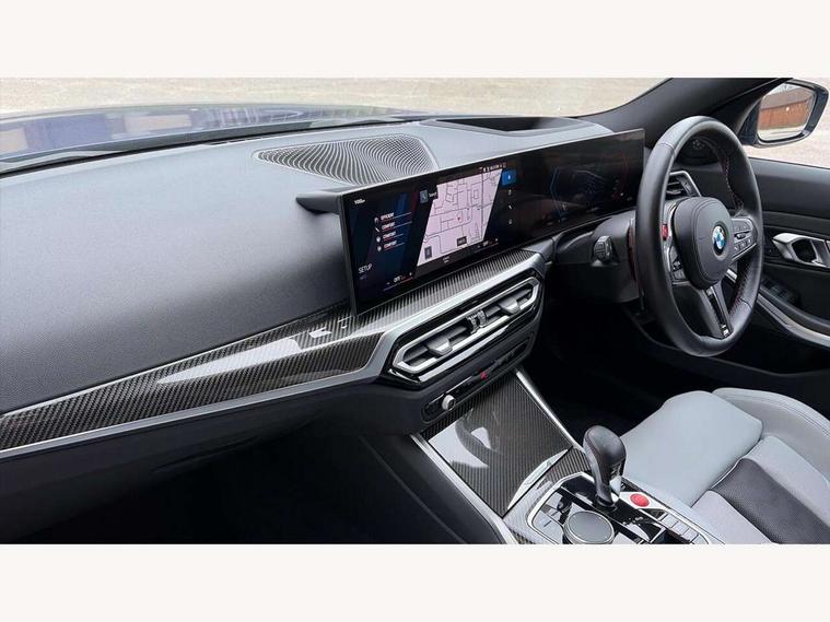 Active guard plus, Automatic start/stop system, Bluetooth functionality with Apple CarPlay/Android Auto, BMW ConnectedDrive online services, BMW iDrive controller on centre console, BMW legal emergency call, BMW Live Cockpit Professional sat nav system with 12.3" instrument display and high resolution control display, BMW Online services, BMW Teleservices, Brake pad wear indicator warning light, Condition based service, Door/boot open warning light, Driving experience switch, Illuminated control elements, Instrument cluster with extended contents, Lights on warning, M drive buttons, Oil sensor for level and grade, warning by check control system, Oil temperature gauge, On board computer, On board diagnostics, Optimum shift indicator, Outside temperature display, Pull away assistant, Run flat indicator, Service interval indicator, Shifting point display, Speed limiter, Variable sport steering, Widescreen display, Adaptive M Sport suspension, Double joint spring strut front axle, Electronic differential lock control (EDLC), M Drive Professional including track mode, laptimer, traction control & Drift analyser, M Sport differential, M steptronic sport transmission with drivelogic, Safety battery terminal clamp, 8 programmable favourite buttons, Auxiliary point for auxiliary devices, BMW professional radio/CD/MP3, DAB Digital radio, Harman/Kardon loudspeaker system, 3rd brake light, Acoustic glazing, Auto dimming driver's door mirror, Auto dimming rear view mirror, Automatic headlights + automatic windscreen wipers, Automatic parking function on front passenger's exterior mirror, Black chrome exhaust tailpipes, Black model designation badges, BMW emblem on engine compartment lid and tailgate, BMW high gloss shadow line with extended contents, BMW Individual shadowline lights, Body colour bumpers, Carbon fibre reinforced plastic (CFRP) roof with high gloss black roof aerial bulge and roof mouldings, Day time running light, Door mirror integrated indicators, Door sill finishers with aluminium inserts, Dynamic brake lights, Electric adjustable heated door mirrors, Electric folding door mirrors, Electric front and rear windows with one touch/convenient open/close function, Follow me home headlights, Front and rear apron plastic in body colour, Front and rear bumper system, Headlight beam throw control, Heat protection, sun protection glazing, Heated rear window with automatic switch off, Heated washer jets, High beam assistant, High gloss black frameless kidney grille with M badge, High gloss black lower bumper edges, side sills and diffuser edge binding, Illuminated bow type door handles in body colour drivers side with door lock, LED number plate light, LED tail lights with 3D L-shaped LED light design, M designation, M Sport entry door sill strips, Mirror glass aspheric on driver's side, convex on passenger side, Rear boot, Rear fog lights, Rear reflectors, Rear right M3 competition inscription, Rear side wing doors, Reversing light, Shark fin roof aerial, Strakes in front side panel, black matt/black high-gloss, with model badge, Visible VIN plate, Welcome lighting, 2 front cupholder in centre console with clamping elements and matt black inlay, 2 x 12 V Power sockets (luggage compartment and front centre console), 2 x USB Type C ports for charging and data transmission in front centre console, 3 folding rear headrests, 3 seat bench in 2nd row, Ambient inside door handle light, Ambient lighting for instrument panel, Ambient lighting for storage compartment, Ambient lighting front and rear, Ambient lighting in door panels, Anthracite headlining, Battery in luggage compartment, Carbon fibre centre console incl. cover for cupholders and storage compartment, Carbon fibre decorative steering wheel finishers, Carbon fibre shift paddles, Carbon fibre strip in instrument panel on front passenger side, Centre console armrest with storage compartment, Compartment in front of cupholder, Driver/passenger sunvisors with illuminated vanity mirrors + covers, Dynamic ambient interior lighting, Electric front seats + driver memory, English handbook, Floor mats in velour, Folding rear centre armrest with 2 cupholders, Footwell lighting, Front and rear door exit lights, Front door storage bins with bottle holder, Front interior light, Front isofix attachment + airbag deactivation, Front seat backrest width adjustment, Front seats lumbar support, Front/rear door armrests, Gearshift lever with embossed M badge, Heated front seats, Height adjustable front headrests, Interior mirror lighting, Isofix on 2nd row outer seats, Lockable/illuminated glovebox, Luggage compartment lighting, Manual 40:20:40 split folding rear seat with two tilt positions for backrest, Multifunction steering wheel, Rake/reach adjustable steering wheel, Single front passenger seat, Storage compartment in rear doors, Three zone automatic air conditioning, Through loading system, Toolkit located in luggage compartment, Wireless charging tray, Additional storage compartment pack - M3, Connected package professional - M3, High gloss shadowline exterior trim pack - M3, 3 point seatbelts on all seats, ABS/EBD, Automatic Stability Control (ASC), Brake energy regeneration, Brake fade compensation, Compound structure brake discs, Cornering brake control (CBC), Crash sensor, Driver/Front Passenger airbags, Dry braking, Dynamic brake control, Dynamic Stability Control with M Dynamic mode, Dynamic Traction Control - DTC, Electromechanical parking brake, Front and rear head airbags, Front seat side impact airbags, Front seatbelt pretensioners + load limiters, Hill start assist, M Sport seat belts, Rear child proof door locks, Seat occupancy detection for driver and passenger side, Seatbelt warning, Side impact protection, Two tone horn, Tyre pressure sensor, Warning triangle and first aid kit, Centre lock switch, Closing system with central locking, Digital key, Electronic immobiliser, Thatcham cat 1 remote alarm, Vehicle Key with 4 buttons including the