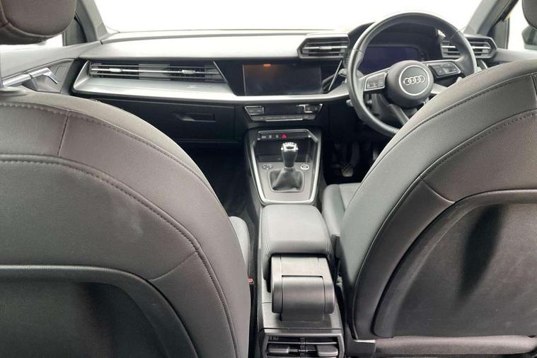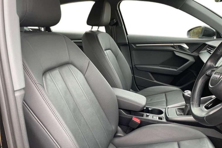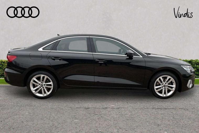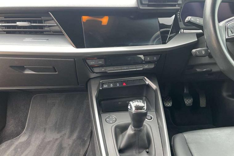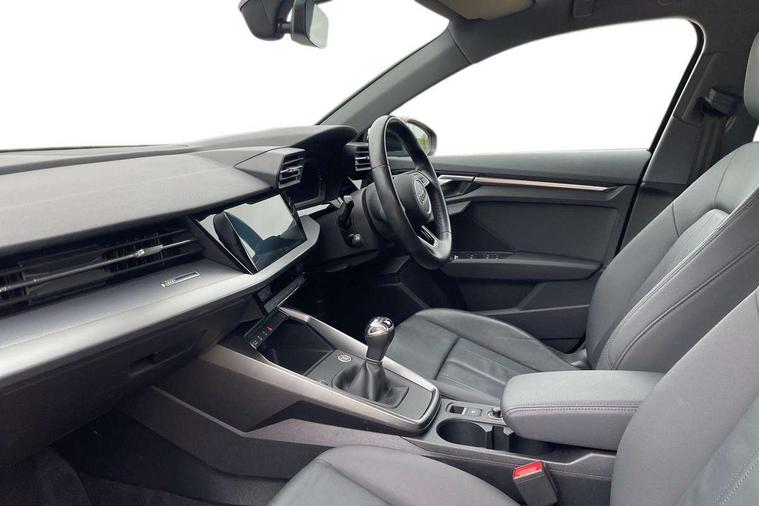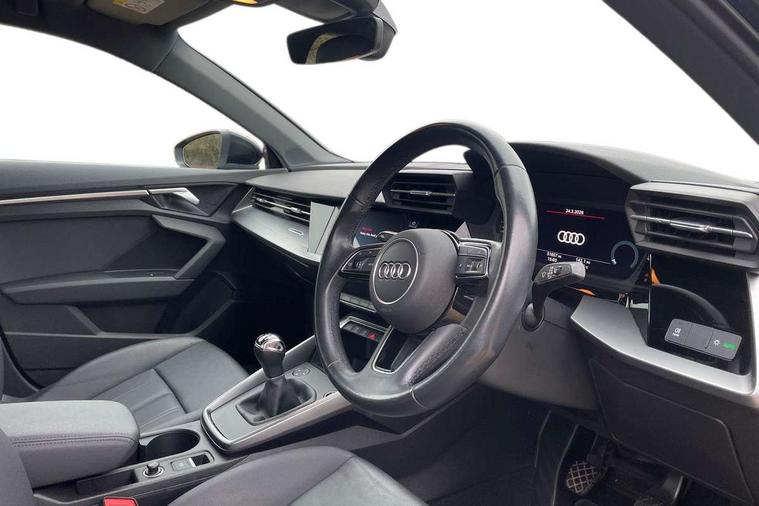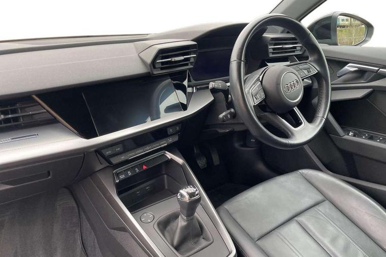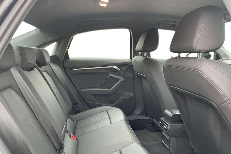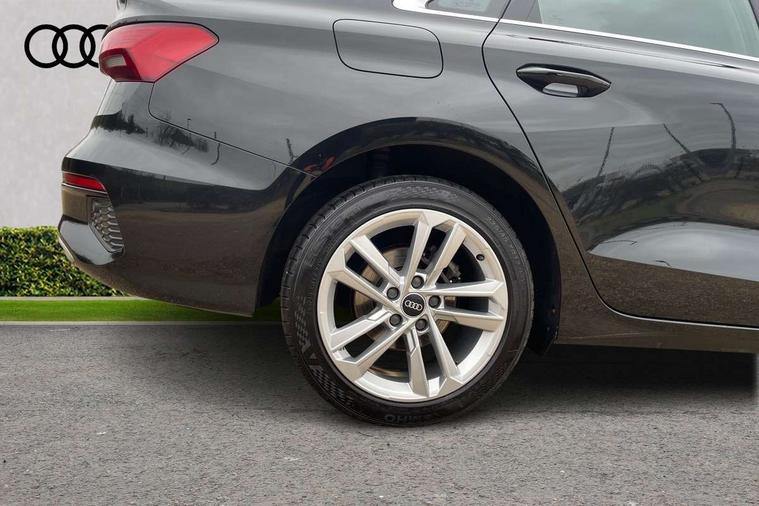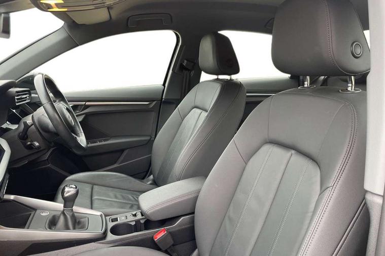 Audi connect emergency call and service, Audi drive select (Auto, Comfort, Dynamic and Individual), Audi smartphone interface, Audi Virtual Cockpit - 10.25" digital and colour instrument cluster, Automatic start/stop system with recuperation, Bluetooth interface, Collision avoidance assistant, Cruise control + speed limiter, Electromechanical power speed sensitive steering, Lane departure warning system, MMI Navigation Plus with high resolution 10.1" colour touch screen display, Rear parking sensors, Service indicator, Voice control system with natural language interaction, Standard suspension, 2x USB Type C ports (for charging and data transfer), 6 passive loudspeakers, CD player, DAB Digital radio, Acoustic glass windscreen, Aluminium window trim, Auto dimming frameless rear view mirror, Body colour exterior mirrors, Body colour roof spoiler, Electrically adjustable/heated/folding/dimming door mirrors with kerb view includes integrated LED indications + kerb view function for passenger side, Front electric windows, LED daytime running lights, Light and rain sensors, Model and engine designation badges at rear, Rear electric windows, Rear window, rear door windows and rear side windows in clear glass, 12V socket and storage compartment in front centre console, 40/20/40 split folding rear seat bench with cupholder, Dual zone electronic climate control, Front and rear headrests, Front centre armrest, Front door sill trims with aluminium inlay, Front/rear floor mats, Height and reach adjustable steering wheel, Interior lighting - Front and rear roof module including reading lights, glove compartment light and right hand side, Luggage compartment floor covering, Manual boot compartment lid, Manually adjustable front seats, Seat side bolsters, Steel grey cloth headlining, Twin leather upholstery, Aluminium interior elements pack - A3 Saloon, Sport styling pack - A3 Saloon, 3x3 point rear seat belts, Driver and front passenger airbag with passenger airbag deactivation, Electronic Stabilisation Control (ESC) including ABS, ASR and EDL, First aid kit with warning triangle and 2 safety vests, Front side airbags with head airbags and interaction airbag, Hill hold assist, Pre-sense front with pedestrian and cyclist detection, Seatbelt monitoring, Tyre pressure loss indicator, Anti theft alarm, Anti-theft wheel bolts, Electronically operated child lock, Immobiliser, Remote control central locking, Aluminium air vent surrounds, Aluminium trim elements, Inlays with silk effect paint in platinum grey,