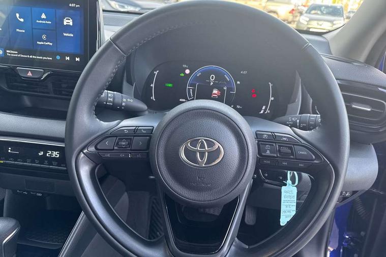 7" Digital Combimeter, Adaptive cruise control, Adjustable speed limit with speed warning, Bluetooth connectivity, Colour binocular inspired displays with digital speedometer, E-call, Electric power steering, Hybrid energy display, Multi information display switches on steering wheel, Reversing camera, Smartphone integration with Apple CarPlay and Android auto, Tailgate, Voice recognition, Vehicle Stability Control (VSC), 4 speakers, 9" Multimedia touch display, Toyota Touch 3 system with DAB radio, USB connection, Acoustic windscreen glass, Auto windscreen wipers, Automatic headlights, Body coloured door mirrors, Electric adjustable heated door mirrors, Follow me home headlights, Front auto power windows with anti jam protection, Full LED rear lights, LED daytime running lights, LED front fog lights, LED front light guide, LED Headlights, LED High mounted stop lamp, LED Indicators, LED rear light guide, Manual headlight levelling, Painted chequered front grille, Rain sensor, Rear auto power windows with anti jam protection, Rear privacy glass, Rear side wing doors, Rear spoiler, Rear wiper, Shark fin antenna, Turning signal integrated indicators in door mirrors, Variable front intermittent wipers, 3 adjustable rear headrests, 3 seat bench in 2nd row, 3 spoke leather steering wheel, 60/40 split folding rear seat, Active headrests, Adjustable boot height, Auto air conditioning, Coat hooks in rear grab handles, Cup holders (2 front & door), Data Communication Module (DCM) connected services, Fabric upholstery, Front armrest, Glovebox, Grey roof lining, Height adjustable driver's seat, Isofix seat fixing, Leather gearshift, Pollen filter, Shopping bag hooks, Single front passenger seat, Tilt/telescopic steering column, 3 point seatbelts on all rear seats, ABS+EBD+Brake assist, Electronic parking brake, Emergency brake light system (EBS), Front passenger airbag on/off switch, Front seatbelt reminder, Hill start assist control (HAC), Rear child proof door locks, Rear seat belt reminder, Supplemental Restraint System (SRS) 8 airbags: Driver & passenger's airbags, dual side curtain airbags, side impact airbags, front centre airbag, Toyota Safety Sense 3 with over the air updates, Tyre pressure warning system, 2x Master key, Alarm/immobiliser, Remote powered central double locking doors, Soft touch instrument panel, Space saver spare wheel,