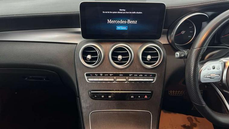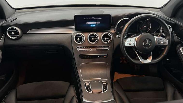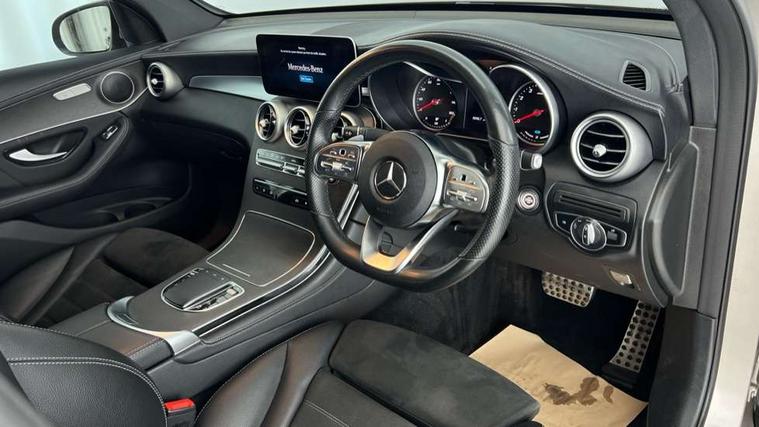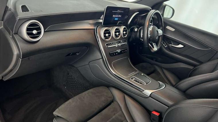 Attention assist, Bluetooth interface for hands free telephone, Collision prevention assist plus, Cruise control with speedtronic variable speed limiter, Direct steer speed sensitive steering, DYNAMIC SELECT with a choice of driving modes (ECO, Comfort, Sport, Sport+ and Individual), Easy pack automatic powered tailgate, ECO start/stop function, Hard disk navigation, Hey Mercedes Voice activation, Instrument cluster with 5.5-inch TFT multi-function display, MBUX Interior assistant, Mercedes connect me with remote online services, Multi function trip computer, Outside temperature display, rear seatbelt status indicator, Parktronic system with rear cross traffic alert and drive away assist, Remote boot release, Reversing camera, Service indicator (ASSYST), 4MATIC permanent four wheel drive, 66 litre fuel tank, 9G TRONIC plus automatic transmission with steering column gear selector, DIRECT SELECT steering wheel gearshift paddles, Petrol Particulate Filter (PPF), Sports suspension tuned for improved handling and driving dynamics, 5 speakers, Frontbass loudspeakers, MBUX multimedia system with DAB digital radio and touchpad including satellite navigation, Media display 10.25-inch touchscreen display, Pre installation for Mercedes Benz Link, USB ports x 2 in centre console, Adaptive brake lights, AMG bodystyling - AMG front apron with sporty air intakes and chrome trim element, AMG diffuser-look rear apron with insert in black, Body colour door mirrors, Body coloured bumpers, Electric windows one touch open/close, Electrically adjustable and heated door mirrors, Front, side and rear exterior chrome trim, Headlamp assist automatic headlamp activation, LED high performance headlamps with integrated LED daytime running lights, LED tail lamp, Privacy glass with dark glass from B pillar backwards, Radiator diamond grille, Rain sensor windscreen wipers, Range adjustable headlights, Rear wiper, Tinted glass all round with single layer safety glass, Two chrome plated tailpipe trim elements, 2 way rear head restraints, 3-spoke multifunction sport AMG steering wheel in black nappa leather with flattened bottom section, chrome insert and perforated leather in grip area, 40:20:40 split folding rear seats, AMG floor mats with edging and embroidered AMG lettering, AMG sports seats, Artico man-made leather upper dashboard with contrast topstitching, Automatic child seat recognition sensor, Black roof lining, Dividing net - rear, Double cup holder in centre console, Easy-pack removable load compartment cover, Front armrest with storage box, Front door sills with Mercedes Benz lettering, Front head restraints, Front seats with electric adjust (backrest, height and seat cushion inclination) with 4 way electric lumbar support and manual cushion depth adjust, Heated front seats, Height/reach adjustable steering column, Illuminated and lockable glove compartment, Leather upholstery, Rear top tether child seat ISOFIX attachment, Sports pedals with stainless steel surfaces and rubber studs, Steering wheel with touch control buttons, THERMOTRONIC 3 zone automatic climate control, Interior lighting pack - GLC, Mirror pack - GLC, Storage pack - GLC, 3 rear 3 point seatbelts, Active bonnet, Adaptive brake system with HOLD function and brake drying in the wet, ASR, Black seat belts, Brake calipers with Mercedes-Benz lettering + perforated brake discs, Child proof door locks, Dual-stage airbags - driver and front passenger, driver knee bag and window bags for driver, front passenger and rear passengers, Electronic parking brake, Electronic stability programme (ESP) with curve dynamic assist and cross wind assist, Front and rear seatbelt reminder, Front passenger seat occupancy sensor, Hill hold function, Tyre pressure monitoring system, Warning triangle and first aid kit, Alarm system/interior protection/immobiliser, Automatic door locking, KEYLESS-GO starting function, Remote central locking, Open pore black ash wood trim, 19" AMG 5 twin spoke alloy wheels painted tremolite grey with high sheen finish and tirefit,
