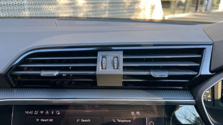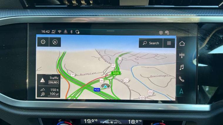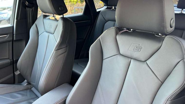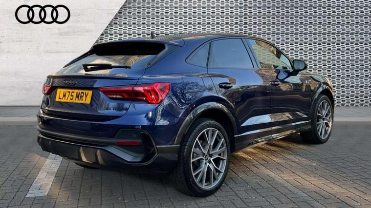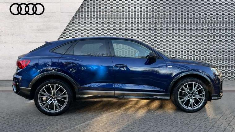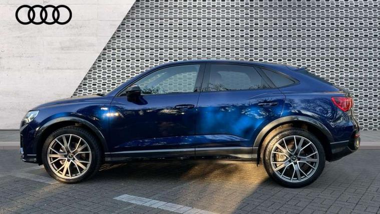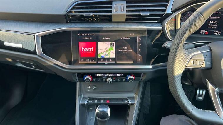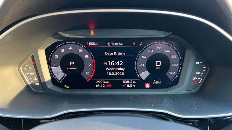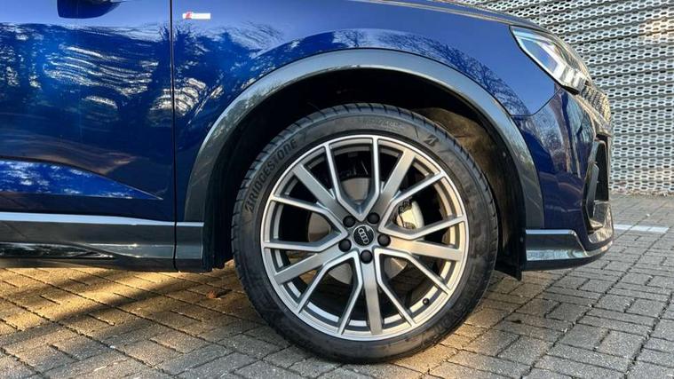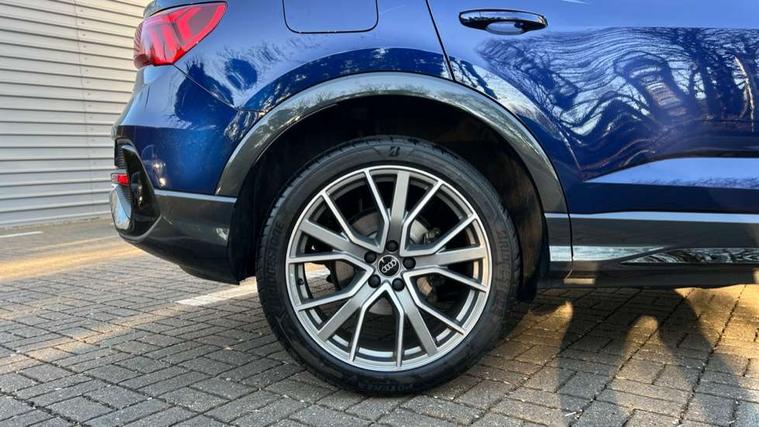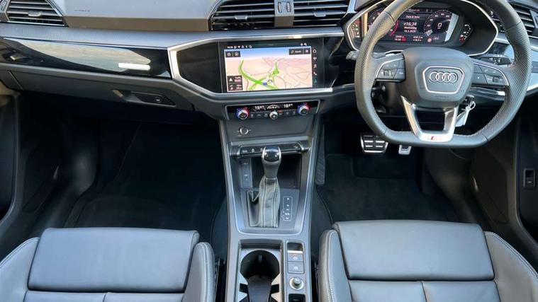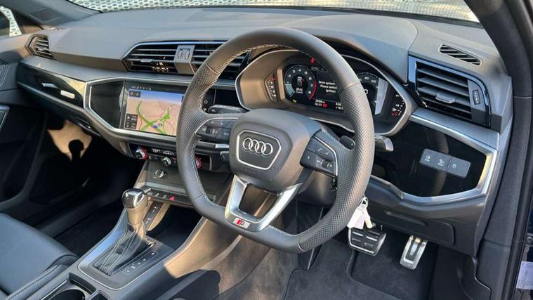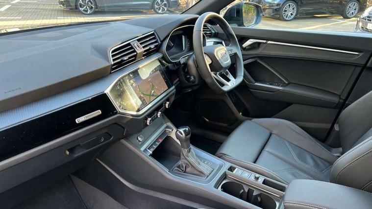 Audi connect safety and service, Audi drive select, Audi lane departure warning, Audi Virtual Cockpit - 10.25" display, Bluetooth interface, Camera based traffic sign recognition, Distraction and Fatigue warning, Legal emergency call, MMI Navigation Plus with high resolution 10.1 inch touchscreen colour display, Power operated tailgate, Progressive steering, Service interval indicator, Smartphone interface includes wireless Apple carplay/Android Auto, Start stop system with recuperation, Voice control system with natural language interaction, Sports suspension, 2 USB-C ports with charge and data functions, 6 passive loudspeakers, DAB digital radio module, Acoustic windscreen, Audi Beam uses LEDs to project the Audi logo onto the ground as you exit your Q3, Auto dimming door mirrors, Auto dimming frameless rear view mirror, Electrically folding, adjustable and heated door mirrors with integrated LED side indicators and kerb view function for passenger side, Front and rear electric windows, Front fog lights, Front underbody protection in manhattan grey paint finish, High gloss black finish B and C pillars, Honeycomb design radiator grille in matt anthracite black, LED Dynamic rear indicators, LED headlights with LED daytime running lights, LED rear lights, LED third brake light, Privacy glass dark tinted rear and rear-side windows (from B-pillar backwards), Rain and light sensors, Rear diffuser grille in grained matt black, Rear diffuser strip in matt anthracite black, Rear side wing doors, Rear underbody protection in matt black, Rear wiper, S line front and rear bumpers and side skirts in contrasting Manhattan grey paint finish, Variable front intermittent wipers, 12V socket in rear centre console, 3 seat bench in 2nd row, 40:20:40 folding with manual adjustment for 60:40 forwards/backwards position and backrest angle, Adjustable rear seat bench/backrest with centre armrest and cupholder, Black carpet mats, Black cloth headlining, Dual zone electronic climate control, Electric lumbar support, Front and rear black floor mats with contrast stitching in rock grey, Front and rear headrests, Front centre armrest, Height and reach adjustable steering wheel, Illuminated door sill trims with S logo, ISOFIX child seat mounting for front passenger with airbag deactivation and outer rear seat including top tether attachment point for outer rear seats, Luggage compartment sill protection in stainless steel, Manual front seats with height adjustment, Perforated leather gearknob, Single front passenger seat, Stainless steel pedals, Twin leather upholstery with front sport seats + S embossing, Black styling pack - Q3, Non smoking pack - Q3, 3x3 point rear seatbelts, 6 airbags - Driver, front passenger, curtain and side windows, Audi pre-sense front with pedestrain and cyclist recognition, Electrically operated child locks on rear doors, Electromechanical parking brake, Electronic stabilisation control including ABS, ASR and EDL, Front seatbelt reminder, Hill descent control, Hill hold assist, Pre sense basic, Seatbelt monitoring, Tyre pressure warning, Warning triangle and first aid kit, Anti theft wheel bolts, Immobiliser, Remote central locking, Thatcham approved category 1 anti theft alarm, Aluminium look interior elements, Detail dashboard around MMI touch colour display in glass look, black with surround in aluminium look, Leatherette door armrest, Piano black inlay,