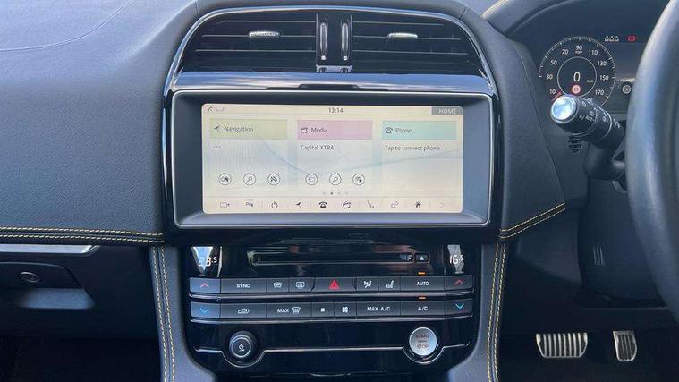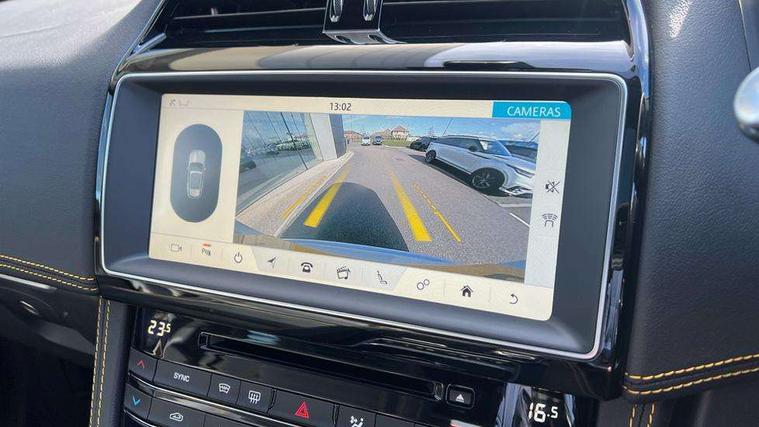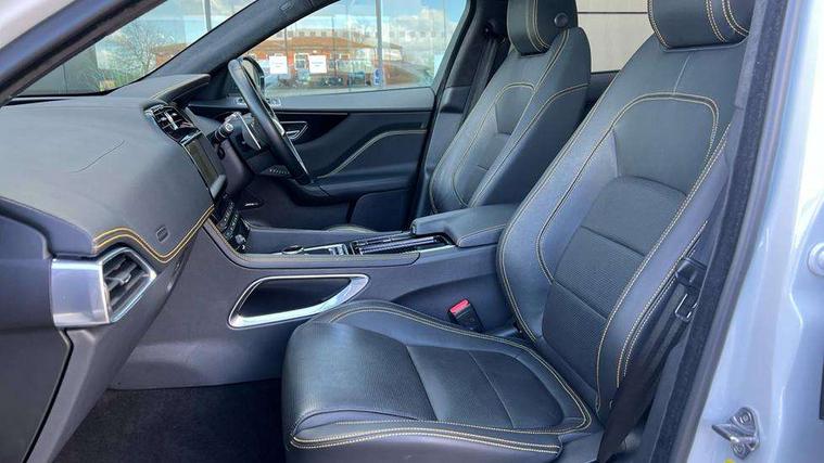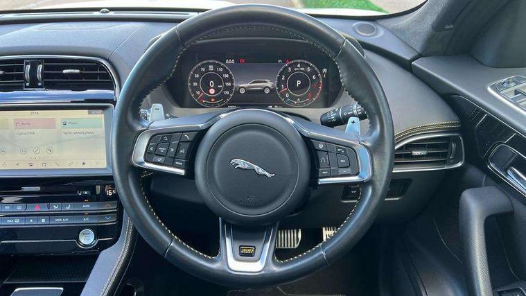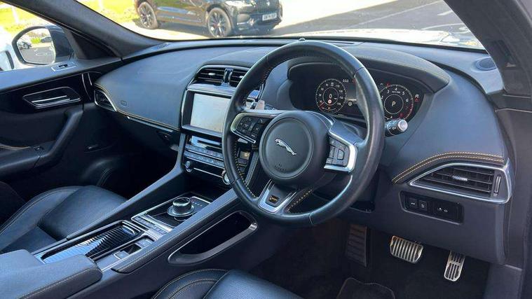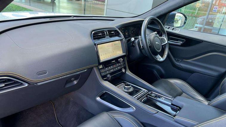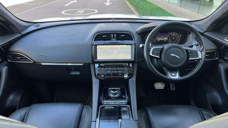 Android Auto, Apple car play, Driver condition monitor, Eco driving style assistant, Electric power assisted steering, InControl remote premium, Interactive Driver display instrument cluster, JaguarDrive control, Lane departure warning system, Lane keep assist with driver alert control, Outside temperature gauge, Pro services and wifi hotspot, Push button starter, Rotary shifter, Service interval indicator, Speed proportional steering, Start up sequence with movement in dials and lighting, Traffic sign recognition with adaptive speed limiter, Trip computer, Voice control system, 8 speed automatic transmission, All terrain progress control, All Wheel Drive (AWD), Open differential with torque vectoring by braking, AM/FM radio, Bluetooth connectivity including audio streaming, CD/DVD player, DAB Radio (Digital Audio Broadcasting), Dynamic volume control, InControl apps, InControl protect, 3 flash lane change indicators, 300 Sport badge, Antenna roof pod in gloss black, Approach Illumination, Auto dimming rear view mirror, Automatic headlights, Body coloured 300 Sport door claddings with dark satin grey finishers, Dark satin grey mirror caps, Dark satin grey side vents, Dark satin grey side window surround, Dual tailpipes with 84mm finishers, Electric folding, auto dimming, heated door mirrors with memory + approach lights, Electric front/rear windows with one touch/auto up/down, F-Pace badge, Front fog lights, Gloss black grille with dark satin grey surround, Gloss black roof rails, Green tinted heat insulating glass, Headlight power wash, Heated front windscreen, Heated rear window with timer, Heated washer jets, LED tail lights, Metallic paint, R-sport body kit, Rain sensor windscreen wipers, Rear fog lights, Rear metal tread plates, Rear wiper, S front bumper with dark satin grey inserts, S rear bumper with dark satin grey valance, Trailer stability assist, Variable front intermittent wipers, 12V power point front, 3 rear headrests, 300 Sport branded soft grain leather steering wheel, 4 way electric lumbar adjust for front seats, 40:20:40 split folding rear bench seat, Aluminium gear shift paddles, Bright metal foot pedals, Centre armrest console, Door sill tread plates, Electrically adjustable steering column, Fold flat front seats, Front centre armrest with storage compartment, Front headrests with 300 Sport embossing, Glovebox finisher with jaguar script, Heated steering wheel, Hooks in loadspace, Illuminated glovebox, Illuminated luggage compartment, Interior front door handles with separate locking switches, ISOFIX on outer rear seats, Jaguar sense, Luggage tie downs in loadspace, Multifunction steering wheel, Overhead lighting console, Passive front head restraints, Perforated grained leather upholstery with yellow contrast stitching, Rear air vents, Rear armrest with twin cupholders, Rear centre headrest, Reversible boot floor, Sports carpet mats, Sunvisors with illuminated vanity mirrors, Twin front cupholders with cover, 300 Sport black brake calipers, 350mm front brakes, 3x3 point rear seatbelts, ABS, All surface progress control (ASPC), Anti-whiplash front headrests, Autonomous emergency braking (AEB) with forward facing camera, Brake pad warning light, Driver/Front Passenger airbags, DSC - Dynamic Stability Control, Electronic parking brake, Front and rear curtain airbags, Front and rear seatbelt reminder, Front passenger seat occupancy sensor, Front side airbags, Hill launch assist, Power operated child locks, Torque vectoring brake, Traction control, Tyre pressure monitoring system, Immobiliser, Keyless start, Perimeter alarm, Remote central locking, Valet mode, Luxtec door trim, Luxtec wrapped instrument panel topper with yellow contrast stitching, Satin chrome centre console storage surround finishers, Satin chrome touchscreen surround,