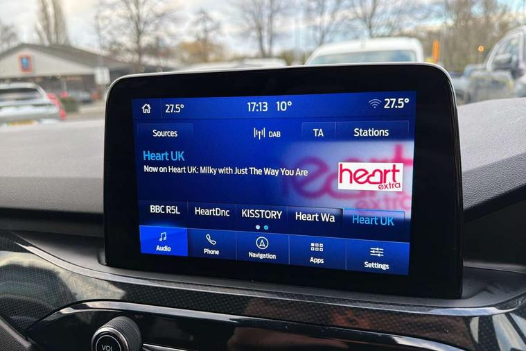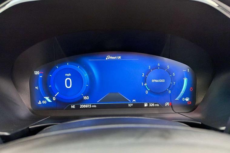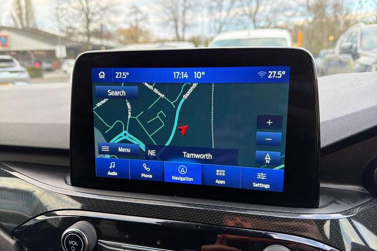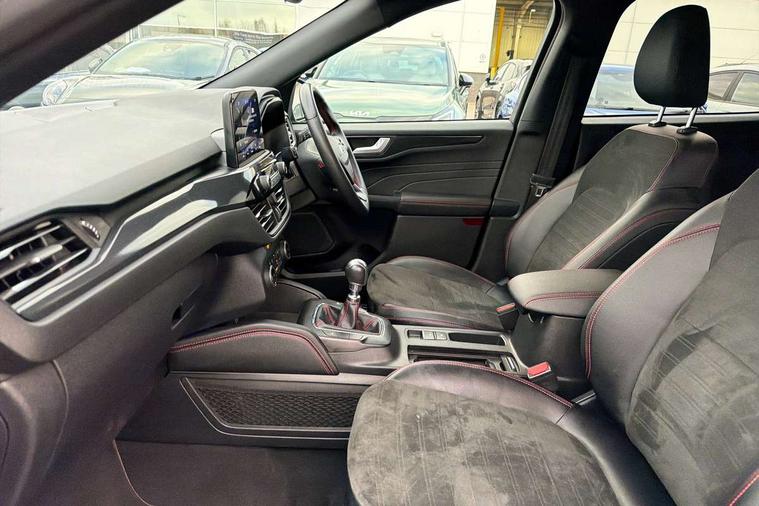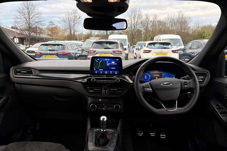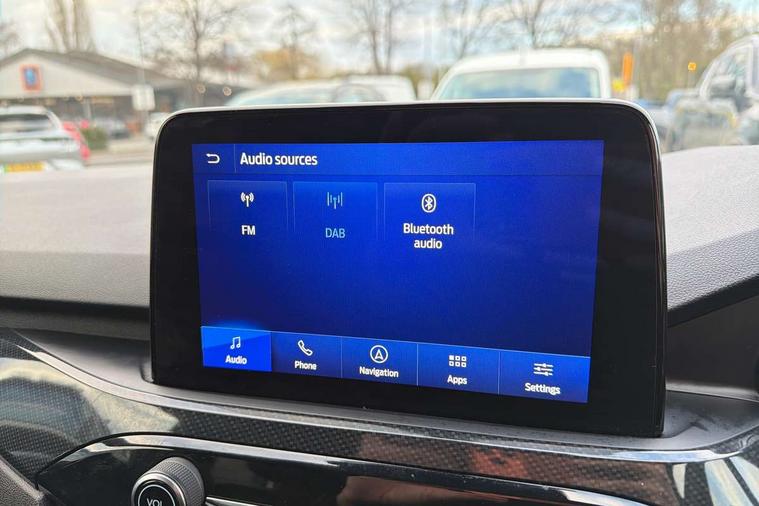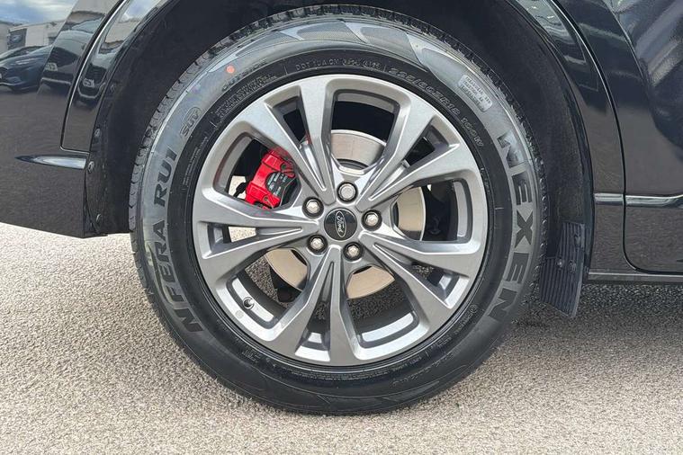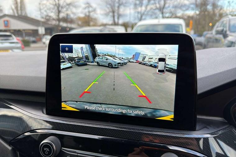 12.3" digital colour instrument cluster, Ford easy fuel, Ford SYNC 3 with 8" TFT LCD touchscreen, App Link, andriod auto/apple carPlay, emergency assistance and navigation with Ford pass connect, Front and rear parking sensors, Hands free power tailgate, Lane keeping aid with lane departure warning, Power assist steering, Rear view camera, Selectable drive modes, Service interval indicator, Sports suspension, Twist beam rear suspension, B&O premium audio system with 10 speakers and subwoofer, 2 USB ports, DAB radio/CD, Auto headlamps with high and low beam, Black roof rails, Body colour bumpers, Day/night rear view mirror, Front LED fog lamps, Large rear roof spoiler, LED daytime running lights, LED rear lights, Power folding, electrically adjustable and heated door mirrors with puddle lights, Power front/rear windows with global close, Quickclear heated windscreen, Rain sensing wipers, Rear privacy glass, Rear side wing doors, Rear wiper, ST Line body styling kit with unique front and rear fascia and bumper, rear painted diffuser, front painted skid plates, dark mesh upper grille, ST Line front scuff plates, Third brake light, Twin exhausts, 2nd row sliding seats with 60:40 split, Alloy pedals, Centre console with electronic parking brake, Dark headlining and pillars, Electronic automatic temperature control (EATC), Flat bottomed leather steering wheel in sensico with red stitching, Front and rear head restraints, Partial premium touch Sensico with black cloth inserts and red stitching, Rear centre head restraint, Single front passenger seat, Sports seats, ST Line front and rear floor mats, ST Line gear knob, 3x3 point rear seatbelts, Airbags - front driver/passenger, front and rear curtain, Drivers knee airbag, Electronic stability control (ESC) and ABS, Ford MyKey Gen 2 safety system, Manual child proof rear door locks, Post collision braking, Pre collision assist with autonomous emergency braking, Rear seat Occupancy alert, Red brake calipers, Tyre pressure monitoring system, Engine immobiliser, Keyless entry and Ford power start button (Keyless start), Locking wheel nuts, Remote powered central double locking doors, Thatcham category 1 alarm,