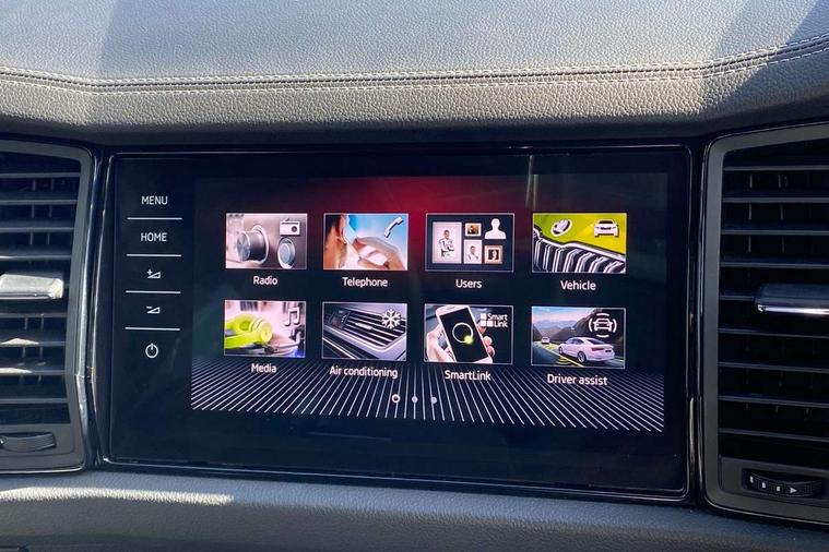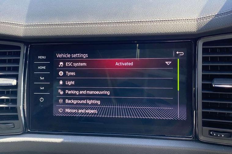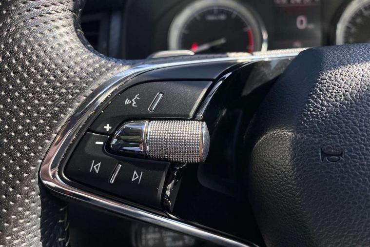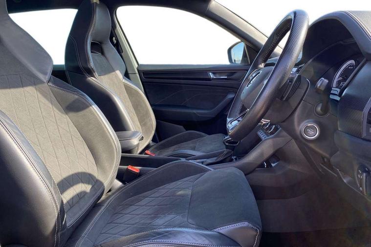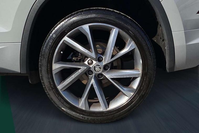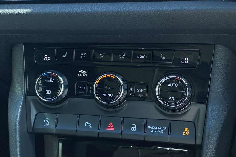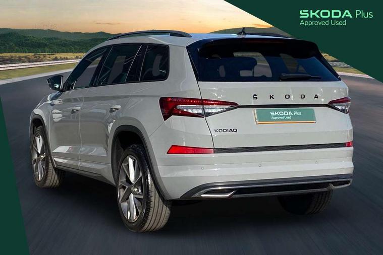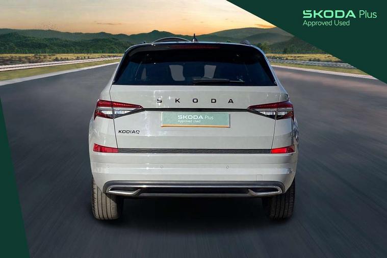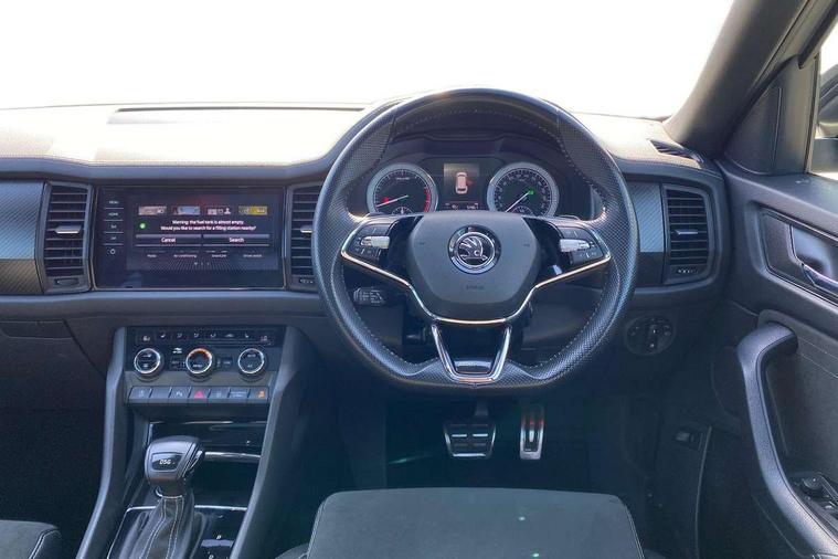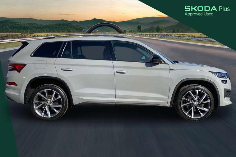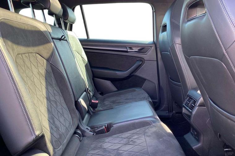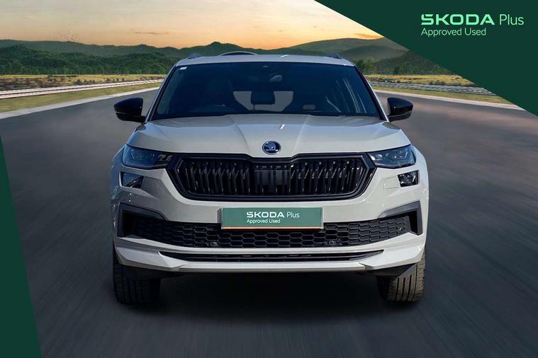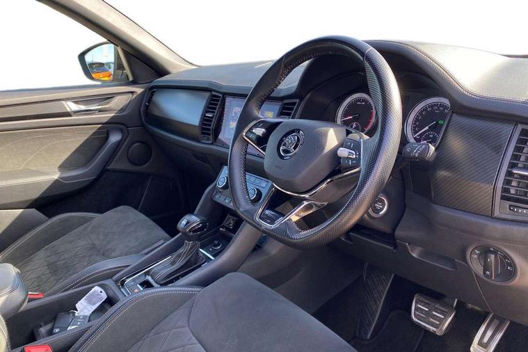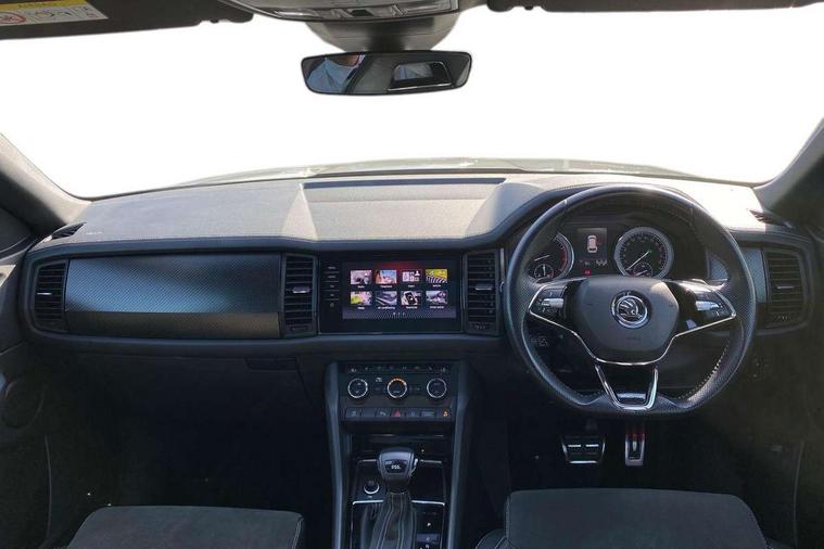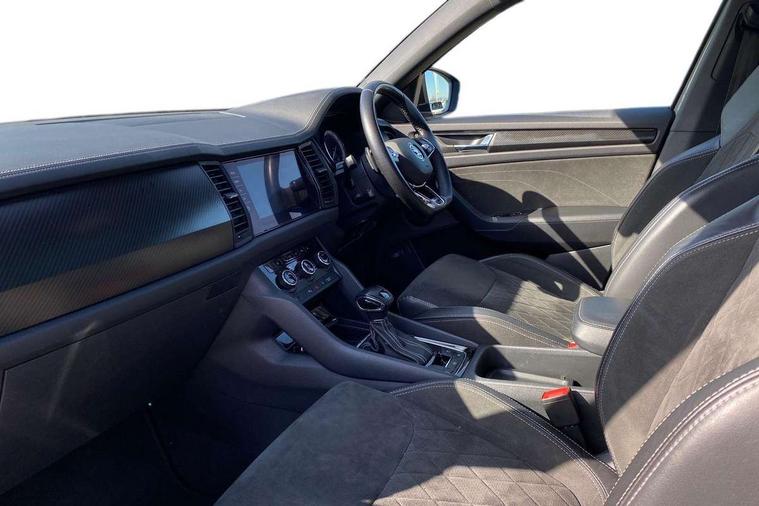 Bluetooth system, Columbus satellite navigation with 9.2" touchscreen, integrated Wi-Fi, web radio, E-call, ECO Stop/start function, Exterior temperature indicator, Progressive steering, Rear view camera, Smartlink wireless for apple carplay and wired for android auto, Speed limiter, Tailgate unlocking from outside, USB C Port x 2 in front centre console, Wireless charging, 8 Speakers, DAB Digital radio, Aero front windscreen wipers with intermittent function, Aero rear window wiper, Auto dimming rear view mirror, Black roof rails, Black sports styling including front grille and window surrounds, Black wheel arch surrounds, Body colour bumpers, Body colour door handles, Electric adjustable/heated/folding door mirrors, driver side auto dimming with boarding sports and memory function, Electric front and rear windows, Extended rear spoiler with finlets in gloss black, Front fog lights, Full LED matrix headlights with AFS (adaptive front light system), cornering function and AWL (all weather lighting system), Gloss black door mirrors, Headlight washers, Heated rear window, Invisible tailpipe, LED daytime running lights, LED rear fog light, LED third brake light in rear spoiler, Light assistant (coming/leaving home/tunnel light), Off-road style lower front bumper element, Privacy glass, Rain and light sensors, Rear diffuser, Rear LED lights (high functionality) with welcome effect and dynamic indicators, Rear side wing doors, Safety reflectors on front and rear doors, Sportline badge on front fender, Sports front and rear bumpers including lower rear chrome strip, Tailgate lettering in Black, Window control switches with black trim, 12V socket in boot, 2 rails with 2 hooks, 2 seat bench in 3rd row, 3 seat bench in 2nd row, 4 foldable roof handles with rear coat hooks, 60:40 foldable rear seat with sliding adjustment and backrest angle adjustment, Aluminium pedals, Black roof headlining, Bottle holders in door panel in the 1.5 litre front and 1 litre rear, Cargo storage compartments, Chrome headlight control button, Chrome interior door handles, Coat hooks on B pillar, Covered storage compartment on driver side, Decorative door sills in the front and rear, Front centre armrest with storage compartment, cup holder and 12V socket, Front courtesy lights, Gear shift lever with chrome frame and black gloss insert, Grey stitching in front and rear armrests and door armrests + door inserts, Height adjustable front headrests, Illuminated and cooled glovebox, Illuminated luggage compartment, Isofix child seat fittings in outer rear seats with top tether, Manually adjustable steering column, Microsuede door panels, Net programme in boot (1x horizontal Net, 2x vertical Nets), Overhead glasses storage compartment, Pollen filter, Rear centre armrest with cupholders, Single front passenger seat, Sliding trunk cover, Small Bags on the inner sides of the front backrests, Sports seats, Sunvisors with illuminated vanity mirrors, Three rear height adjustable headrests, Ticket holder on A Pillar, Umbrella in door panel, Variable boot floor, LED Interior light pack - Kodiaq, Auto door release and activation of warning lights in the event of an accident, Child locks on rear doors, Driver and front passenger airbag with knee airbag and front passenger airbag deactivation, Electronic parking brake with hill start assist, Emergency rear braking signal, ESC (incl. ABS+MSR+ASR+EDS+HBA+DSR+RBS+MKB), Front assist with autonomous emergency braking, Front side airbags with curtain airbags, Fuel cut off safety device, Height adjustable front 3 point seatbelts + pretensioners, Hill hold control, Rear disc brakes, Safety vest holder in door, Seat belt reminder for all seats, Three point rear seat belts, Two tone horn, Tyre pressure monitor, Alarm with interior monitoring and tilt sensor with safe function, Anti-theft wheel bolts, Immobiliser, Keyless entry and start system (KESSY), Remote central locking with 2 keys, Black air vent surround, Carbon finish dashboard and door inserts, Grey stitching in dashboard, 20" Vega Anthracite alloy wheels, Temporary spare wheel (space saver),
