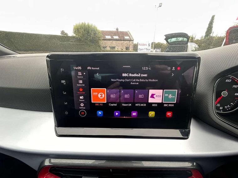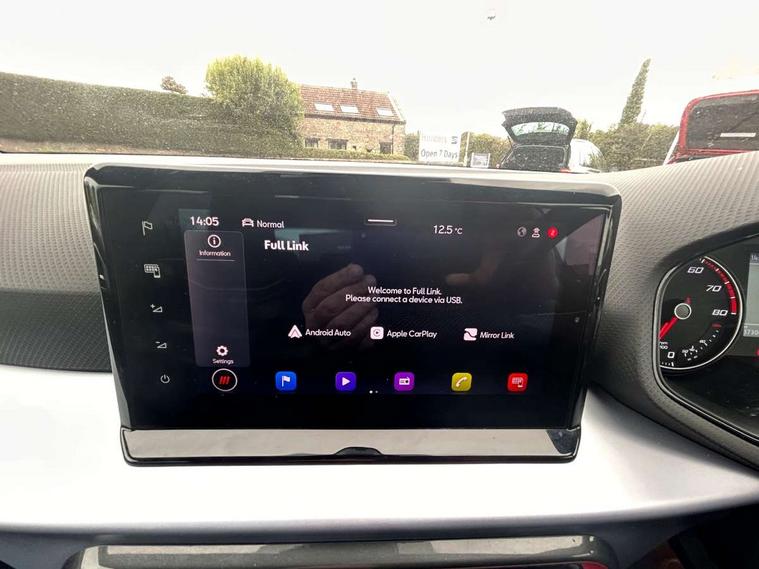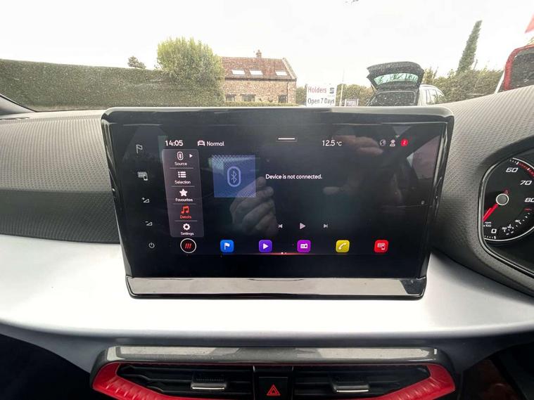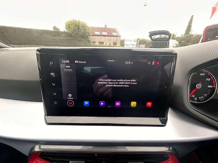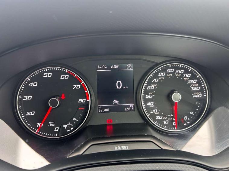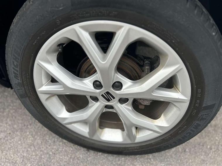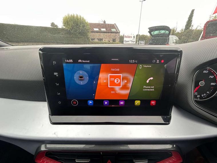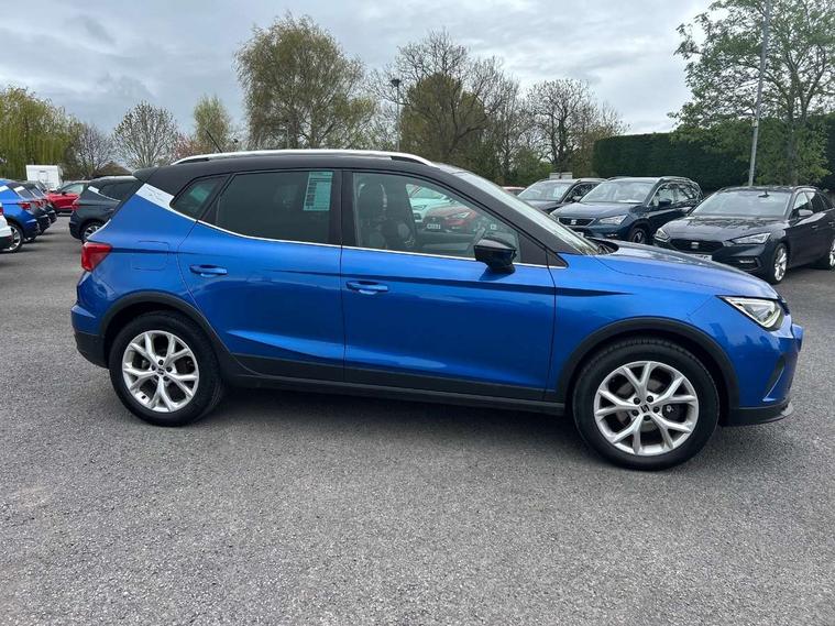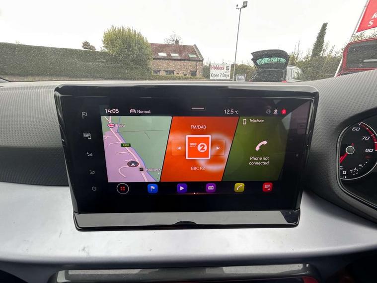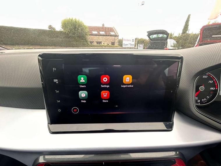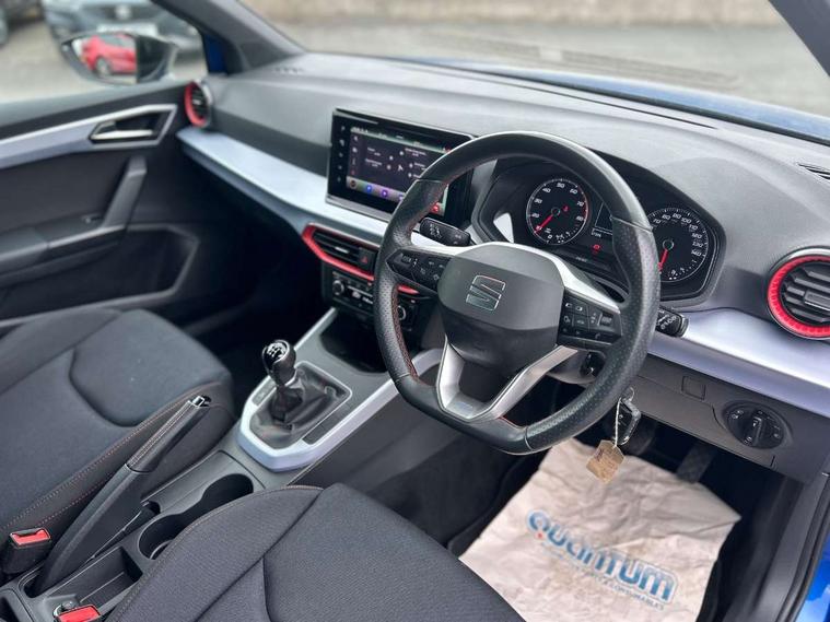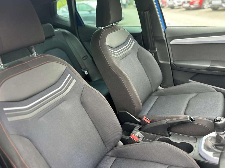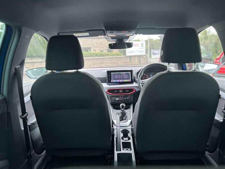 'Lights On' Reminder warning buzzer, 8" Digital cockpit, Digital clock, E-call, Electric speed sensitive power steering, Full Link Smartphone Integration with Mirror Link, Apple Car Play, Google Android Auto with USB Type C cable for Apple and Android compatibility, Lane keeping system, Low fuel warning light, Outside temperature display, Rear parking sensor, RPM counter, Seat connect with safety, service, remote and online, SEAT Drive profile - Four different models normal-sport-eco-individual, steering response, throttle response, Trip computer, Wireless phone charger, 9.2" colour touchscreen with navigation system, voice control and USB port (type c), Bluetooth interface for hands free and audio streaming, DAB digital radio and AM/FM radio, Steering wheel mounted audio controls, Anti theft roof antenna, Auto dimming interior rear view mirror, Automatic activation of hazard warning lights, Body coloured bumpers, Body coloured door handle inserts, Chrome roof rails and window surrounds, Dark tinted rear windows, Electric front/rear windows, Electrically adjustable, heated and folding door mirrors, Front fog lights with cornering function and rear fog light, FULL LED automatic headlights with dynamic headlight range control, coming and leaving home, LED daytime running lights, LED rear tail lights and licence plate lights, Protective side mouldings, Rain sensing wipers, Rear side wing doors, Rear spoiler, Rear window wash/wipe, Roof colour door mirrors, Third brake light, Twin exhaust pipe styling hidden exhaust pipe, Visible VIN plate, Windshield wiper with intermittent control and potentiometer, 2 cupholders, 3 seat bench in 2nd row, 60/40 split folding rear seat, Aircare filter, Black interior roof, Cloth upholstery, Double boot floor, Driver sunvisor with covered mirror + card holder, Dual zone climate control, Front courtesy light with 2x front and 2x rear reading lights, Front sport seats, Gear shift indicator, Height adjustable front seats, Height/reach adjustable steering column, Illuminated boot, Instrument lighting with brightness control, Interior ambient lighting, Interior light in footwell, central console and door panel, ISOFIX points in outer rear seats with top tether anchorage points, Passenger sunvisor with vanity mirror, Perforated flat bottomed leather steering wheel/gear knob/handbrake with red stitching and FR logo, Single front passenger seat, Two front and three rear height adjustable headrests, Interior chrome pack - Arona, 3 point seatbelts on all rear seats, ABS, Active front headrests, Child locks on rear doors, Driver and front passenger airbags with front passenger airbag de activation, front side and curtain airbags, Electronic stability control, Emergency Brake Assist (EBA) and front assist, Front and rear seatbelt reminder, Hill hold control, Multi-Collision braking, Tiredness recognition system, Traction control, Tyre pressure monitoring system, Alarm with back-up horn, Electronic engine immobiliser, Locking wheel bolts, Remote central locking + deadlocks, Tow away protection, Titan black dashboard, 17" Dynamic alloy wheels,