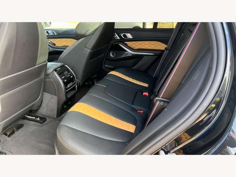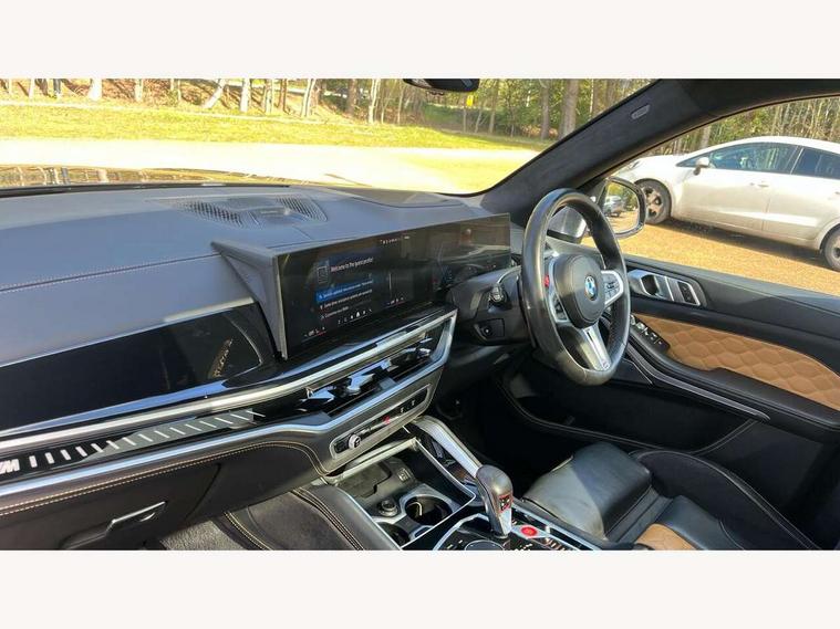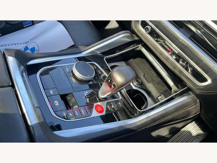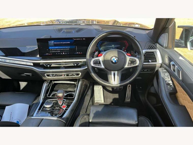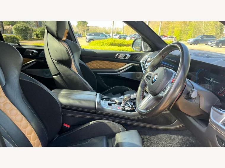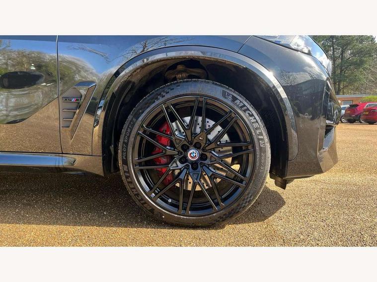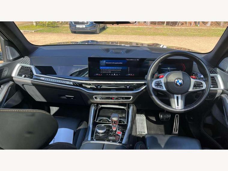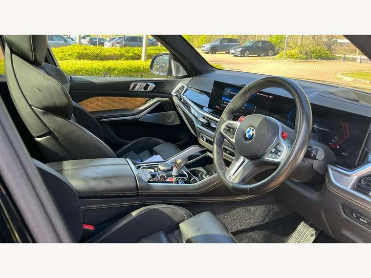 32GB hard disc drive (HDD) memory, Attentiveness assist, Automatic tailgate with seperately opening top hinged section, BMW ConnectedDrive online services, BMW Drive recorder, BMW gesture control, BMW legal emergency call, BMW Live Cockpit Pro with Head up display including 12.3" instrument display and 14.9" high resolution control display with navigation function, BMW Teleservices, Brake force display, Brake pad wear indicator warning light, Condition based service - BMW service history, electronic service booklet, integrated owner's handbook, Electric power steering, Enhanced bluetooth hands free facility with Telephony wireless charging, Front/rear park distance control (PDC), iDrive controller with shortcut buttons, Infinity symbol with line graphic on reset of average consumption, M drive buttons, M servotronic, Oil sensor for level and grade, On board computer inc. average speed, fuel consumption, liquid crystal Info display, journey computer, outside temperature display, personal profile, Parking Assistant Professional, Recovery braking system, Run flat indicator, Service interval indicator, Stop/start button, Storage for wireless charging, Wi-Fi hotspot, 8 speed automatic with steptronic transmission including launch control and gearshift paddles on the steering wheel, Active M differential, BMW M TwinPowerTurbo 8 cylinder petrol engine, Double VANOS, High precision injection, M Adaptive suspension pro, M Sport differential, M xDrive system, Petrol Particulate Filter, Safety battery terminal clamp, Turbocharger with Valvetronic, DAB Tuner enables digital radio reception, Favourite buttons, USB connection, USB type A 1.5A in cupholder, USB Type C 3A in centre armrest, Adaptive LED Headlights, Automatically dimming rear view mirror, BMW Individual high gloss shadow line exterior trim, BMW Individual high gloss shadow line with extended contents, BMW individual lights shadow line, Body color M rear spoiler, Body colour bumpers, Body colour door handles, Body colour roof spoiler, Brake lights illuminate under normal braking, Door locking - after driving off to secure vehicle, Dynamic brake lights with LED technology, Exterior mirror base in black matt, Follow me home headlight function, Front and rear bumper system, Front and rear door sill strips, Front and rear electric windows with open and close fingertip control, anti trap facility and comfort closing, Heated windscreen washer jets, High beam assistant, High gloss black shadow line roof rails, Integrated direction indicators, LED fog lights, LED Rear light with tail light, brake light and turn indicators, LED Reflectors, left and right, integrated in tailgate, M Sport exhaust system, M strake element with model designation, integrated in the Air Breather, M-specific Exterior mirrors, Rain sensor with automatic headlight activation and windscreen wiper control, Rear side wing doors, Rear wiper, Roller shutter, Sun protection glazing, Third brake light in rear spoiler, Trailer stabilisation logic, Under severe vehicle deceleration, Variable intermittent rear wash/wipe, Welcome light carpet, X5 M competition badging on tailgate high gloss black right finished, 12V - Power sockets with 2x centre console and 1x luggage compartment, 3 rear headrests, 3 seat bench in 2nd row, 4 Lashing eyes in boot, 4 zone control automatic air conditioning, 40:20:40 split folding rear seats, BMW ID, Child seat ISOFIX attachment with rear outer seats includes top tether, Compartment in front of cupholder, Driver + front passenger lumbar support, Driver and front passenger seat heating, Electric adjustment of the upper section of the backrest with Illuminated M logo on the head restraint, Electrical steering column with adjustable height and length with activation and control on the steering column, Front and rear cupholders x 2, Front and rear door pockets, Front and rear side armrest integrated into door trim, Front footwell lights, Front reading lights, Gear selector lever and operation, Left and right bag hooks in luggage compartment, Light inside glove compartment, Lockable glove compartment, Luggage compartment floor panel with integral storage tray, Luggage compartment lighting, Luggage net, Lumbar support with height and depth adjustment in backrest, M Electric front sport seats with memory function, M sport leather steering wheel, M steering wheel with gearshift paddle switches made of CFC, Multifunction controls for leather steering wheel, Multifunctional hooks, Seat back with flap pocket, Securing rings in luggage compartment, Single front passenger seat, Storage bins on all doors, Storage space underneath the floor insert in luggage compartment, Storage tray and compartment with cover in centre console, Sunvisors with illuminated vanity mirrors, Toolkit located in luggage compartment, Velour floormats, Ambient light interior pack - X5 M/ X6M, Connected Package Professional - X5 M, Expanded exterior mirror pack - X5 M/X6 M, Active protection, Airbags - driver/front passenger, rear and side, first and second row seats head airbags, front passenger seat airbag deactivation + knee airbag, Anti-lock braking system (ABS), Automatic Stability Control (ASC), Black M sports seatbelts with coloured M seam for all seats, Brake drying, Brake energy regeneration, Brake fade compensation, Braking pre-tensioning, Child proof locking system in rear door, Cornering brake control (CBC), Crash sensor activating central locking release, hazard warning lights, fuel cut off, interior lighting + activation of safety battery terminal clamp, Deformation zones - front and rear with door reinforcements and bumpers up to 2.5 mph, DSC - Dynamic Stability Control, Dynamic brake control, Dynamic Traction Control - DTC, Electromechanical parking brake with automatic drive away release and auto hold function, Electronic brake force distribution, Front and rear brake discs with interior ventilation, Front and rear M seatbelts stopper, seatbelt tensioner for front and outer r