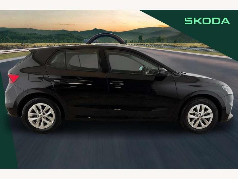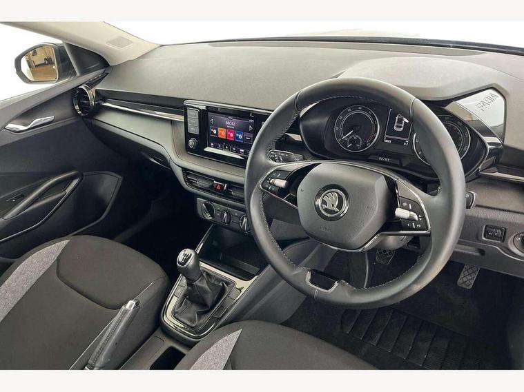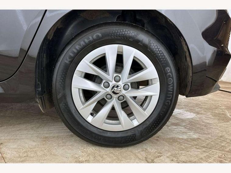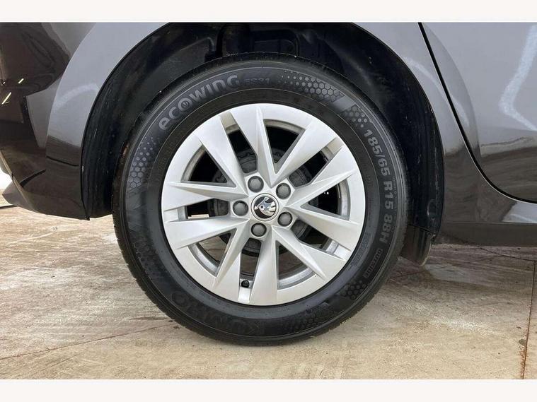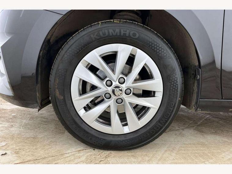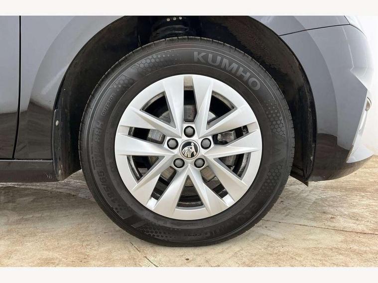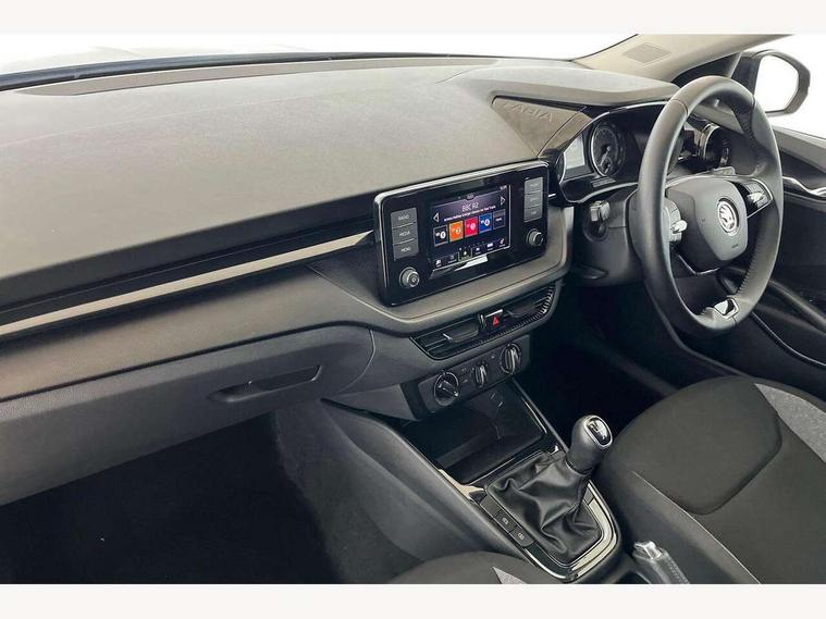 Bluetooth connection, Driver alert system - DAS, Electromechanical power steering, Exterior temperature gauge, Lane assist including road edge detection, Multifunction trip computer in black and white, Service interval indicator, Speed limiter, 2x USB-C in the front (for data transmission and charging), 4 speakers in front, Auxiliary socket for external MP3 player, DAB digital radio reception, Radio Swing with 6.5" colour display, Basic LED Headlights, Basic rear lights, Body colour door mirrors, Body coloured bumpers, Dimming rear view mirror with black frame, Door mirror integrated indicators, Electrically adjustable and heated door mirrors, Electrically adjustable front windows with function auto up/down, Front fog lights, Front window wiper intermittent control, Headlight range control - Automatic, Ice scraper in fuel cap, LED daytime running lights with coming and leaving home feature, Mechanical adjustable rear windows, Rain sensor, Rear LED fog light, Rear side wing doors, Rear window wiper with washing nozzles, Roof mounted spoiler, SKODA tailgate lettering in chrome, Third brake light, 2 reading lights in front and 2 reading lights in rear, 2 spoke leather multifunction steering wheel, 3 rear headrests, Backrest split and folding, Central console with fixed cup holder and storage box, Chrome handbrake release button, Fabric upholstery, Gearshift knob/handle in leather, Grain satin black interior door handles, Hand brake lever handle in leather, Height adjustable front headrests, Height adjustable front seats, Height adjustable steering wheel, ISOFIX and TopTether anchorage points to the outer rear seats, ISOFIX and TopTether on the front passenger seat, Luggage compartment lighting, Manual air conditioning, Manually adjustable lumbar support in front seats, Pollen filter, Rear seat bench unsplit, Single front passenger seat, Storm grey headlining, Sun visors with mirror and airbag label on passenger side, Ticket holder, 3-point height adjustable front seats belts with pretensioner and force limiter, Automatic warning lights in case of crash, Driver and passengers airbag with switch off function, e-Call+, ESC including ABS, MSR, ASR, EDS, HBA and XDS, Front and rear seat belt warning, FRONT ASSIST (AEB City and AEB Inter Urban), Front side airbags, Head airbags, One tone horn, Pedestrian protection, Three rear 3-points safety seat belts with pretensioner and force limiter including stop function for outer rear seat belts, Tyre pressure monitoring system, Anti-theft alarm system including immobiliser, interior monitoring, backup horn, and towing protection, Central locking with radio remote control, interior controls, SAFE function and 2 foldable keys, Black painted air vents, Glossy black decorative trim, Grain satin black central console cover, Grain satin black lower decorative trim, Satin black door and side trim panel in front, Anti-theft wheel bolts protection, Super-low rolling resistance tyres,