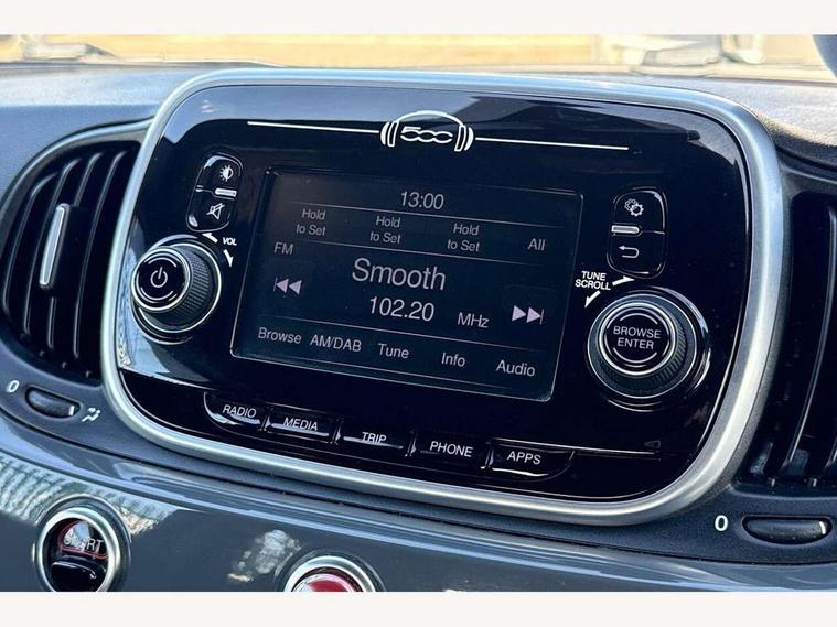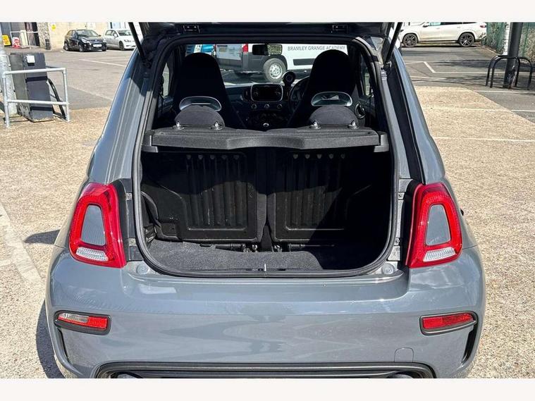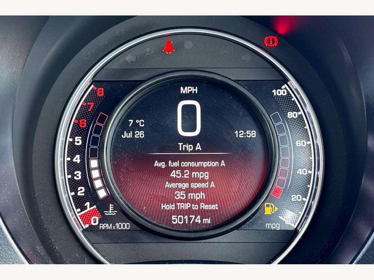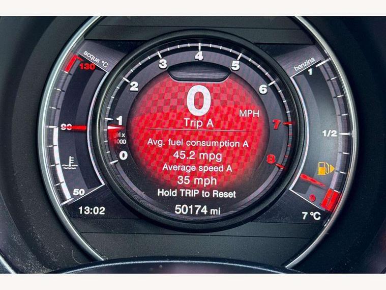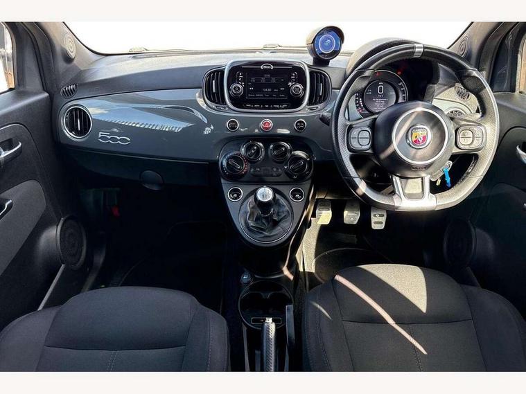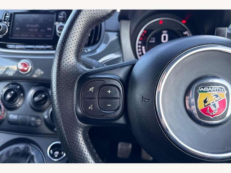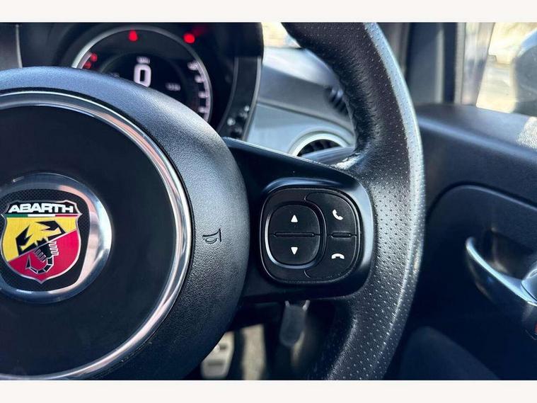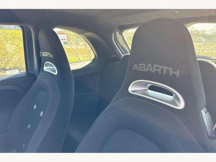 Dualdrive PAS, Sports button, TFT display screen, Trip computer, U-connect access via mobile, Front suspension with FSD technology (Frequency selective Damping), Torque transfer control (TTC), Bluetooth audio streaming, Body coloured bumpers, Electric front windows, Front bumper with honeycomb grille and embossed Abarth logo, Front fog lights, LED daytime running lights, Matt black front and rear bumper insert, Rear wiper, Satin chrome exterior door handles, Twin exhausts with satin steel tailpipes, 12V socket, Chrome gear knob, Driver/front passenger seat height adjustment, Front head restraints, Front passenger seat memory, Glovebox, Height adjustable steering wheel, Interior stowage net, Rear headrests, Sports leather multifunction steering wheel with controls and satin chrome detailing, Sports seats, Stainless steel sports pedals, 3x3 point rear seatbelts, ABS, Driver and passenger airbags, Drivers knee airbag, ESP + ASR/MSR + HBA + Hill holder, Front side airbags, High performance brakes, Rear brake discs, Tyre pressure monitoring system, Ventilated front disc brakes, Window airbags, Alarm, Central locking, Immobiliser, Remote central locking, Fix and go kit,
