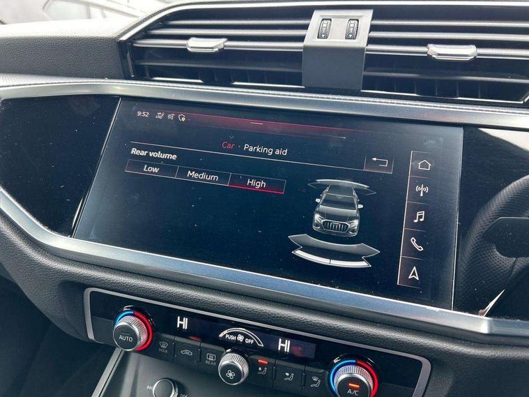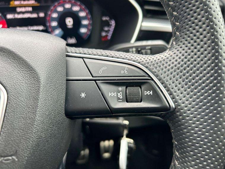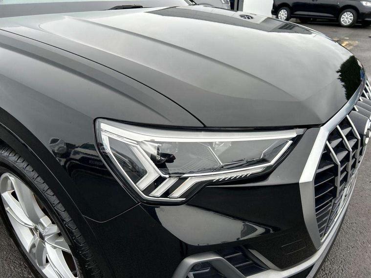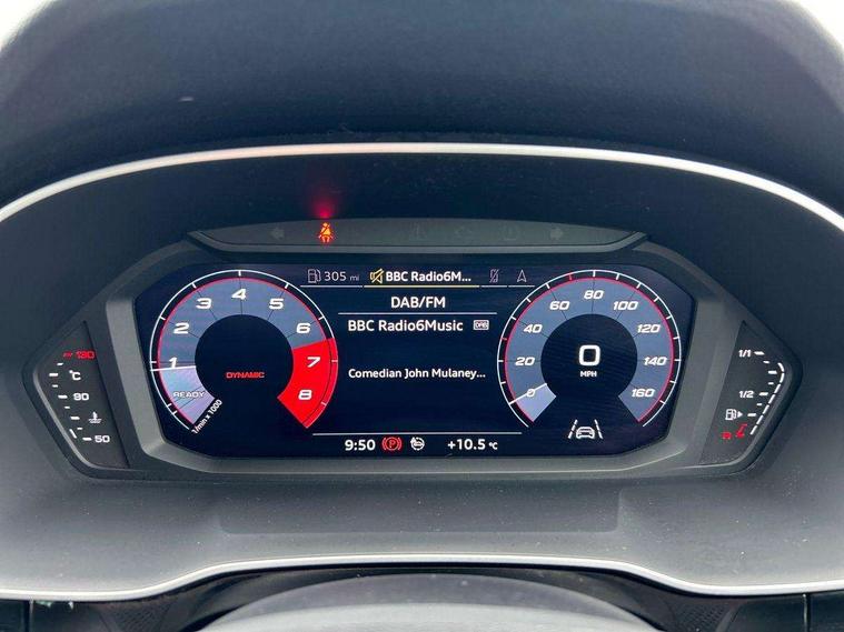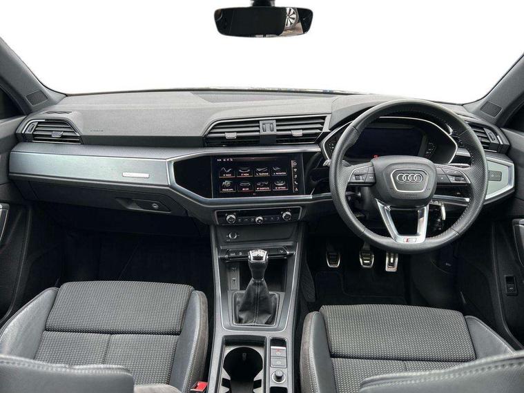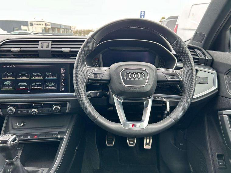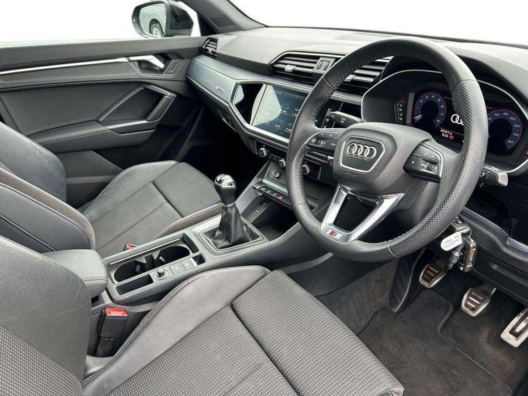 Audi connect safety and service (e-call), Audi drive select, Audi lane departure warning, Audi side assist, Audi smartphone interface, Audi Virtual Cockpit - 10.25" display, Bluetooth interface, Camera based traffic sign recognition, Cruise control + speed limiter, MMI navigation plus with MMI touch, Power opening/closing tailgate, Progressive steering, Rear parking sensors, Service interval indicator, Stop/start system, Voice control system, Sports suspension, 1 x USB type C and 1 USB type A charging points, 6 speakers, DAB digital radio module, Acoustic windscreen, Aluminium roof rails, Aluminium window trim, Auto dimming rear view mirror, Body coloured bumpers, Diffuser in matt Platinum grey, Electrically adjustable and heated door mirrors with integrated LED side indicators, Front and rear electric windows, Front fog lights, Front side air inlets in matt platinum grey, Front spoiler blade in matt platinum grey, Grille vertical bars in aluminium silver/Matt, High gloss black finish B and C pillars, LED headlights with LED daytime running lights and dynamic rear indicator, LED rear lights, Privacy glass, Rain and light sensors, Rear diffuser strip in matt titanium black, S Line badge on wings, S Line front and rear bumpers, Side skirt insert in matt Platinium grey, Titanium black radiator grille, 12V socket in rear centre console, 40:20:40 split folding rear bench seat, Adjustable rear seat bench/backrest with centre armrest and cupholder, Aluminium door sill trims, Black cloth headlining, Dual zone climate control, Front and rear black floor mats with contrast stitching in rock grey, Front and rear headrests, Front and rear roof module including reading lights, Front centre armrest with storage compartment and angle adjustment, Glove compartment lighting, Height and reach adjustable steering wheel, Illuminated door sill trims with S logo, ISOFIX child seat mounting and Top Tether with front passenger airbag deactivation, Luggage compartment light, Manual front seats with height adjustment, Perforated leather gearknob, Stainless steel luggage compartment sill finisher, Stainless steel pedals, Non smoking pack - Q3, 3x3 point rear seatbelts, 6 airbags - Driver, front passenger, curtain and side windows, Audi pre-sense front with pedestrain and cyclist recognition, Electrically operated child locks on rear doors, Electromechanical parking brake, Electronic stabilisation control including ABS, ASR and EDL, Hill descent control, Hill hold assist, Pre sense basic, Seatbelt monitoring, Tyre pressure warning, Warning triangle and first aid kit, Anti theft alarm, Anti theft wheel bolts, Remote central locking, Dark matt brushed aluminium inlay, MMI touch colour display in gloss black with aluminium surround,