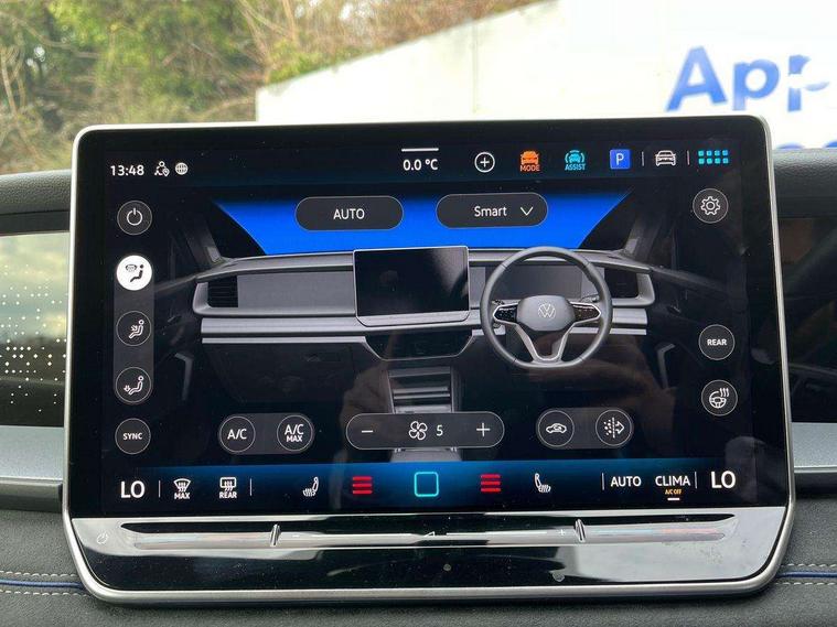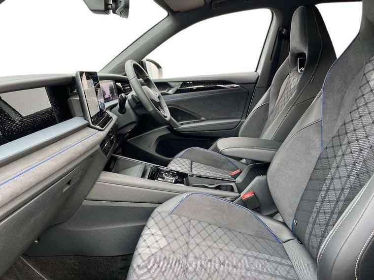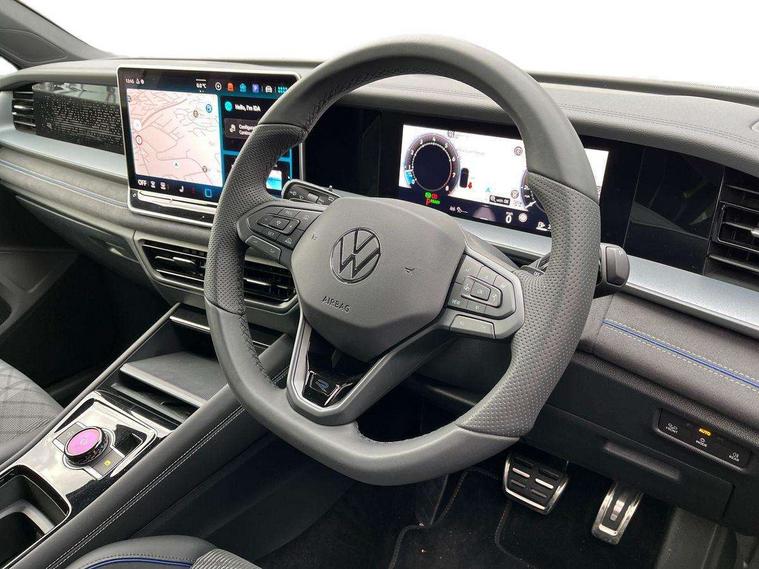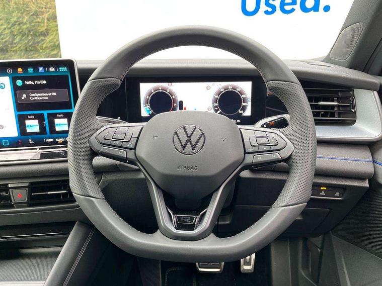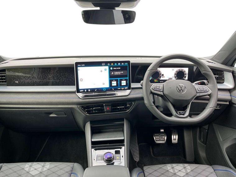Adaptive cruise control (ACC), Digital Cockpit Pro - 10.25" high resolution dash display screen with customisable menus and information, Driver alert system, Driver attention monitoring system, Dynamic road sign display, E-Sim card for online connectivity, eCall emergency call system, Lane change system, Side assist, Rear traffic alert and Exit warning system, Multifunction front facing camera, Oncoming vehicle braking when turning including swerve support, Start/stop system with regenerative braking, Voice activation spoken voice commands for telephone and navigation system, Warning signal and warning light for front and rear seatbelts not fastened, Wireless App-Connect, Front wheel drive, Digital radio reception (DAB), Diversity antenna for FM reception, Air intake with Chrome trim, Auto dimming interior rear view mirror, Automatic headlight control system, Body colour door handles, Chrome moldings on the side windows, Coming/leaving home lighting function, Dynamic headlight range control with dynamic cornering light, Exterior mirrors convex on the left and aspherical on the right, Heat insulating glass in side and rear windows, Illuminated Volkswagen logo rear with animation, Laminated safety glass windshield, heat insulating, LED 3rd brake light, LED separate signature day time running light, Puddle lights, Rain sensor windscreen wipers, Rear fog light on one side, reversing light on both sides, Rear side wing doors, Rear wiper, Reverse activated passenger's door mirror, Surround lighting with welcome light, Volkswagen logo in front, illuminated lighting animation with wake up/goodbye scenario and illuminated door handles, 10 colour interior ambient lighting, 12V outlet in center console rear and in luggage compartment, 3 rear headrests, 3 rear seat bench in 2nd row, backrest split folding with centre armrest and 2 seats in 3rd row of seats, Black roof lining, Brushed stainless steel pedals, Carpet mats, front and rear, Centre console with illuminated storage compartment with sliding cover and two drinks holders, Chrome elements on the mirror switch and power window switches and door pulls, Door and side trim panel insert in Art velour, Flat luggage compartment floor, Front centre armrest, Front scuff plates in aluminium, ISOFIX anchors for child seats on outer rear seats and front passenger seat compatible with i-Size, Mechanical rear seat release, Power adjustable lumbar support in front, Single front passenger seat, Sports comfort seats in front, Sun visors with illuminated vanity mirrors, 3 Point seat belts in front with pretensioners, 3 point seatbelts in outer rear with ECE label, Autonomous emergency braking front assist with pedestrian and cyclist monitoring, Driver and front passenger airbag with front passenger airbag deactivation, Electronic parking brake with auto hold, First aid kit with warning triangle and safety vest, Front and rear curtain airbags, Front and rear side airbags, Front centre airbag, Front disc brakes, Hill start assist, Rear disc brakes, Two tone horn, Decorative material set R-Line, Interior door handle in matte chrome,