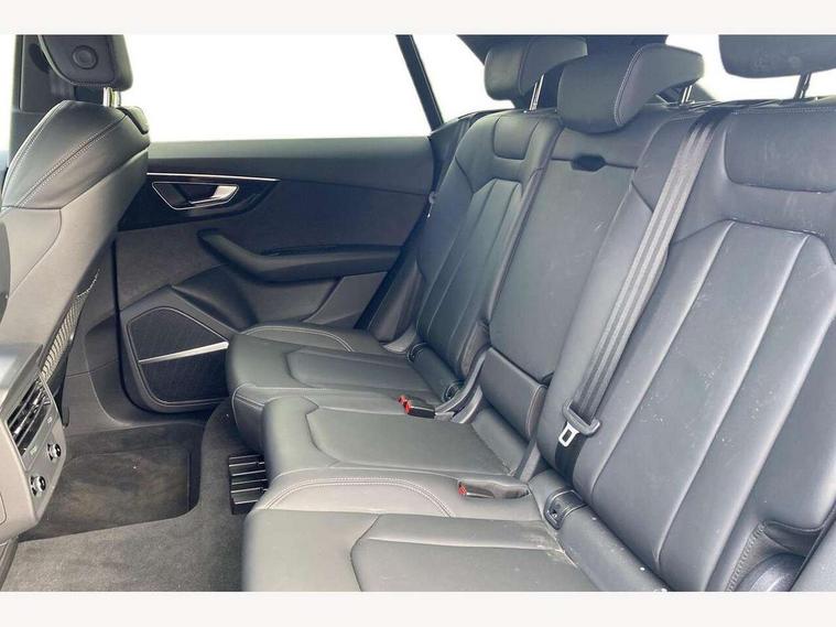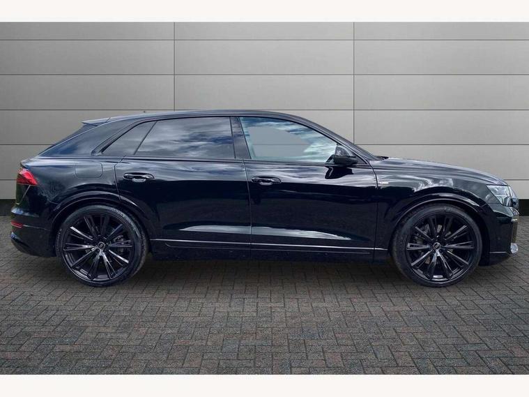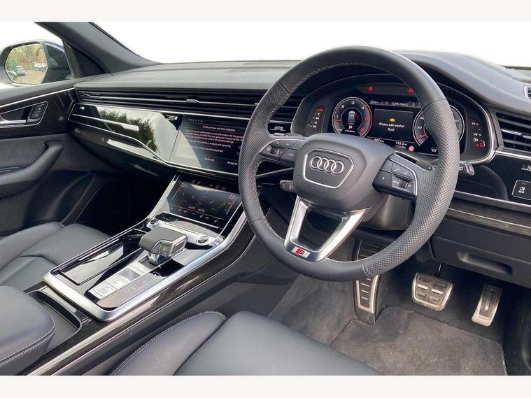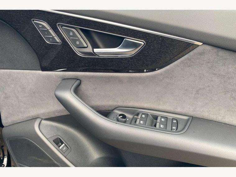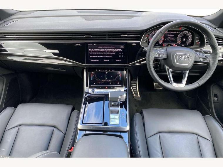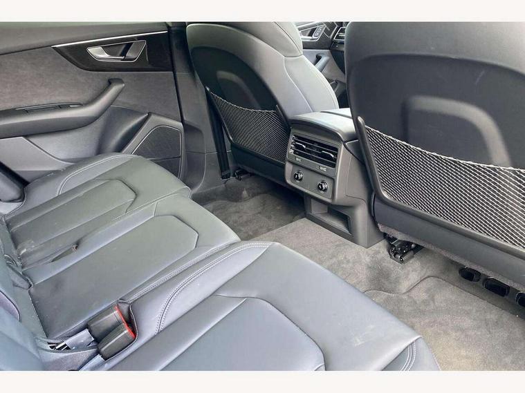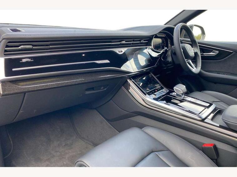 10.1" and 8.6" Dual colour touchscreens, Audi application store, Audi connect safety and service (e-call), Audi connect with Amazon Alexa Integration, Audi drive select, Audi parking system plus includes 360 degree display with front and rear sensors, Audi phone box light with wireless charging, Audi virtual cockpit - 12.3" high resolution LCD display with fully customisable instrument cluster, Automatic start/stop system, Bluetooth, Electro-mechanical PAS, Low washer fluid indicator, MMI navigation plus with MMI touch, Natural voice recognition, On board computer, Operating buttons in black, glass look with haptic feedback, Power operated tailgate, Rear view camera, Service interval indicator, Smartphone interface includes wireless Apple carplay/Android Auto, 48V Mild hybrid technology, Adaptive sport air suspension, Diesel particulate filter, Quattro all wheel drive with self locking centre differential, Audi music interface with 2 USB ports with charge and data functions, Audi sound system with 6 channel amplifier, 180 watt amplifying capacity and 10 loudspeakers including subwoofer, Aux-in socket, DAB Digital radio, 3rd brake light, Audi beam, Auto dimming frameless rear view mirror, Black exhaust tailpipes, Black single frame mask, Coming/leaving home lighting function, Electric front+rear windows, Electrically folding auto dimming/adjustable/heated door mirrors with memory function, LED side indicators and kerb view function for passenger side, Headlight washers, Heat insulating glass in windshield, LED rear light plus, LED signature daytime running lights, Loading edge protection in stainless steel, Matrix LED headlights with dynamic front and rear indicators, Platinum grey front spoiler lip and diffuser insert with honeycomb grille in black, Privacy glass - dark tinted rear and rear side windows from B-pillar backwards, Rain and light sensors, Rear side wing doors, Rear wiper, Singleframe grille surround in matte platinum grey, 2 zone automatic climate control, 3 bench rear seats in 2nd row, 4-way lumbar support for front seats, 40:20:40 split folding rear bench seat, Black cloth headlining, Comfort front centre armrest, Driver seat memory function, Electrically adjustable front seats, Front head restraints, Front/rear floor mats, Heated front seats, ISOFIX child seat mounting for front passenger seat and 2 outer rear seats with top tether child seat mounting for all 3 rear seats, LED interior ambient lighting, Luggage compartment sill protection in stainless steel, Rear centre armrest with 2 cupholders, Rear headrests, Seat cushion displaceable by 100mm in the ratio 60:40, Single front passenger seat, Stainless steel pedals, Sunvisors with illuminated vanity mirrors, Black styling pack plus - Q8, 3 point seatbelts on all seats, Audi pre sense front, Convenience key with safelock, Driver and front passenger, front side and curtain airbags, Electromechanical parking brake, Electronic Stability Control (ESC) including ABS, ASR and EDL, Front passenger airbag deactivation, Hill descent control, Hill hold assist, Predictive pedestrian protection, Seatbelt monitoring, Traction control, Tyre pressure loss indicator, Warning triangle and first aid kit, Anti theft alarm with tow away protection, Anti-theft wheel bolts and wheel loosening detection, Electronically operated child lock, Immobiliser, Keyless go with remote central locking, Polished oak trim with grey finish inlay, Tool kit, Tyre repair kit,