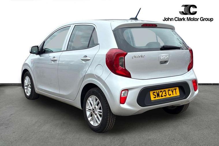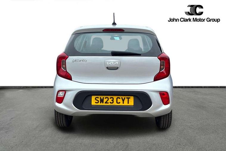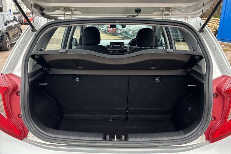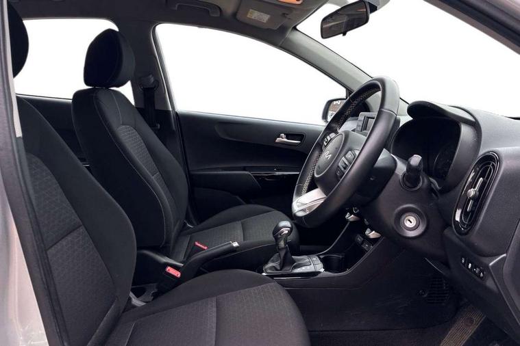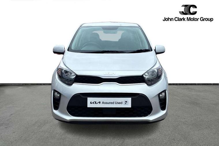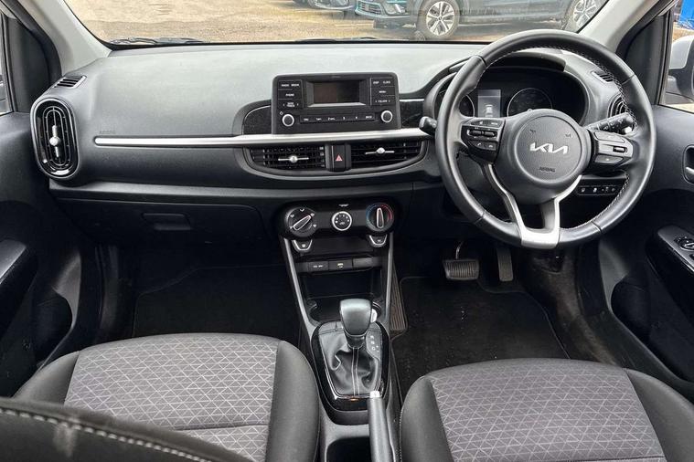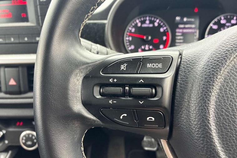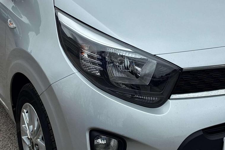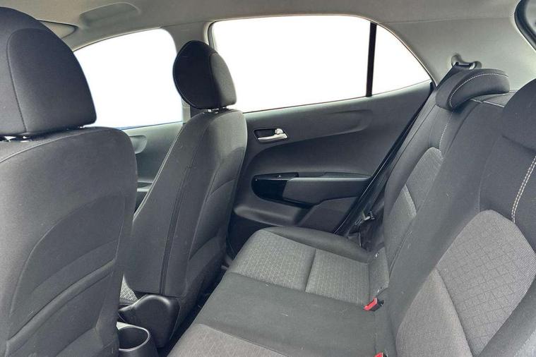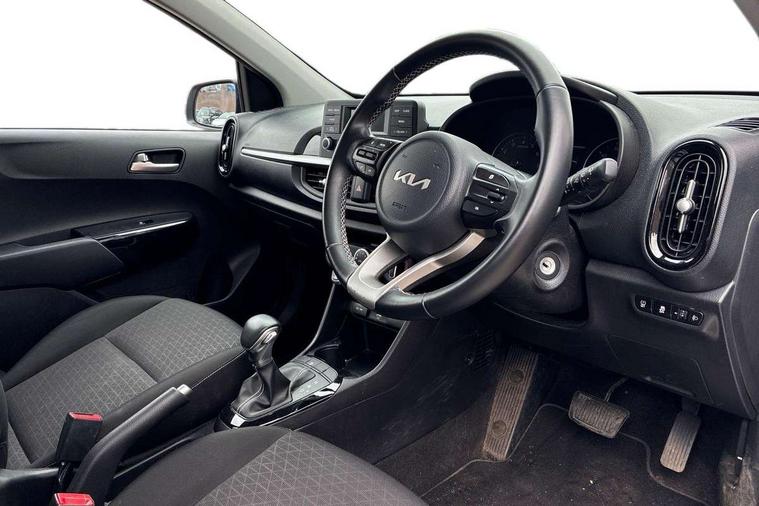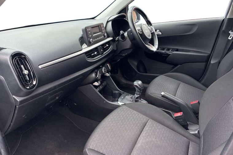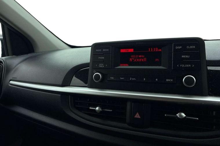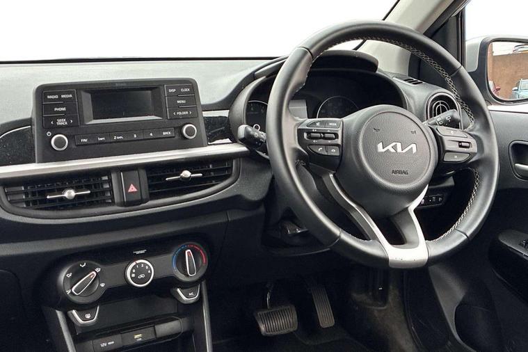 3.8" monochrome audio display with RDS and DAB, Emergency call service, Emergency stop signalling system, External temperature gauge, Motor driven power steering, Tachometer, Tailgate, Trip computer, 4 speaker audio system, Bluetooth with music streaming, Steering wheel mounted controls, USB ports for connection of a media device, Automatic headlight control system, Black radiator grille with chrome surround, Body colour bumpers, Body colour mirrors and door handles, Day/night rear view mirror, Daytime running lights, Electric adjustable heated door mirrors, Front and rear electric windows with drivers's auto up/down function, Headlamp levelling, Heated rear window, High mount brake light, MFR - Multi Focus Reflector halogen headlights with black bezel, Rain sensor, Rear fog lights, Rear side wing doors, Rear wash/wipe, Speed variable front wipers, Tinted glass, Visible VIN plate, Welcome and follow-me home light functionality, 1 x rear coat hook, 12V power point front, 2 seat bench in 2nd row, 3 x passenger assist grips, 60/40 split/folding 2nd row of seats, All round height adjustable headrests, Cupholders in centre console, Driver and front passenger sunvisor with vanity mirror, Driver seat height adjust, Front cabin lights, Glovebox, High gloss lower centre fascia trim, door armrest and air vents, ISOFIX Child seat top tethers and anchor fixings, Leather trimmed steering wheel and gearshift, Luggage area light, Luggage area parcel shelf, Manual air conditioning, Passenger front seatback pockets, Premium cloth upholstery, Silver paint finished interior door handles, Single front passenger seat, Slide/reclining front seats, Tilt adjustable steering wheel, Advanced Driver Assistance Pack - Picanto, 2 x 3-point rear seatbelts, ABS/EBD, Automatic unlocking of doors in case of impact, Dual front airbags, ESC + BAS + VSM + HAC, Front passenger airbag cut-off switch, Front seatbelt height adjusters, Front seatbelt pretensioners + load limiters, Hill hold control, Knee airbags, Rear child proof door locks, Seatbelt warning, Side impact protection, Torque vectoring brake based and straight line stability (SLS), Traction control, Twin curtain airbags, Twin front side airbags, Tyre pressure monitoring system, Anti theft alarm, Engine immobiliser, Folding key, Locking wheel nuts, Remote central door locking, 14" alloy wheels, Tyre mobility kit,