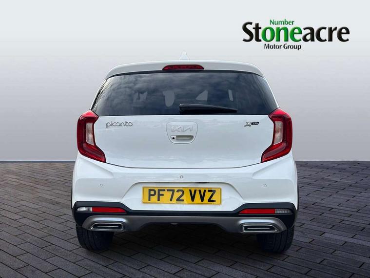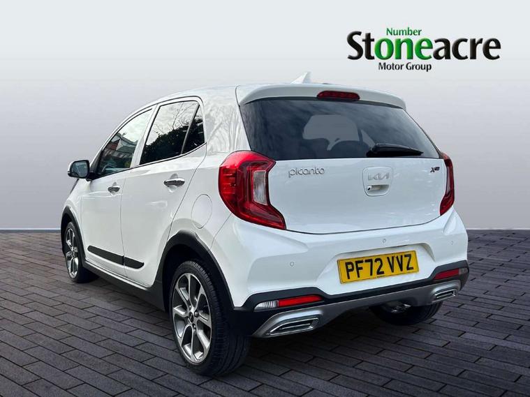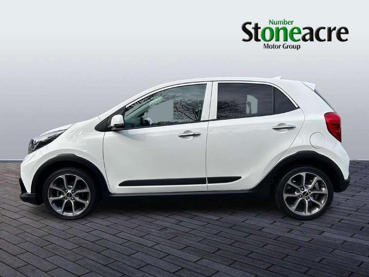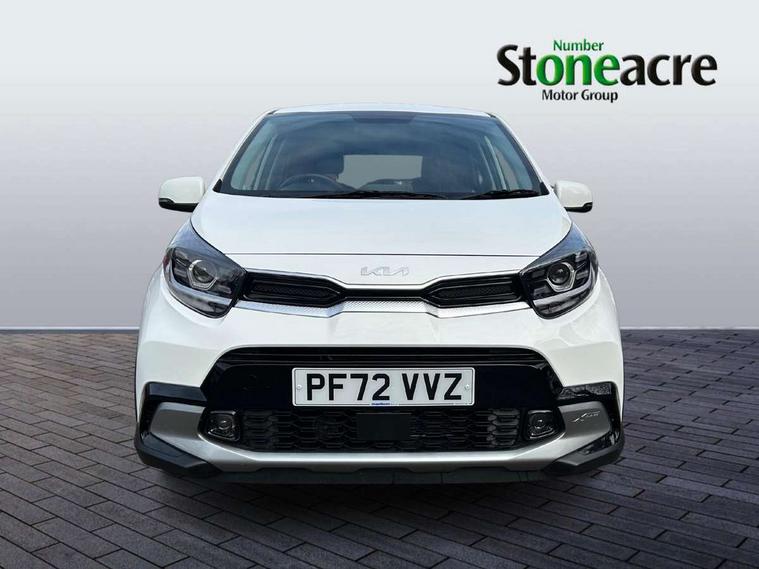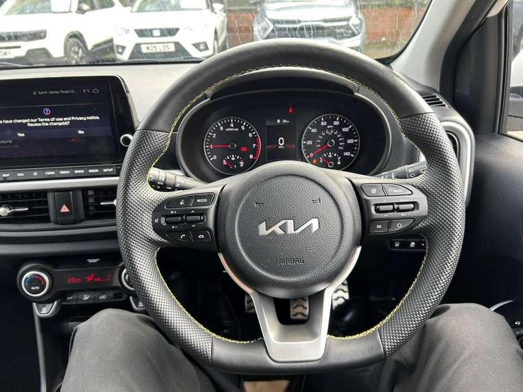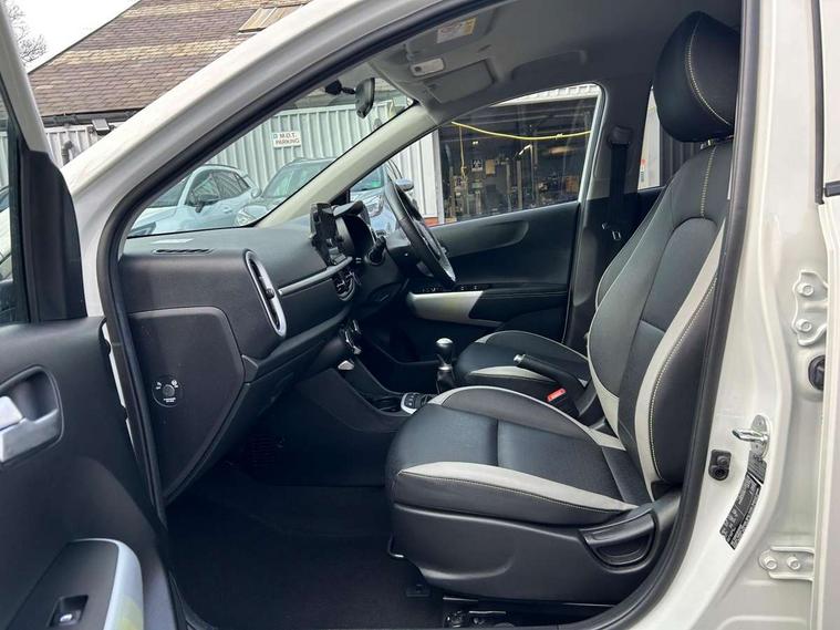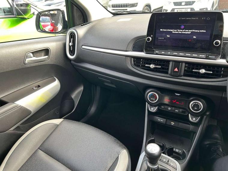 8" touch screen satellite naviagtion with RDS and DAB with telematics, Apple car play/Android Auto with voice control, Cruise control + speed limiter, Emergency call service, Emergency stop signalling system, External temperature gauge, Kia Connect (UVO), Motor driven power steering, Rear parking sensors, Reversing camera system with dynamic guidelines (Integrated into centre fascia screen), Tachometer, Trip computer, Wireless Smartphone charger, 6 speaker audio system, Bluetooth with music streaming, Steering wheel mounted controls, USB ports for connection of a media device, Automatic headlight control system, Bi-function projection headlights, Black beltline mouldings, Black grille with silver surround, Black side sill moulding, Black wheel arch cladding, Body colour B pillars, Body colour bumpers, Body coloured mirrors and chrome exterior handles, Day/night rear view mirror, Electric adjustable/heated/folding door mirrors with LED indicators lights, Front and rear bumpers with silver skid plates and twin exhaust, Front and rear electric windows with drivers's auto up/down function, Front fog lights, Headlamp levelling, Heated rear window, High mount brake light, LED daytime running lights, LED rear fog lights, LED rear lights, Privacy glass - Rear windows and tailgate, Rain sensor, Rear side wing doors, Rear wash/wipe, Speed variable front wipers, Tinted glass, Visible VIN plate, Welcome and follow-me home light functionality, 1 x rear coat hook, 12V power point front, 3 seat bench in 2nd row, 3 x passenger assist grips, 60/40 split/folding 2nd row of seats, All round height adjustable headrests, Automatic air conditioning, Centre Console with Storage Box and Sliding Armrest, Cupholders in centre console, D-cut steering wheel with green stitching, Driver and front passenger sunvisors with driver's side illuminated vanity mirrors, Driver seat height adjust, Dual Height Luggage Area Floor, Faux leather upholstery, Front cabin lights, Glovebox, Heated front seats, Heated steering wheel, ISOFIX Child seat top tethers and anchor fixings, Leather trimmed steering wheel and gearshift, Luggage area light, Luggage area parcel shelf, Metal pedals, Passenger front seatback pockets, Satin chrome interior door handles, Silver and green accents on door armrests, lower centre console trim and air vents, Single front passenger seat, Slide/reclining front seats, Tilt adjustable steering wheel, Advanced Driver Assistance Pack - Picanto, 3x3 point rear seatbelts, ABS/EBD, Automatic unlocking of doors in case of impact, Dual front airbags, ESC + BAS + VSM + HAC, Front passenger airbag cut-off switch, Front seatbelt height adjusters, Front seatbelt pretensioners + load limiters, Hill hold control, Knee airbags, Rear child proof door locks, Seatbelt warning, Side impact protection, Torque vectoring brake based and straight line stability (SLS), Traction control, Twin curtain airbags, Twin front side airbags, Tyre pressure monitoring system, Anti theft alarm, Engine immobiliser, Locking wheel nuts, Smart key with engine start/stop button, 16" alloy X-Line wheels, Tyre mobility kit,