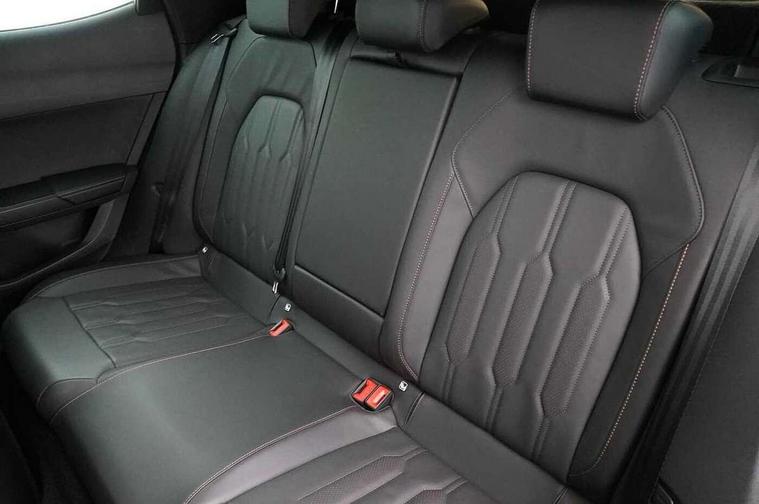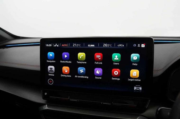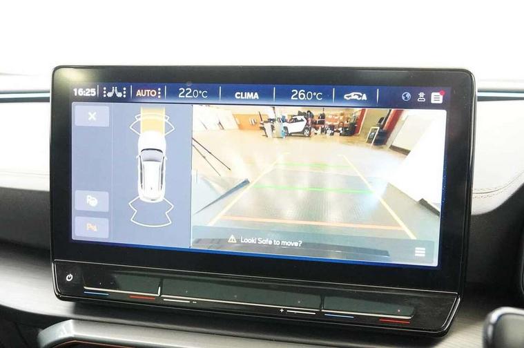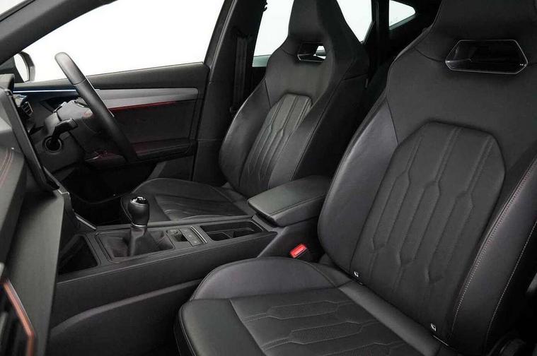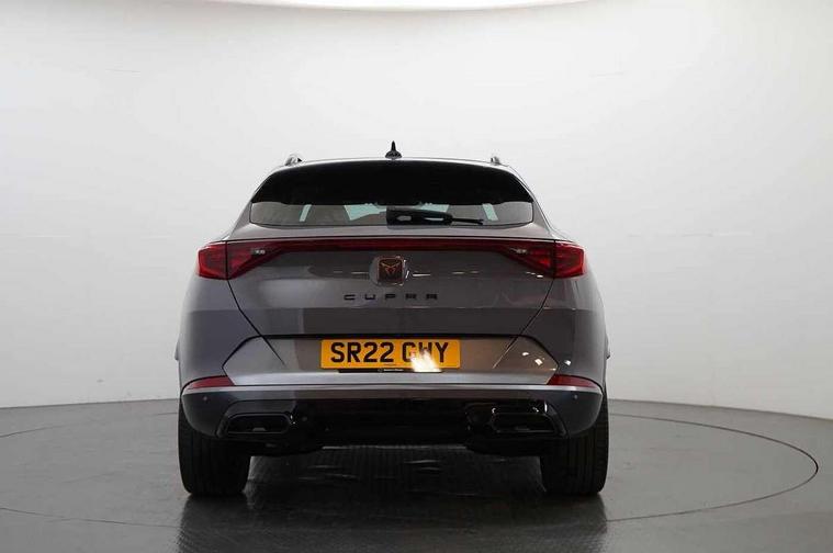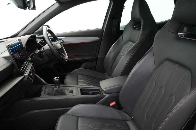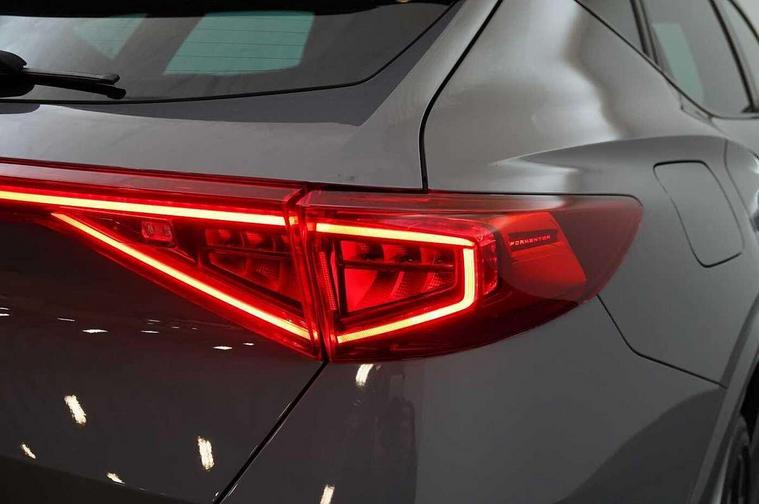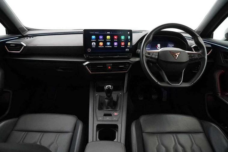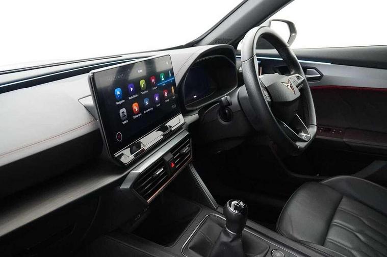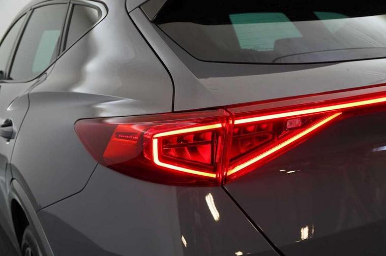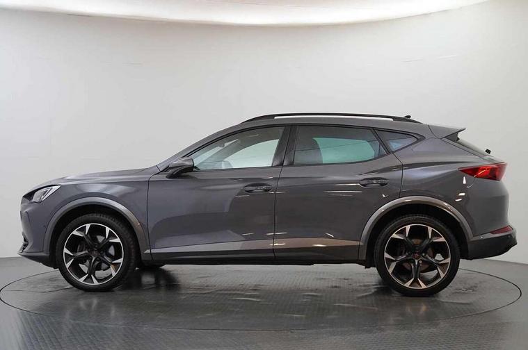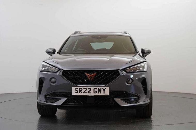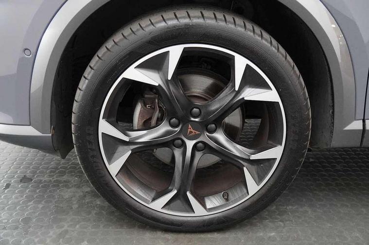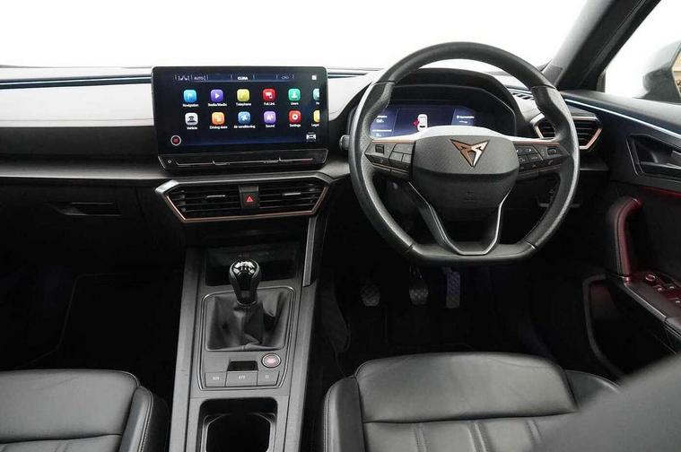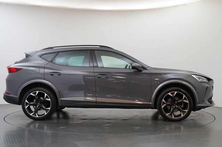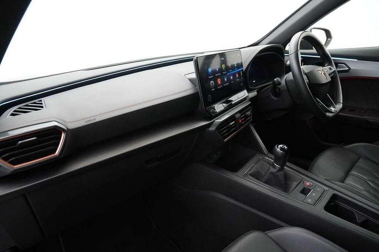 Digital cockpit and configurable dashboard, Driver alert system, Driving profile selection, E-call, Forward collision warning with automatic braking, Lane assist, Navigation system with 12'' Touchscreen Display, Park assist (inc front/rear parking sensors), PAS, Predictive adaptive cruise control with speed limiter, Rear view camera, RPM, trip computer, outside temp gauge, instrument light brightness, low fuel warning light, lights on reminder, gearshift indicator, Service interval indicator, Start/stop system with regenerative braking, Voice control system, Wireless apple carplay, Wireless phone charger, Electronic locking differential and dynamic traction support, Standard suspension, 2 front and 2 rear USB type C sockets, Auxiliary input socket, DAB radio, Auto dimming rear view mirror, Body colour door handles, Body coloured bumpers, Dark grey wing mirror, Daytime running light with automatic headlight control and coming home feature, Dynamic headlight range control, Electric front/rear windows, Electrically adjustable heated and folding door mirrors with memory function, Front fog lamps with cornering function, Gloss black roof rails and window surrounds, LED Headlights, LED Taillights with dynamic indicator, Rain sensing wipers, Rear diffuser with black simulated exhaust pipes, Rear side wing doors, Rear wash/wipe, Third brake light, Tinted rear windows, Welcome lights, 12v power supply in centre console, 12V socket, 12v socket in loadspace, 2 front and 2 rear reading lights, 230V socket, 3 seat bench in 2nd row, 60/40 split rear bench seat with armrest and mechanical seat release, Dust/pollen filter, Front and rear head restraints, Front centre armrest, Height/reach adjust steering wheel, Illuminated interior front door sills, Illuminated sunvisor with mirror, Isofix, Leather multi function steering wheel, Luggage tie-down hooks, Single front passenger seat, Three zone climate control with control panel in rear, Variable luggage/load compartment floor, Wraparound lighting, Genuine Nappa leather Pack - Cupra, Safety and driving pack (M) - Formentor, 3 point seatbelts on all rear seats, ABS, Brake control system - ESC and brake booster, Child proof door locks, Driver and front passenger airbags with front passenger airbag de-activation, Electronic parking brake, Front and rear disc brakes, Front side curtain airbags, Hill hold control, Seat belt reminder for front and rear seats, Tyre pressure monitoring system, Anti theft alarm system, Keyless entry and start system (KESSY), Locking wheel bolts, Copper and aluminium interior detailing, 19" 'Exclusive' machined sport matte black and silver alloy wheels,