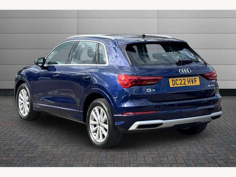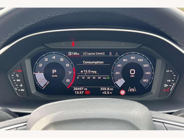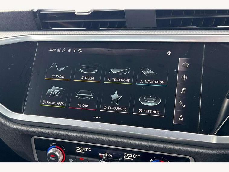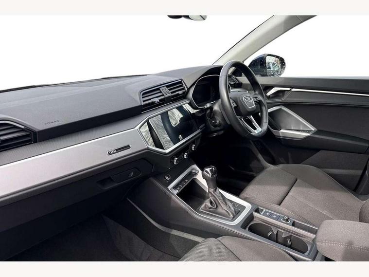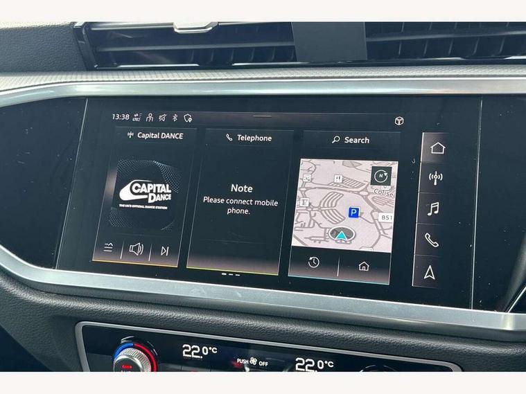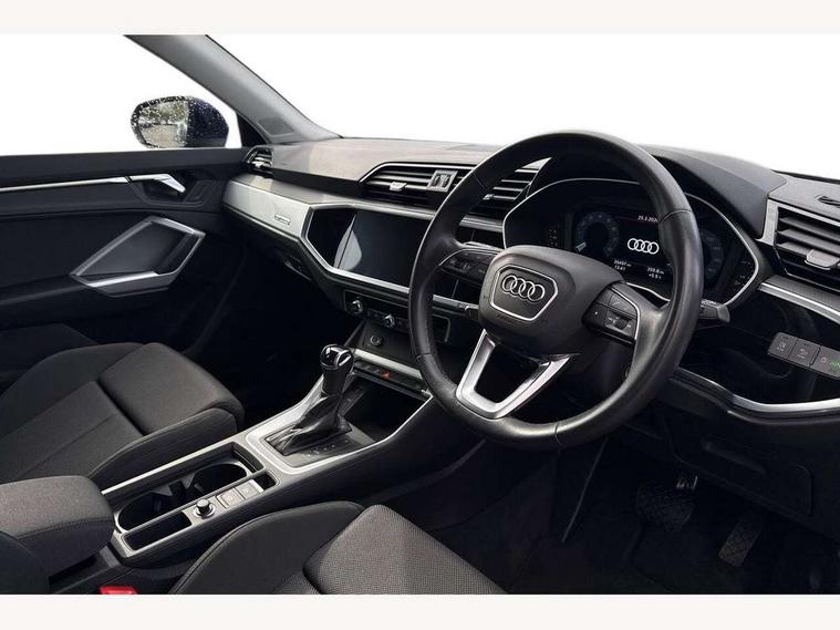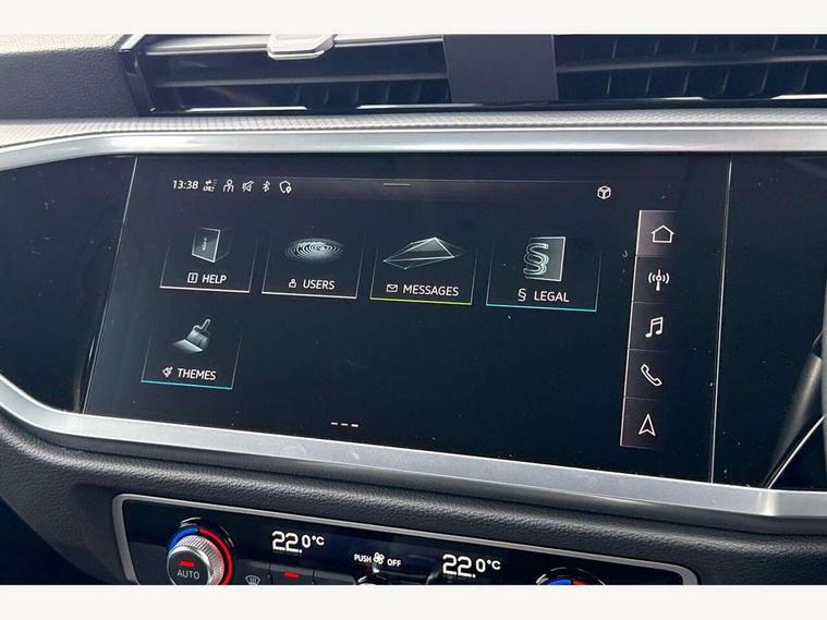 Amazon alexa Integration, Audi connect safety and service, Audi drive select, Audi lane departure warning, Audi Virtual Cockpit - 10.25" display, Bluetooth interface, Camera based traffic sign recognition, Distraction and Fatigue warning, Legal emergency call, MMI Navigation Plus with high resolution 10.1 inch touchscreen colour display, Phonebox light with wireless charging, Power operated tailgate, Progressive steering, Reversing camera, Service interval indicator, Smartphone interface includes wireless Apple carplay/Android Auto, Start stop system with recuperation, Voice control system with natural language interaction, Standard suspension, 2 USB-C ports with charge and data functions, DAB digital radio module, SONOS premium sound system, Acoustic windscreen, Aluminium roof rails, Aluminium window trim, Anthracite black radiator grille, Auto dimming door mirrors, Auto dimming frameless rear view mirror, Electrically folding, adjustable and heated door mirrors with integrated LED side indicators and kerb view function for passenger side, Front and rear bumpers, wheel arch trims and side sill trims in contrasting Manhattan grey paint finish, Front and rear electric windows, Front fog lights, Front side air inlets in matt selenite silver, Front spoiler in matt selenite silver, Grille vertical bars in aluminium silver/Matt, High gloss black finish B and C pillars, LED headlights with LED daytime running lights, LED third brake light, Rain and light sensors, Rear diffuser strip in matt selenite silver, Rear side wing doors, Rear wiper, Variable front intermittent wipers, 12V socket in rear centre console, 3 seat bench in 2nd row, 3 spoke multi-function leather steering wheel, 40:20:40 folding with manual adjustment for 60:40 forwards/backwards position and backrest angle, Black carpet mats, Door sill trims with aluminium inlay, Dual zone electronic climate control, Electric lumbar support, Front and rear floor mats, Front and rear headrests, Front centre armrest, Heated front seats, Height and reach adjustable steering wheel, ISOFIX child seat mounting for front passenger with airbag deactivation and outer rear seat including top tether attachment point for outer rear seats, Luggage compartment sill protection in stainless steel, Lunar silver cloth headlining, Manual front seats with height adjustment, Single front passenger seat, Non smoking pack - Q3, 3x3 point rear seatbelts, 6 airbags - Driver, front passenger, curtain and side windows, Audi pre-sense front with pedestrain and cyclist recognition, Electrically operated child locks on rear doors, Electromechanical parking brake, Electronic stabilisation control including ABS, ASR and EDL, Front seatbelt reminder, Hill descent control, Hill hold assist, Pre sense basic, Seatbelt monitoring, Tyre pressure warning, Warning triangle and first aid kit, Anti theft wheel bolts, Immobiliser, Remote central locking, Thatcham approved category 1 anti theft alarm, Aluminium look interior elements, Detail dashboard around MMI touch colour display in glass look, black with surround in aluminium look, Micrometallic silver inlay,