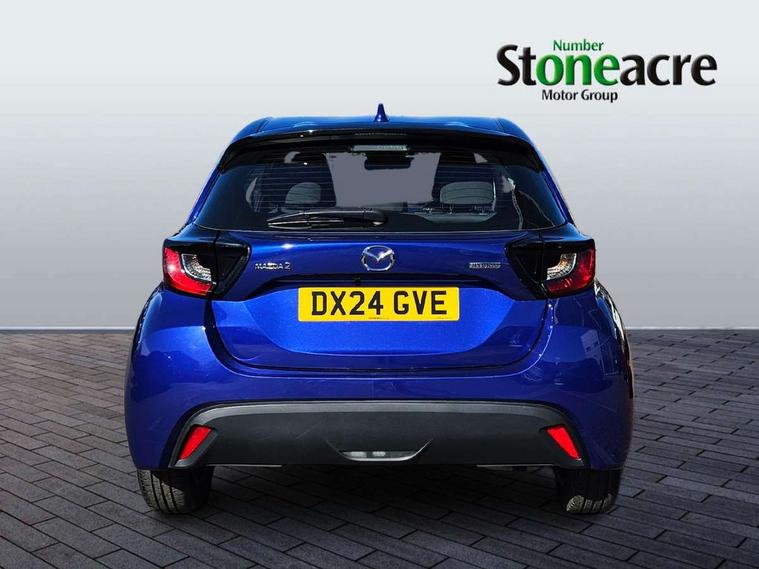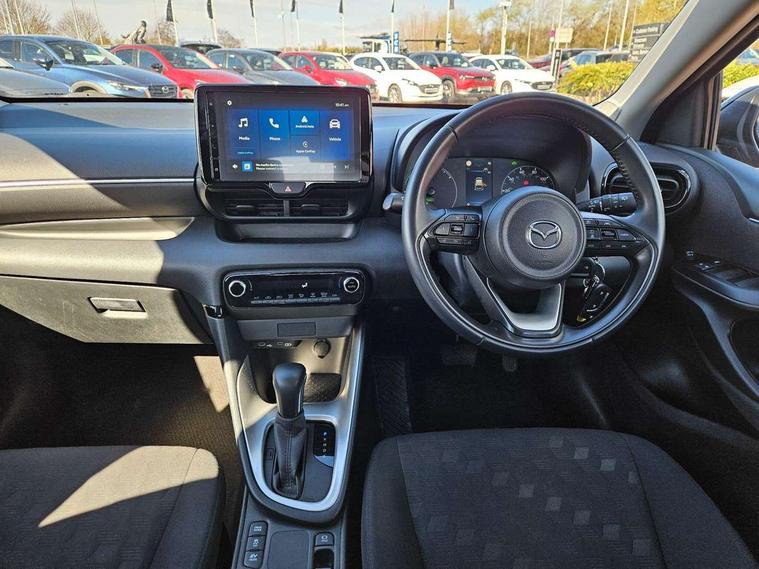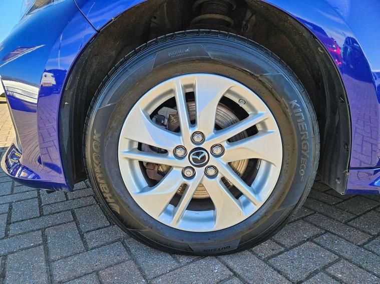 Adjustable speed limiter, Analogue instrument cluster with speedometer and hybrid system indicator, Drive mode selector (Eco, Normal and Power), Driver attention alert system, Dynamic radar cruise control, E-call with GPS, EV drive mode, Integrated bluetooth, Lane tracing assist includes Lane centering, Lane departure alert, Steering assist and Vehicle sway warning, Multi-information display, PAS, Reversing camera, Road sign assist - RSA, Service indicator, Tailgate, Trip computer, Wireless Apple CarPlay and wired Android Auto, i-stop, 6 speaker audio system and 9" colour screen centre display, DAB Digital radio, Steering wheel mounted audio/bluetooth controls, USB type C port, Automatic high beam - AHB, Black lower window garnish, Body coloured front bumper, Body coloured rear bumper with satin black lower mouldings, Coming home function, Dusk sensing headlights, Front and rear electric windows, Gloss black electric adjustable/heated door mirrors, Gloss black front grille, Gloss black rear roof spoiler, Halogen headlights with manual headlight levelling, Hybrid badge, LED daytime running lights, LED rear combination light with halogen turn signals, LED third brake light, Mazda unique tailgate garnish, Rain sensing front wipers with adjustable sensitivity and speed, Rear side wing doors, Rear wash wiper, Shark fin antenna, 12V power outlet, 3 seat bench in 2nd row, 60/40 split fold down rear seats, Climate control air conditioning, Cloth upholstery, Driver, front passenger and two rear door storage, Driver, Front passenger and two rear grab handles with coathooks, Drivers seat manual slide recline and height adjustment, Drivers/front passengers with covered vanity mirrors, Front centre armrest with console storage, Front head restraints, Glovebox, Grey roof lining in pillar and ceiling, Interior courtesy light, ISOFIX child seat anchorage points attached on outer rear seats, Leather handbrake, Leather wrapped gearshift, Leather wrapped steering wheel with telescopic and tilt adjustment, Luggage compartment light, Single front passenger seat, Three height adjustable rear head restraints, 2x3 point front seatbelts with pre-tensioners, 3 point seatbelts on all rear seats, Airbags - driver and front passenger, Anti-lock braking system (ABS), Collision mitigation braking system, Driver and passenger central airbags, Dynamic stability control + Traction control, Electronic parking brake with auto-hold and auto-disengage function, Emergency brake light signal (EBS), ESP, Front and rear curtain airbags, Front passenger airbag cut-off switch, Front side airbags, Hill start assist control (HAC), Manual child lock in rear doors, Pre-crash safety system - PCS, Regenerative braking system, Seatbelt reminder audible warning, Tyre pressure monitoring system, Deadlocking system, Remote central locking, Thatcham approved immobiliser and alarm, 15" Alloy wheels, Emergency tyre repair kit,