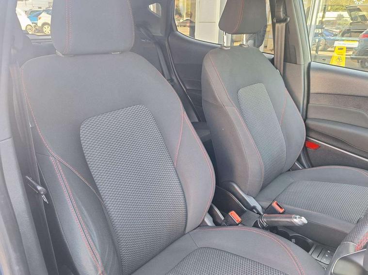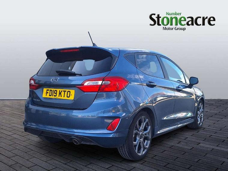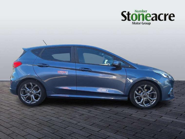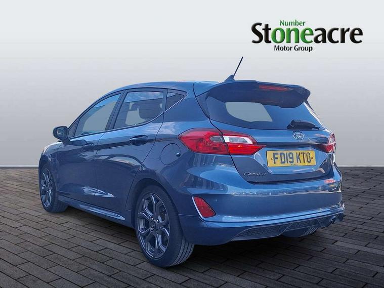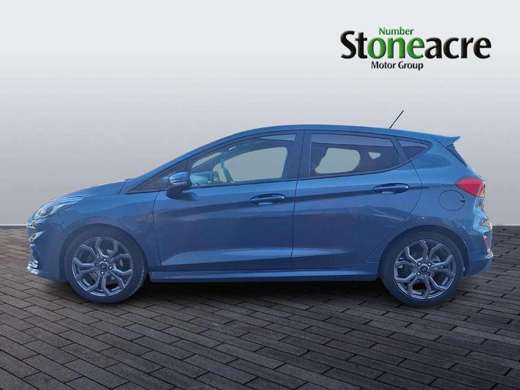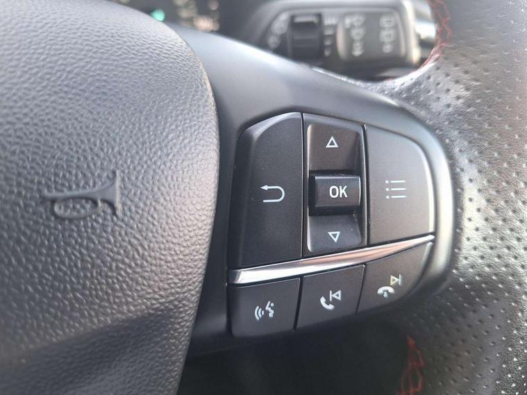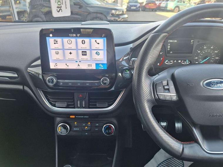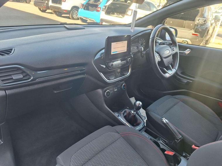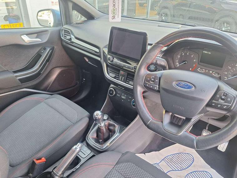 NCAP Pack - Fiesta, Keyless start with 'Ford Power' starter button, MyKey system, Remote central locking & engine immobiliser, Thatcham Cat.1 alarm, 2 USB ports, Auxiliary input socket, DAB Digital radio, Steering wheel mounted controls, 3 point seatbelts on all rear seats, ABS+EBA, Curtain airbags, Driver and passenger airbags, Drivers knee airbag, Electronic stability control with hill start assist, Front passenger airbag deactivation, Front side airbags, Seatbelt warning, Tyre pressure monitoring system, Automatic headlights, Body colour bumpers, Body colour door handles, Body colour electric adjustable heated door mirrors with integral indicators, Body colour large rear spoiler, Chrome door handles, Chrome lower window surround, Cornering front fog lights, Electric front windows/one touch facility, Quickclear heated windscreen, Rear wiper, Rugged body styling kit with active front wing badges, Tinted glass, Unique ST-Line upper grille & full bodystyling kit with ST-Line wing badges, 12V Accessory socket in centre console, 3 spoke flat bottomed leather steering wheel, 60/40 split folding rear seat, Adjustable head restraints, Ambient lighting, Black headlining, Boot carpet, Centre console with armrest and illuminated cupholders, Chrome inner door handles, Cloth upholstery, Footwell illumination, Front and rear velour floor mats, Front map reading lights, Front seat and rear pockets, Height adjustable driver's seat, Illuminated glovebox, Leather gear knob, Leather trimmed handbrake handle, Load area light, Manual air conditioning, Overhead console with sunglasses holder, Pollen filter, Rake/reach adjustable steering wheel, Rear centre head restraint, Sports front seats, Sports pedals, Bluetooth system, Electric power steering, Ford easy fuel, Trip computer, Sports suspension,
