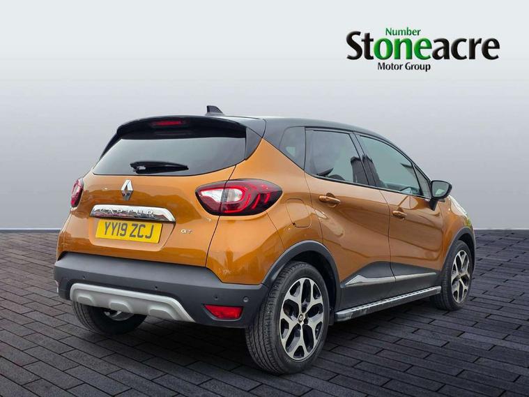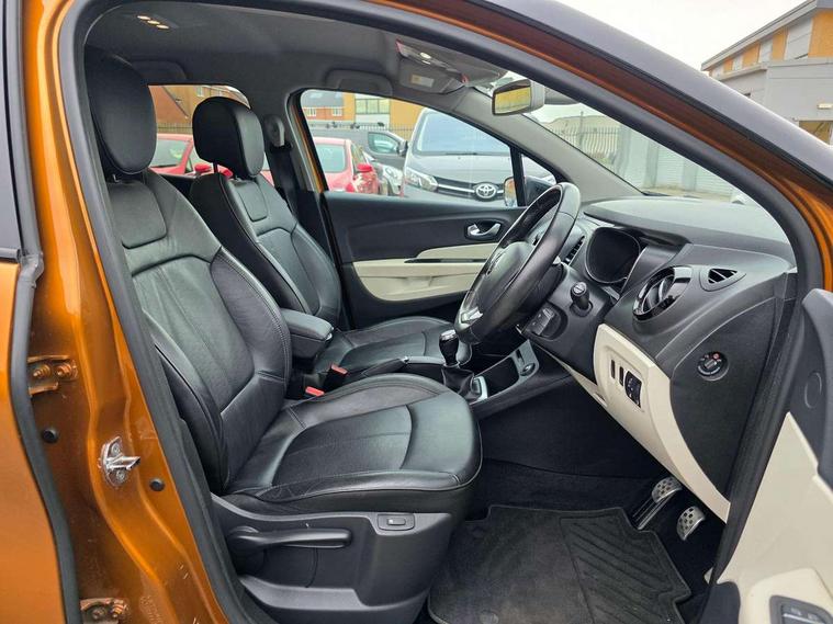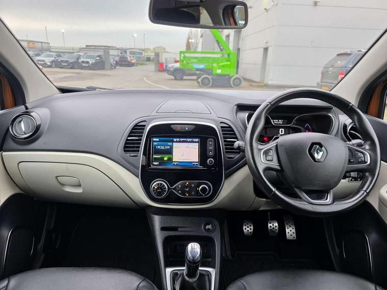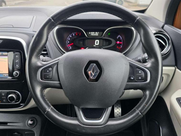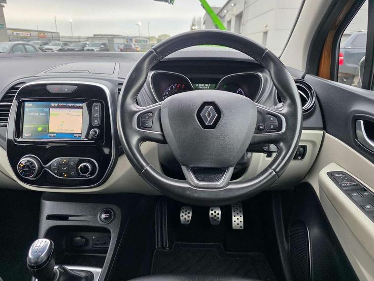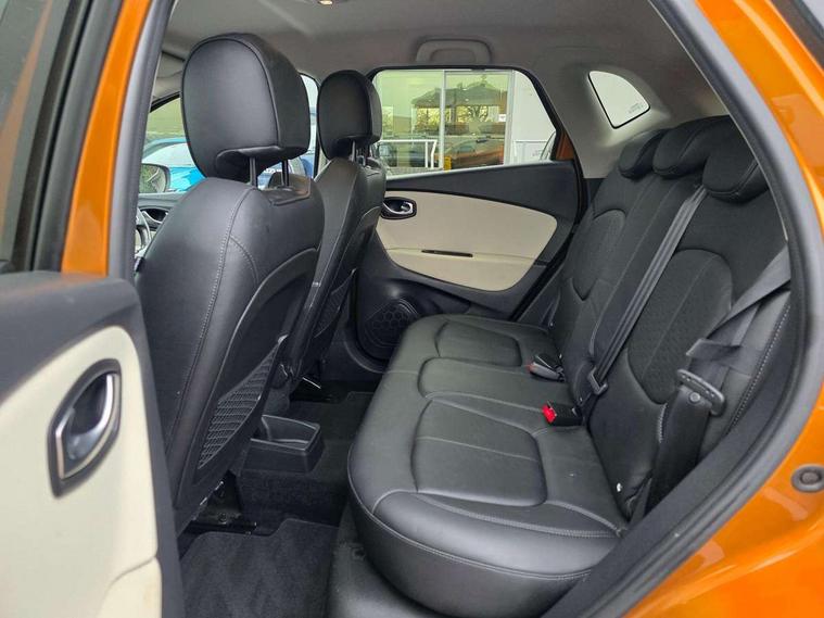 Cruise control + speed limiter, Eco mode, Handsfree parking with side moulding and blind spot warning, Smartphone cradle, Trip computer, Variable PAS, Auxiliary input socket, Body colour door handles, Body coloured bumpers, Electric adjustable/heated/folding door mirrors, Electric front windows + one touch + anti-pinch, Electric rear windows, Extra tinted glass in rear windows and tailgate, Grey front and rear skid plate, LED daytime running lights, LED front fog lights with static cornering light function, Rain sensitive wipers + automatic lighting, Rear wiper, Variable intermittent front wash/wipe, 12V Accessory socket, 3 rear headrests, 60/40 split folding rear seat bench, Automatic climate control with one touch demist function, Centre console storage tray, Compartment in glovebox, Front centre armrest, Front cupholder, Front seat backrest storage nets, Heated front seats, Heating system with pollen filter, Height adjustable driver's seat, Height adjustable front headrests, Height/reach adjust steering wheel, ISOFIX on front passenger and rear outer seats, Leather steering wheel and gear knob, Light harmony dashboard and door panels, Part leather/cloth upholstery, Removable storage between driver and passenger, Reversible boot floor, Storage area on top of dashboard, Storage compartments in doors, Storage space near handbrake, Variable boot floor, Exterior touch pack Chrome - Captur, Interior touch pack Chrome - Captur, Premium pack - Captur, Techno pack with front and rear parking sensors - Captur, 3 point seatbelts on all rear seats, ABS+EBA, Driver/Front Passenger airbags, ESC - Electronic Stability Control + traction control, Front passenger airbag deactivation, Front side airbags(head+thorax), Hill start assist, Rear door child safety locks, Seatbelt warning, Tyre pressure monitor, Automatic door locking, Deadlocking system, Hands free access with keycard and start button, RAID (Renault Anti-Intruder Device) with automatic door locking, Remote central locking, Thatcham Cat 2 engine immobiliser, 17" Emotion alloy wheels with black insert,