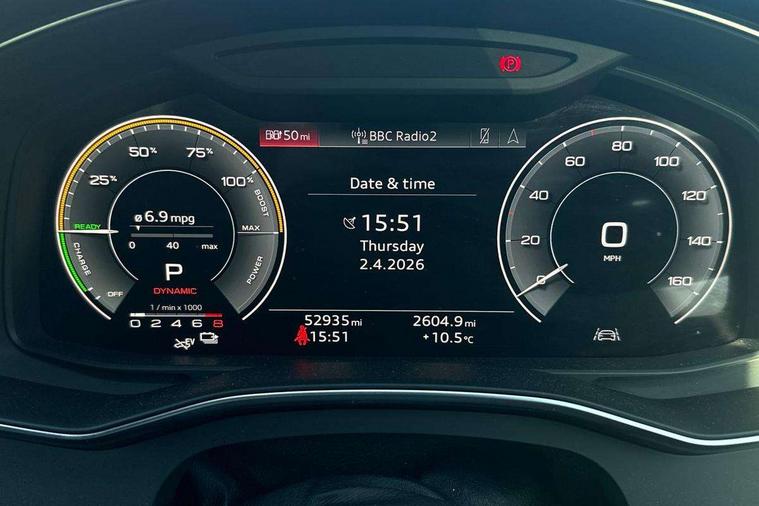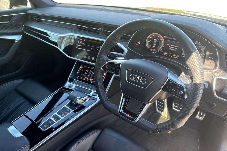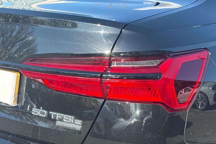 7" high resolution colour driver information display system, Audi connect safety and service (e-call), Audi connect with Amazon Alexa Integration, Audi drive select, Audi parking system plus - acoustic and visual park assist system for front and rear, Audi smartphone interface includes wireless Apple carplay/Android Auto, Automatic start/stop system with coasting functionality, Bluetooth interface, Electric boot lid release, Lane departure warning system, Progressive steering, Rear view camera, Service interval indicator, Voice control system, 3 pin 10 amp domestic charging cable, 52 litre fuel tank, 7.4 kW onboard charger, Hybrid propulsion system, Quattro on demand, Sports suspension, Type 2 mode 3 32 amp charging cable, Type 2 socket for AC charging, Audi front music interface, Audi sound system, Auxiliary input socket, DAB Digital radio, USB connection, Electric front/rear windows, Frameless auto dimming interior rear view mirror, Front intermittent wipers, Gloss black highlights on the exterior area of the Audi Single frame, Gloss black highlights on the front and rear bumpers, Gloss black highlights on the radiator grille, Gloss black highlights on the side windows trim strips, Headlight washers, Heat insulating glass in side and rear windows, Heat insulating glass in windshield, LED signature front daytime running light, LED third brake light, Matrix LED headlights, Matt black rear diffuser with diffuser strip and tailpipes in chrome, Matt black side air intake grille with inlay in matt aluminium, Privacy glass, Rain and light sensors, Rear boot, Rear side wing doors, Signature rear LED light design, 4 way electric lumbar support for driver and front passenger, 4 zone deluxe automatic climate control, 40/20/40 split folding 3 rear seat bench in 3 parts with rear centre armrest, Black cloth headlining, Black front and rear carpet floor mat, Black steering wheel insert, Electrically adjustable front seats with driver memory, Front centre armrest, Front head restraints, Heated front seats, Height/reach adjust steering wheel, Illuminated door sill trims with S logo, Illuminated sun visors with vanity mirrors, ISOFIX child seat mounting and Top Tether with front passenger airbag deactivation, Leather gear knob, Rear headrests, Single front passenger seat, Stainless steel pedals and foot rest, Tool kit, LED Interior Ambient Lighting Pack - A6, Non smoking pack - A6, Technology pack - A6, 3 point seatbelts on all seats, Airbags - Front side, front and rear including head, Audi pre-sense front, Black seatbelts, EBD - Electronic brakeforce distribution, Electromechanical parking brake, Electronic Stability Control (ESC) including ABS, ASR and EDL, Extended pedestrian protection measures, Manual child proof rear door locks, Seatbelt monitoring, Tyre pressure warning light, Warning triangle and first aid kit, Anti theft alarm with tow away protection, Anti-theft wheel bolts and wheel loosening detection, Immobiliser, Keyless Go, Remote central locking, Carbon twill inlays, 20" 5 V spoke star design Audi sport cast aluminium alloy wheels in matt grey look, Tyre repair kit,