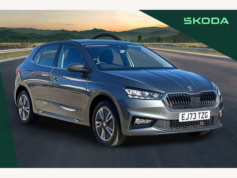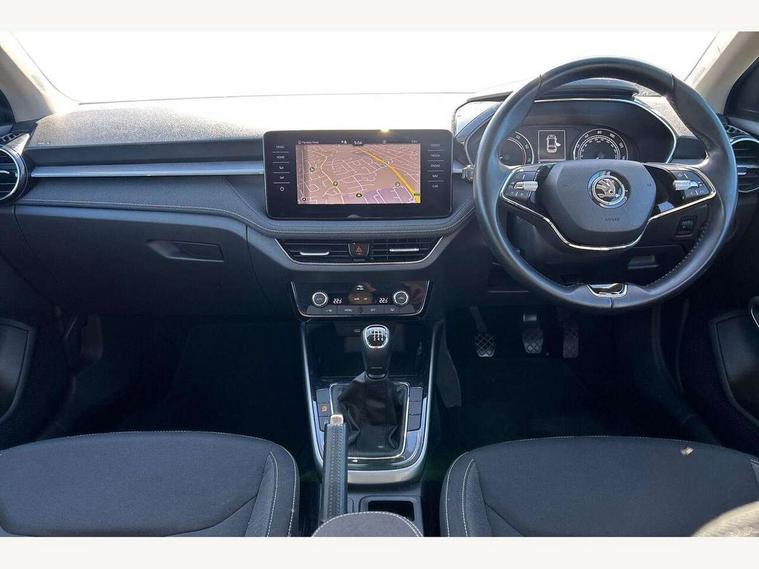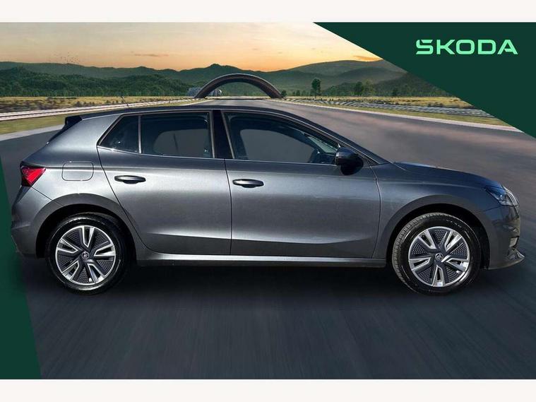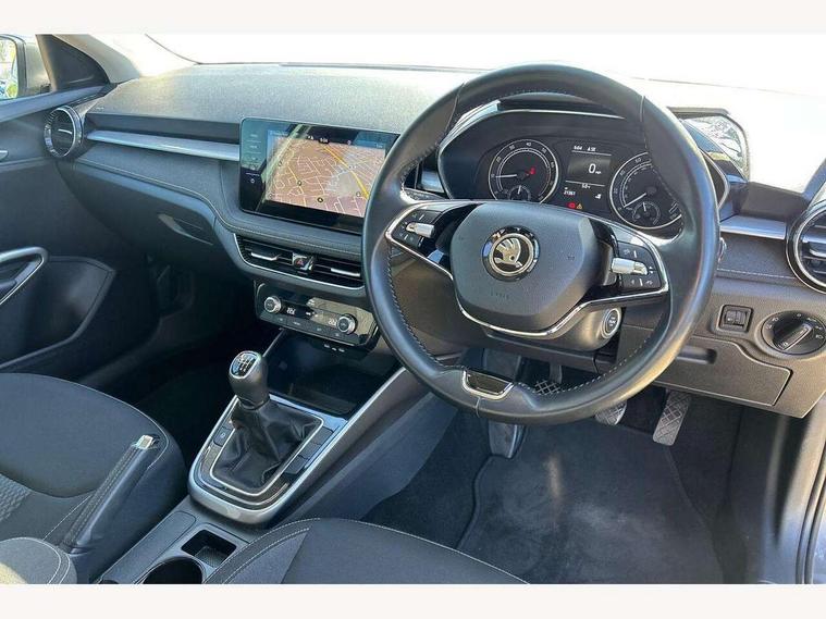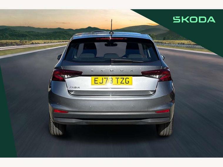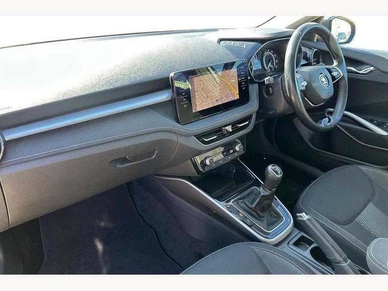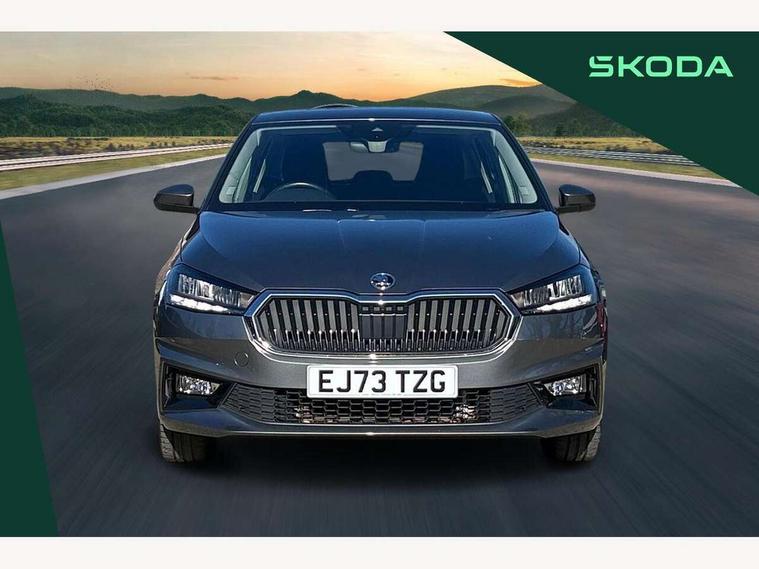 Bluetooth connection, Driver alert system - DAS, Electromechanical power steering, Exterior temperature gauge, Service interval indicator, 2x USB-C in the front (for data transmission and charging), 6 Speakers (4 in front and 2 in rear), Auxiliary socket for external MP3 player, DAB digital radio reception, Web radio, Auto dimming rear view mirror, Body colour door mirrors, Body coloured bumpers, Chrome window surround, Door mirror integrated indicators, Electrically adjustable and heated door mirrors, Front and rear electric windows, Front window wiper intermittent control, Headlight range control - Automatic, Ice scraper in fuel cap, LED daytime running lights with coming and leaving home feature, Rear LED fog light, Rear side wing doors, Rear window wiper with washing nozzles, Roof mounted spoiler, SKODA tailgate lettering in chrome, Third brake light, 3 rear headrests, Backrest split and folding, Central console with fixed cup holder and storage box, Chrome handbrake release button, Comfort seats, Fabric upholstery, Front centre armrest, Gearshift knob/handle in leather, Hand brake lever handle in leather, Height adjustable front headrests, Height adjustable front seats, Height adjustable steering wheel, ISOFIX and TopTether anchorage points to the outer rear seats, ISOFIX and TopTether on the front passenger seat, Luggage compartment lighting, Manually adjustable lumbar support in front seats, Pollen filter, Rear seat bench unsplit, Removable cup holder, Single front passenger seat, Storm grey headlining, Sun visors with mirror and airbag label on passenger side, Textile floor mats, Ticket holder, Umbrella in drivers door, Ambient lighting pack 2 - Fabia Hatchback, 3-point height adjustable front seats belts with pretensioner and force limiter, Automatic warning lights in case of crash, Driver and passengers airbag with switch off function, e-Call+, ESC including ABS, MSR, ASR, EDS, HBA and XDS, Front and rear seat belt warning, FRONT ASSIST (AEB City and AEB Inter Urban), Front side airbags, Head airbags, One tone horn, Pedestrian protection, Three rear 3-points safety seat belts with pretensioner and force limiter including stop function for outer rear seat belts, Tyre pressure monitoring system, Anti-theft alarm system including immobiliser, interior monitoring, backup horn, and towing protection, Chrome edged air vents, Satin black door and side trim panel in front, Anti-theft wheel bolts protection, Super-low rolling resistance tyres,