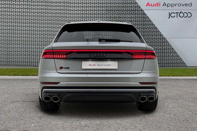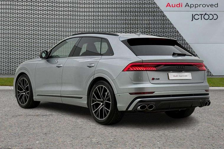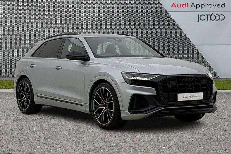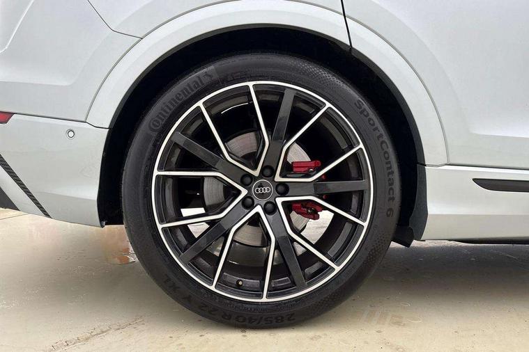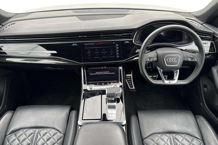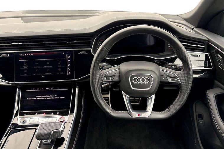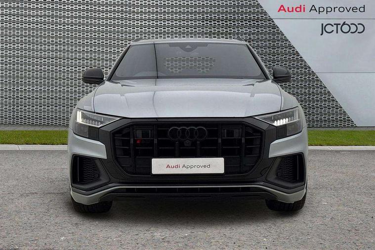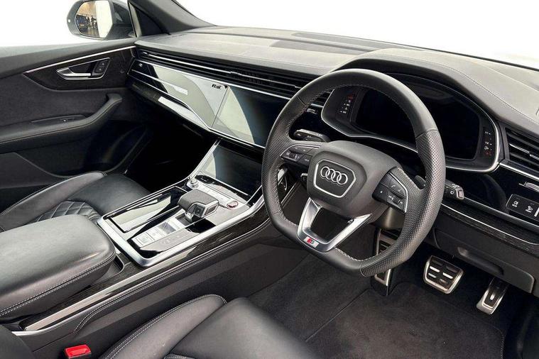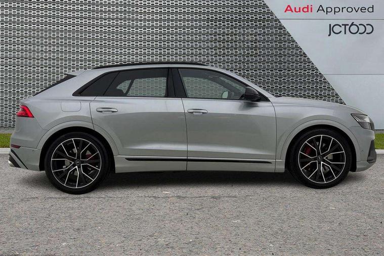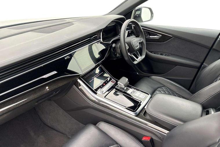10.1" and 8.6" Dual colour touchscreens, All wheel steering, Audi connect safety and service (e-call), Audi connect with Amazon Alexa Integration, Audi drive select, Audi parking system plus includes 360 degree display with front and rear sensors, Audi smartphone interface includes wireless Apple carplay/Android Auto, Audi virtual cockpit - 12.3" high resolution LCD display with fully customisable instrument cluster, Automatic start/stop system, Electro-mechanical PAS, Low washer fluid indicator, MMI - Multi Media Interface control system, MMI navigation plus with MMI touch, Natural voice recognition, On board computer, Operating buttons in black, glass look with haptic feedback, Power operated tailgate, Rear view camera, Service interval indicator, 48V Mild hybrid technology, 85 litre fuel tank, Quattro all wheel drive with self locking centre differential, S specific Adaptive air suspension, Audi music interface with 2 USB ports with charge and data functions, Audi sound system with 6 channel amplifier, 180 watt amplifying capacity and 10 loudspeakers including subwoofer, Aux-in socket, DAB Digital radio, 3rd brake light, Acoustic windscreen, Audi Beam uses LEDs to project the Audi logo, Audi HD Matrix LED headlights with dynamic front and rear indicators, Auto dimming frameless rear view mirror, Body coloured bumpers, Coming/leaving home lighting function, Electric front+rear windows, Electrically folding auto dimming/adjustable/heated door mirrors with memory function, LED side indicators and kerb view function for passenger side, Gloss black finish for exterior Audi rings and SQ8 logo, Headlight washers, Heat insulating glass in windshield, LED signature daytime running lights, Platinum grey front spoiler lip and diffuser insert, Privacy glass - dark tinted rear and rear side windows from B-pillar backwards, Rain and light sensors, Rear side wing doors, Rear wiper, S specific dual brach chrome tailpipes on both the left and right, S specific front and rear bumpers, S specific side skirts in matt selenite silver, Side air inlet grilles in matt anthracite black, Trim and underbody protection in matt selenite silver, 3 bench rear seats in 2nd row, 4 zone deluxe automatic climate control, 4-way lumbar support for front seats, 40:20:40 split folding rear bench seat, Black cloth headlining, Comfort front centre armrest, Driver seat memory function, Electrically adjustable front seats, Front head restraints, Front/rear floor mats, Heated front seats, Illuminated door sill trims, ISOFIX child seat mounting for front passenger seat and 2 outer rear seats with top tether child seat mounting for all 3 rear seats, LED interior ambient lighting, Luggage compartment sill protection in stainless steel, Rear centre armrest with 2 cupholders, Rear headrests, Single front passenger seat, Stainless steel pedals, Sunvisors with illuminated vanity mirrors, Tool kit, Upper and lower interior elements in leather, leather door armrests, Valcona leather upholstery + super sports seats with S embossed logo, Anthracite black Styling Pack - Q8, 3 point seatbelts on all seats, Audi pre sense front, Child locks on rear doors, Driver and front passenger, front side and curtain airbags, Electromechanical parking brake, Electronic Stability Control (ESC) including ABS, ASR and EDL, Front passenger airbag deactivation, Hill descent control, Hill hold assist, Predictive pedestrian protection, Seatbelt monitoring, Traction control, Tyre pressure loss indicator, Warning triangle and first aid kit, Anti theft alarm with tow away protection, Anti-theft wheel bolts and wheel loosening detection, Immobiliser, Keyless go with remote central locking, Polished oak trim with grey finished, Tyre repair kit,