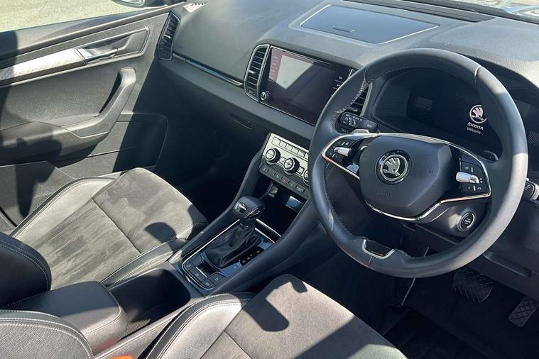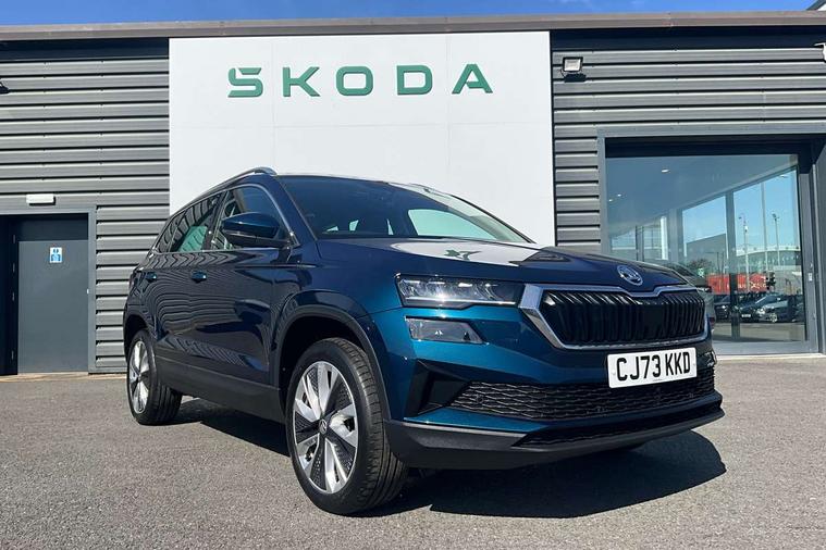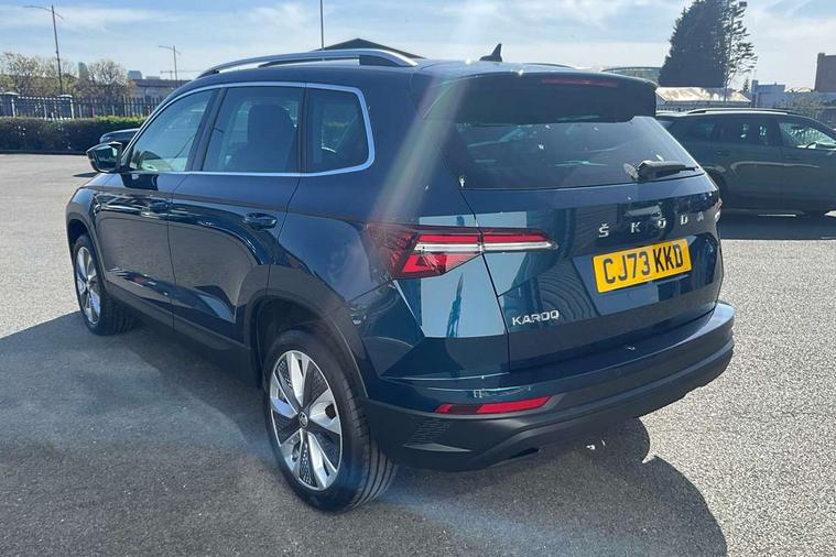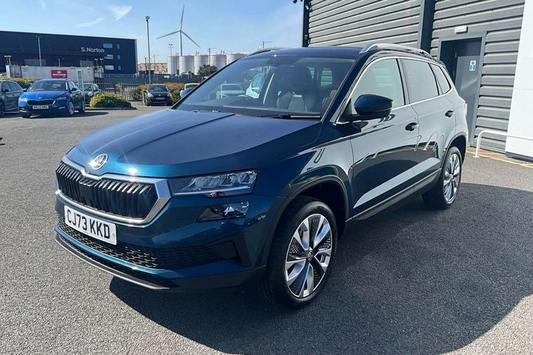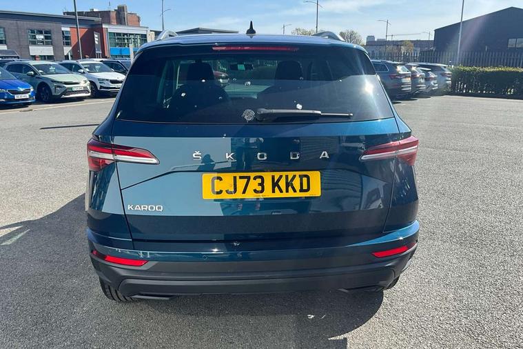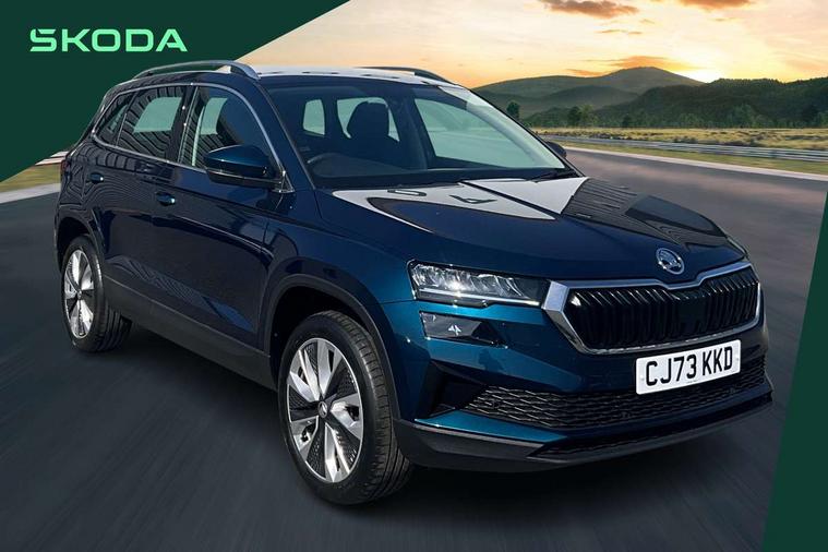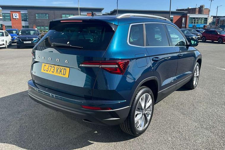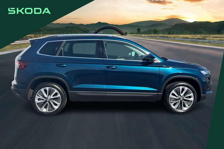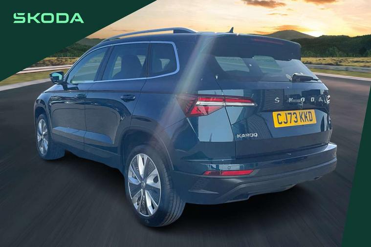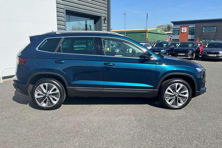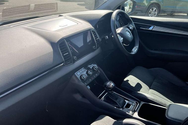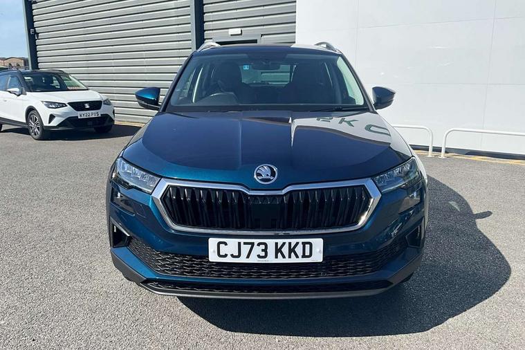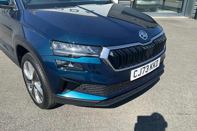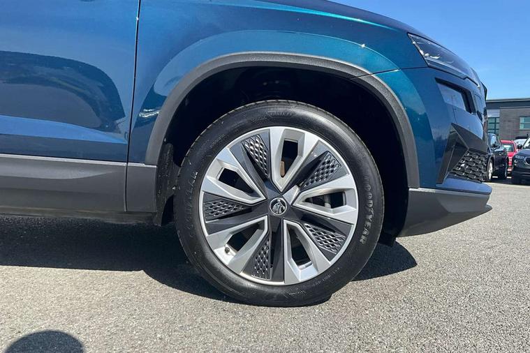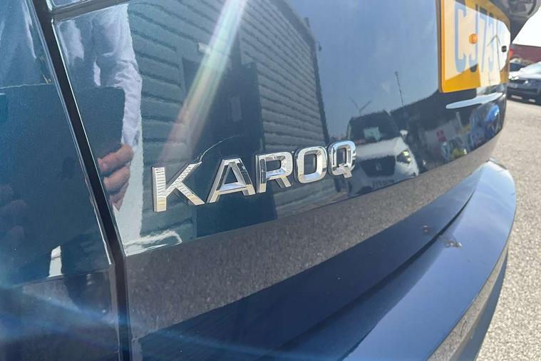 8" Digital display, Care connect, Driver fatigue sensor, Emergency services call system, Outside temperature gauge, Service interval indicator, SmartLink wireless for Apple and wired for Android, Start/stop system with regenerative braking, USB C Port x 2 in front centre console, 8 Speakers, DAB radio with Bluetooth, USB connection, Acoustic glass, Aero front windscreen wipers with intermittent function, Auto dimming rear view mirror with light and rain sensors, Black electric window control buttons, Body colour door mirrors and handles, Dynamic headlight range control with cornering light function, Electric front and rear windows with child proof lock, Heated rear windscreen, LED daytime running lights, LED rear lights with high functionality welcome effect and dynamic indicators, Light assistant (coming/leaving home/tunnel light), Plastic scuff plates, Privacy glass, Rear side wing doors, Rear spoiler, Rear window wiper with washer system and intermittent control, Safety reflectors on front doors, 1.5 litre bottle holders in driver and front passenger door panels, 12V socket in boot, 12v socket in front centre armrest with storage compartment and rear air vents, 2 spoke leather heated multifunction steering wheel with DSG paddles, 2 x Tablet holder, 3 rear height adjustable headrests, 3 seat bench in 2nd row, 4 foldable roof handles with rear coat hooks, Black floor carpet, Chrome inner door handles, Double sided boot floor, Foldable hooks in the boot, Front head restraints, Height adjustable front three point seats belts with tensioners, Height/reach adjust steering wheel, Ice scraper, Illuminated glovebox, Illuminated luggage compartment, Isofix child seat preparation for front passenger seat, Isofix child seat preparation outer rear, Manual lumbar support for front seats, Pen holder, Pollen filter, Rear boot cover, Rear reading lights, Rubbish bin door, Safety vest holder, Single front passenger seat, Storage box in upper central dashboard closed, Sunvisors with illuminated vanity mirrors, Textile floor mats, Ticket holder, VarioFlex seats with standard rear seat release, Boot pack - Karoq, Design Pack - Karoq, Parking pack - Karoq, Automatic door unlocking in case of crash, Automatic fuel cut off in case of crash, Child locks on rear doors, Driver airbag, Electronic parking brake with auto hold function, Emergency rear braking signal, ESC including ABS, MSR, ASR, EDS, HBA, DSR, RBS, MKB and traction control, Front side airbags, Hill hold control, Knee airbags, Passenger airbag with switch-off function, Pedestrian monitor, Seatbelt reminder signalisation and pretensioner for all seats, Three point seatbelts rear, Two tone horn, Tyre pressure display, Tyre pressure monitor, Alarm with interior monitoring, back up horn and tilt sensor with safe function, Electronic engine immobiliser, Keyless entry and start/stop, Remote central locking with 2 remote folding keys, Chrome framed air vents, 18" Miran alloy wheels in black, Anti-theft wheel bolts protection, Tool kit,