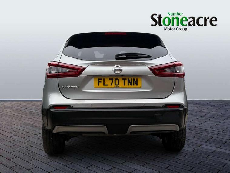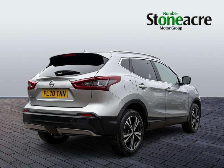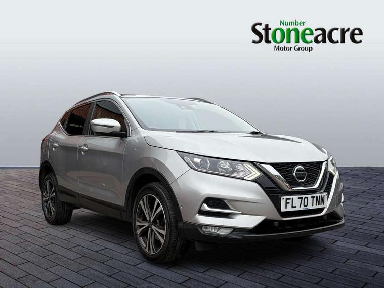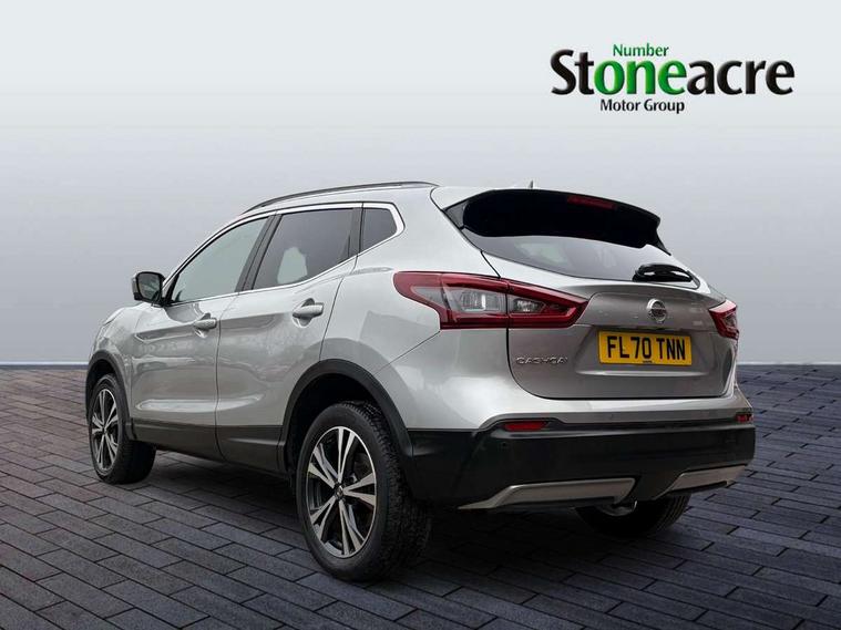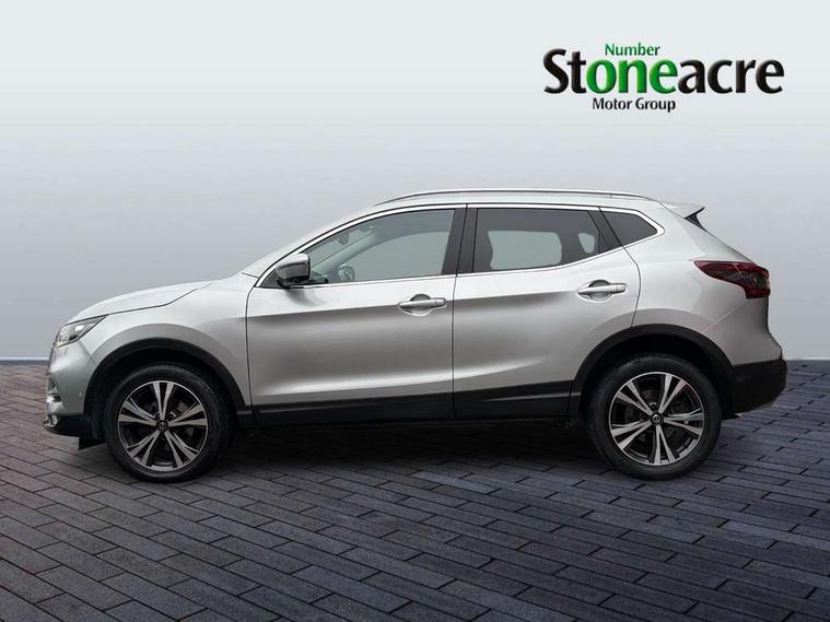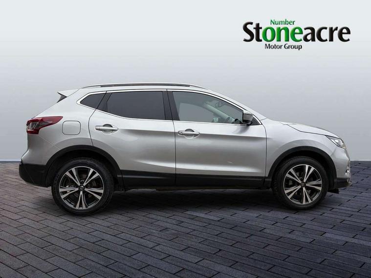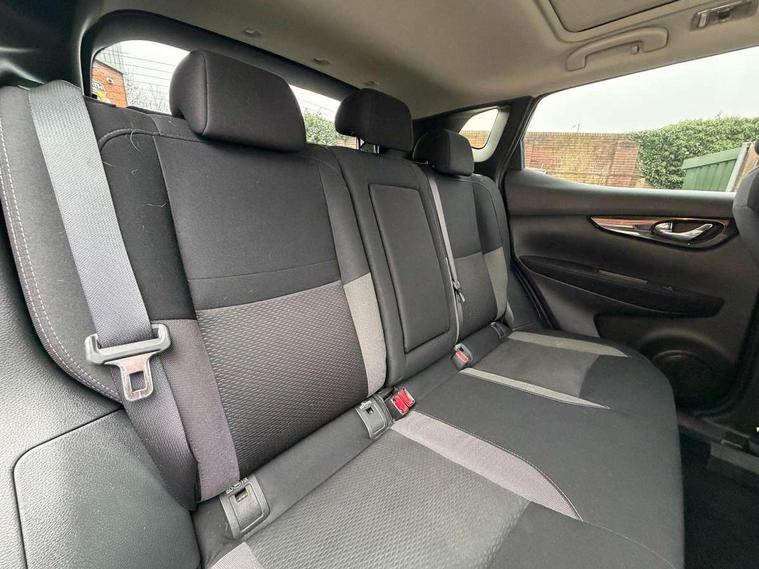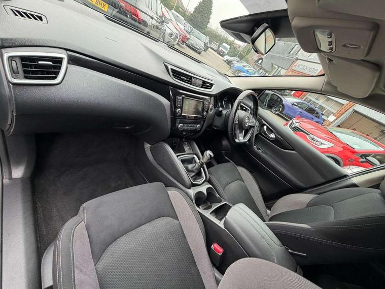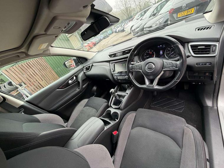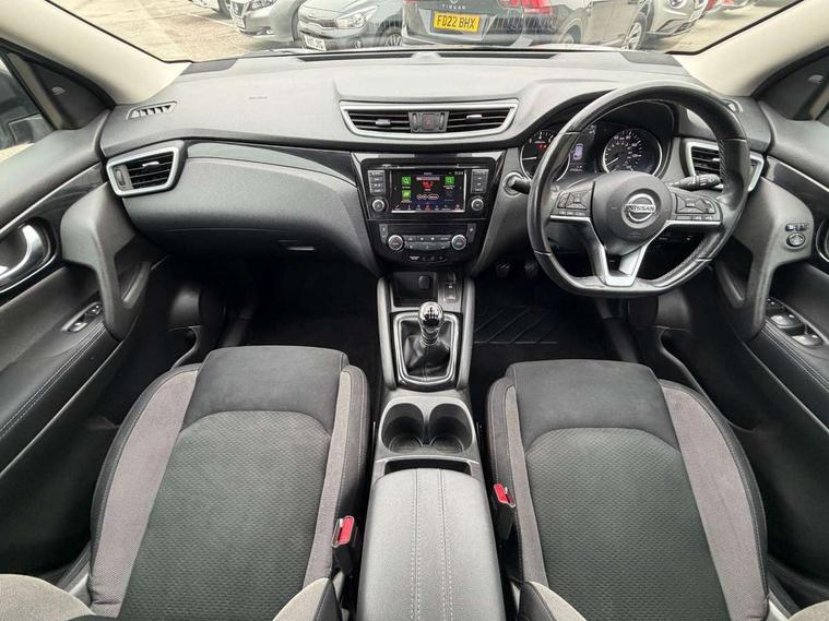 Advanced drive assist display 5'' TFT coloured screen, Android Auto, Apple CarPlay preparation, Bluetooth connectivity, Electric speed sensitive power steering, Front parking sensors, Intelligent around view monitor, Intelligent parking assist, Lane departure warning system, Nissan connect evo 7" touchscreen navigation and entertainment system, Normal or sport selectable steering, Outside temperature sensor, Push button starter, Rear parking sensors, Rear view camera, Service interval indicator, Smartphone integration, Stop/start system, Tomtom connected services, Traffic sign recognition, Trip computer, Voice control system, 6 speakers, AM/FM radio, CD audio system, Aux-in socket, DAB Digital radio, Rear USB connection, Steering wheel mounted audio controls, USB port, Anti dazzle rear view mirror, Auto wipers, Body colour bumpers, Body coloured door handles, Body coloured door mirrors, Chrome window surround, Daytime running lights dip function when turn signal applied, Electric folding door mirrors, Electric front and rear windows with one touch illuminated window controls, Electric front/rear windows, Electrically adjustable door mirrors, Front fog lights, Halogen headlights, Heated door mirrors, High beam assist, Intelligent auto headlights, LED indicators in door mirrors, Matt silver roof rails, One touch 4x auto windows with illuminated switches, Privacy glass, Rear roof spoiler, Rear wiper with reverse link, Shark fin antenna, Signature LED daytime running lights, Underbody vortex generators, 2 X front 12v power sockets, 3 height adjustable rear headrests, 60/40 split folding rear seat, Ambient lighting, Ambient lighting in centre console, Boot lighting, Centre console storage box/armrest, Chrome interior door handles, Cloth upholstery, Configurable luggage board system, Driver's seat manual height adjust, Dual zone climate control, Front and rear door pockets with bottle holders, Front and rear seat belt pre-tensioners with load limiters, Height adjustable front headrests, ISOFIX restraints on outer rear seats x2, Leather D shaped steering wheel, Leather gear lever, Leather knee pad, Manual height adjustable front passenger seat, Manual lumbar support on driver seat, Parcel shelf stow function under luggage board, Pollen filter, Rear armrest with 2 cupholders, Synthetic leather wrapped door handle with contrasting stitching, Tilt/telescopic adjustable steering wheel, Safety shield plus pack - Qashqai, 6 airbags - Driver, front passenger, curtain and side airbags, ABS, ESP, EBD and brake assist, Auto hold function, Child locks on rear doors, Electronic parking brake, Front and rear seat belt warning, Front passenger airbag deactivation, Height adjustable front seatbelts, Hill start assist, Intelligent emergency braking with pedestrian recognition, Three 3 point rear seatbelts, Tyre pressure monitoring system, Anti-theft immobiliser, Intelligent Key, Remote central locking, Thatcham Cat.1 alarm, Glossy black dash trim, Tyre puncture repair kit,