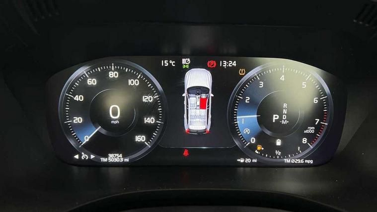 12.3" Active TFT crystal driver's instrument display, 9" Touch screen, Adjustable steering wheel force, Bluetooth handsfree system, Drive mode selector, Driver alert control with lane keeping aid, Oncoming Lane Mitigation, Sensus navigation with European mapping and traffic information, Service interval indicator, Speed limiter, Speed sensitive steering, Trip computer, Voice control system, Volvo on call, 8 speed automatic transmission with start/stop + manual change functions, DAB Digital radio, Steering wheel remote infotainment controls, Adaptive brake lights with high level LED brake lights, Auto dimming interior + exterior mirrors, Automatic headlight levelling system, Body colour bumpers, Colour coordinated auto folding and heated power door mirrors, Electric front+rear windows, Front aluminium tread plates, Home safe and approach lighting, Illuminated side steps, Integrated silver roof rails, LED Headlights + Active high beam incorporating daytime running lights, Piano black front grille with chrome surround, Rain sensor with automatic windscreen wiper activation, Rear wiper, Roof antenna, Roof spoiler, Tinted windscreen, Twin exhaust tailpipes with chrome finishers, Visible VIN plate, 12V socket in front tunnel console and luggage compartment, 3 spoke leather steering wheel with chrome trim, B Pillar ventilation, Bright metal luggage threshold, Centre armrest storage illumination, Centre console cupholders and storage, Floor mats, Front footwell illumination, Front reading lights, Head restraints for all seats, Heated front seats, Height/reach adjustable steering column, Illuminated glovebox, Illuminated luggage compartment, Illuminated vanity mirrors + ticket holder, Leather upholstery, Load cover, Load protection net, Power height adjustable passenger seat with lumbar support, Rear armrest / integral cup holders / storage tray, Rear seat concealed storage, Theatre lights, Underfloor stowage compartment, Versatile split folding rear seat - 60/40, 5 three point seatbelts, City safety with steering support with Pedestrian + cyclist + large animal detection + front collision warning with full auto brake, Drivers knee airbag, Dual stage driver/passenger airbags, Electronic parking brake with auto hold, First aid kit, Hill descent control, Hill start assist, IC (Inflatable Curtains) - Full Length, Passenger airbag cut-off device, Road sign information display, Run off Road Mitigation, Run off Road Protection, Seatbelt reminder and pretensioners, SIPS (Side Impact Protection System), SIPS airbags, Slippery road and hazard light alert, Stability and Traction Control with Spin control, Engine Drag Control and Corner Traction Control, Tyre pressure monitoring system, Vehicle deceleration control with Anti-lock Brake System, Electronic Brake Distribution and Emergency Brake Assist, Warning triangle, WHIPS whiplash protection system - front, Anti-theft alarm including immobiliser/volume sensor + level sensor, Care key with user defined top speed, Key integrated remote control central locking + fuel flap with deadlocking system and auto open/close power windows, Locking wheel nuts, Private locking for tailgate, Iron ore inlays,