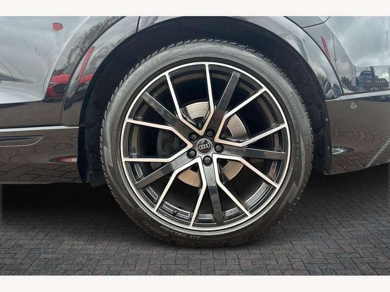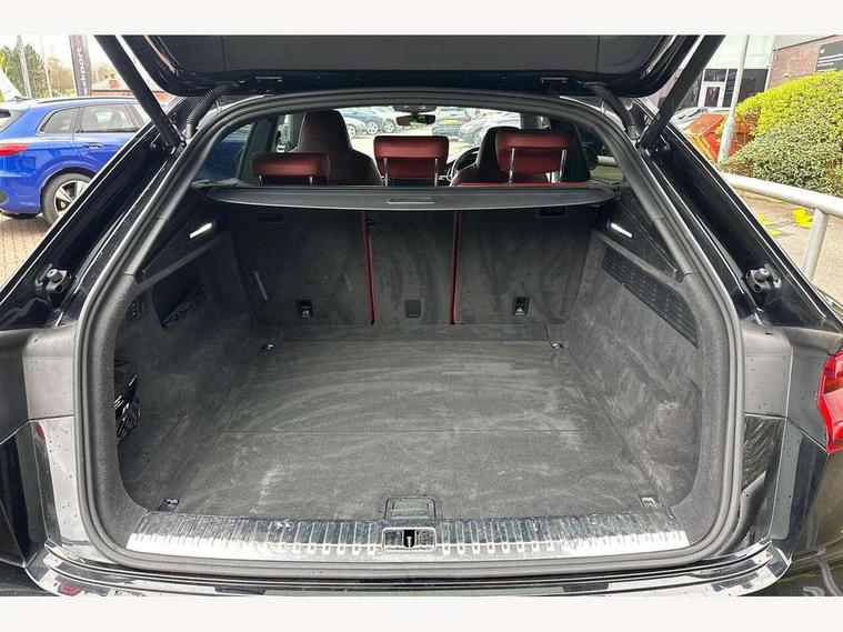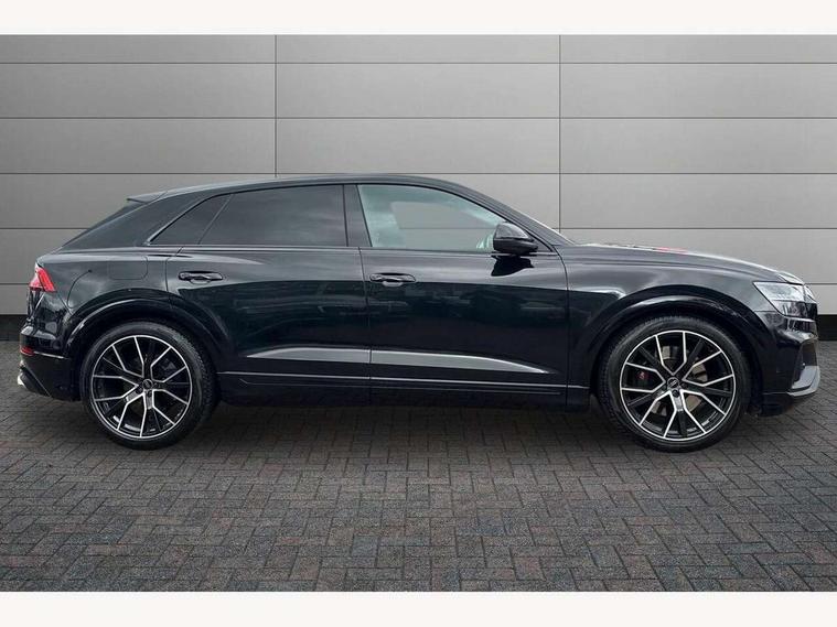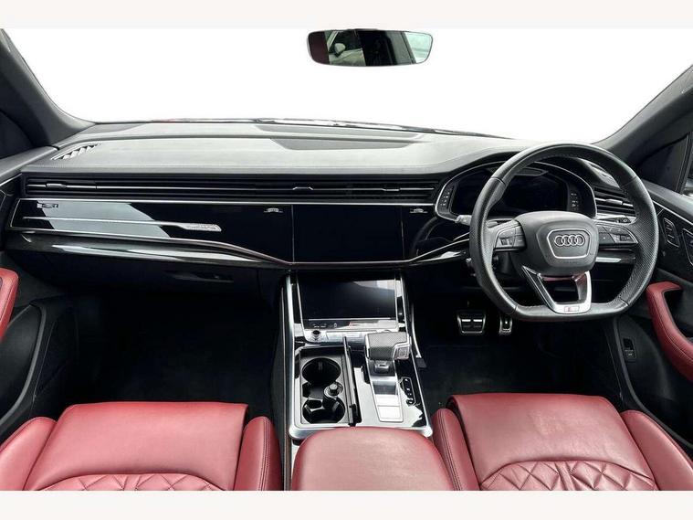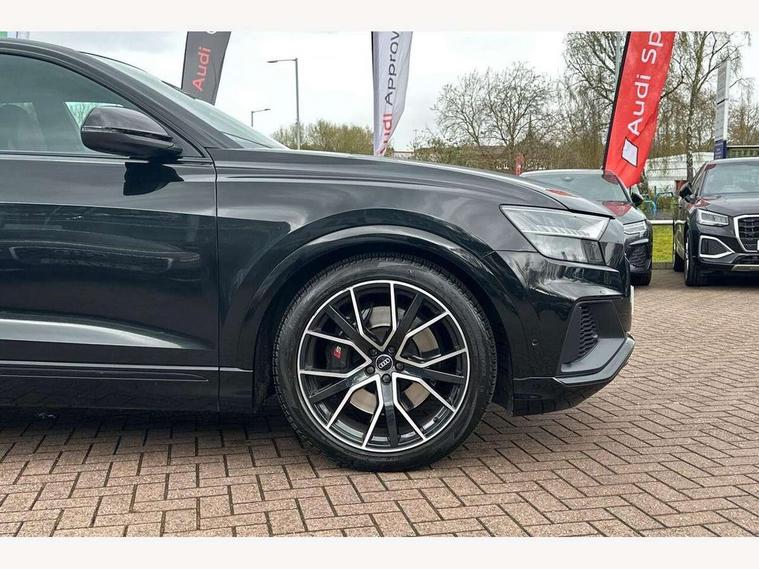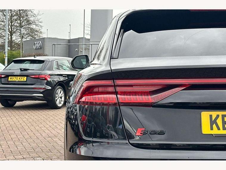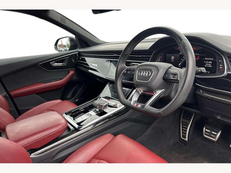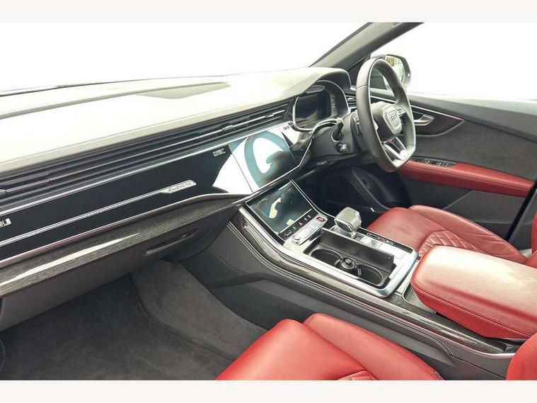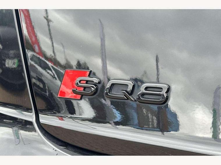 10.1" and 8.6" Dual colour touchscreens, All wheel steering, Audi connect safety and service (e-call), Audi connect with Amazon Alexa Integration, Audi drive select, Audi parking system plus includes 360 degree display with front and rear sensors, Audi virtual cockpit - 12.3" high resolution LCD display with fully customisable instrument cluster, Automatic start/stop system, Electro-mechanical PAS, Low washer fluid indicator, MMI - Multi Media Interface control system, MMI navigation plus with MMI touch, Natural voice recognition, On board computer, Operating buttons in black, glass look with haptic feedback, Power operated tailgate, Rear view camera, Service interval indicator, Smartphone interface includes wireless Apple carplay/Android Auto, 48V Mild hybrid technology, 85 litre fuel tank, Quattro all wheel drive with self locking centre differential, S specific Adaptive air suspension, Audi music interface with 2 USB ports with charge and data functions, Audi sound system with 6 channel amplifier, 180 watt amplifying capacity and 10 loudspeakers including subwoofer, Aux-in socket, DAB Digital radio, 3rd brake light, Acoustic windscreen, Audi Beam uses LEDs to project the Audi logo, Audi HD Matrix LED headlights with dynamic front and rear indicators, Auto dimming frameless rear view mirror, Body coloured bumpers, Coming/leaving home lighting function, Electric front+rear windows, Electrically folding auto dimming/adjustable/heated door mirrors with memory function, LED side indicators and kerb view function for passenger side, Gloss black finish for exterior Audi rings and SQ8 logo, Headlight washers, Heat insulating glass in windshield, LED signature daytime running lights, Platinum grey front spoiler lip and diffuser insert, Privacy glass - dark tinted rear and rear side windows from B-pillar backwards, Rain and light sensors, Rear side wing doors, Rear wiper, S specific dual brach chrome tailpipes on both the left and right, S specific front and rear bumpers, S specific side skirts in matt selenite silver, Side air inlet grilles in matt anthracite black, Trim and underbody protection in matt selenite silver, 3 bench rear seats in 2nd row, 4 zone deluxe automatic climate control, 4-way lumbar support for front seats, 40:20:40 split folding rear bench seat, Black cloth headlining, Comfort front centre armrest, Driver seat memory function, Electrically adjustable front seats, Front head restraints, Front/rear floor mats, Heated front seats, Illuminated door sill trims, ISOFIX child seat mounting for front passenger seat and 2 outer rear seats with top tether child seat mounting for all 3 rear seats, LED interior ambient lighting, Luggage compartment sill protection in stainless steel, Rear centre armrest with 2 cupholders, Rear headrests, Single front passenger seat, Stainless steel pedals, Sunvisors with illuminated vanity mirrors, Upper and lower interior elements in leather, leather door armrests, Valcona leather upholstery + super sports seats with S embossed logo, Anthracite black Styling Pack - Q8, 3 point seatbelts on all seats, Audi pre sense front, Child locks on rear doors, Driver and front passenger, front side and curtain airbags, Electromechanical parking brake, Electronic Stability Control (ESC) including ABS, ASR and EDL, Front passenger airbag deactivation, Hill descent control, Hill hold assist, Predictive pedestrian protection, Seatbelt monitoring, Traction control, Tyre pressure loss indicator, Warning triangle and first aid kit, Anti theft alarm with tow away protection, Anti-theft wheel bolts and wheel loosening detection, Immobiliser, Keyless go with remote central locking, Polished oak trim with grey finish inlay, Tool kit, Tyre repair kit,