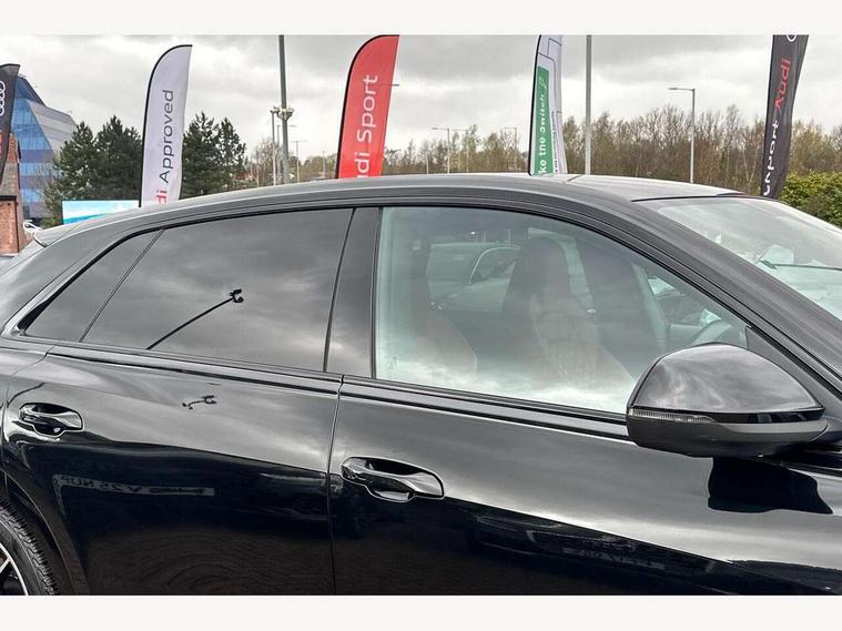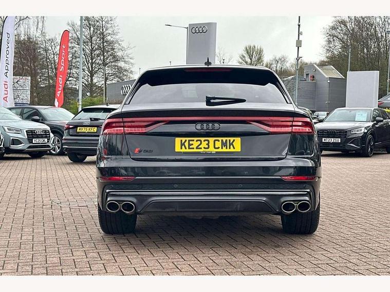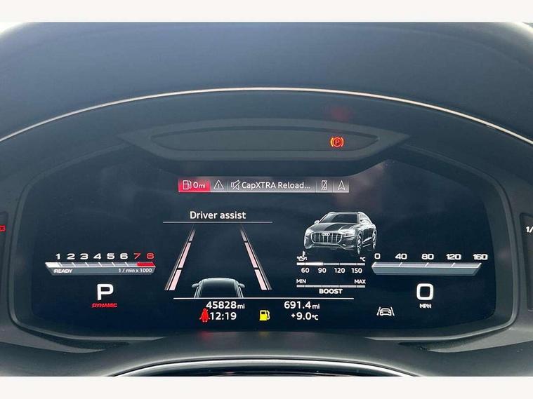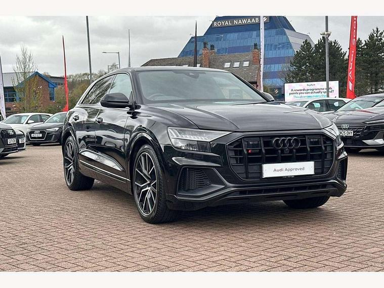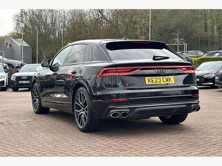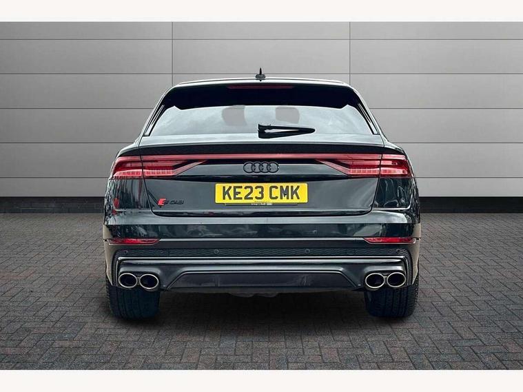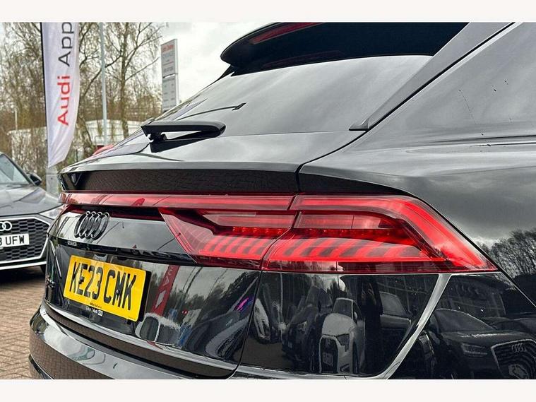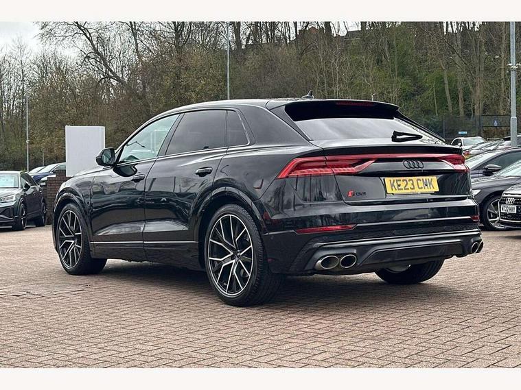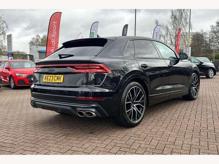 10.1" and 8.6" Dual colour touchscreens, All wheel steering, Audi connect safety and service (e-call), Audi connect with Amazon Alexa Integration, Audi drive select, Audi parking system plus includes 360 degree display with front and rear sensors, Audi virtual cockpit - 12.3" high resolution LCD display with fully customisable instrument cluster, Automatic start/stop system, Electro-mechanical PAS, Low washer fluid indicator, MMI - Multi Media Interface control system, MMI navigation plus with MMI touch, Natural voice recognition, On board computer, Operating buttons in black, glass look with haptic feedback, Power operated tailgate, Rear view camera, Service interval indicator, Smartphone interface includes wireless Apple carplay/Android Auto, 48V Mild hybrid technology, 85 litre fuel tank, Quattro all wheel drive with self locking centre differential, S specific Adaptive air suspension, Audi music interface with 2 USB ports with charge and data functions, Audi sound system with 6 channel amplifier, 180 watt amplifying capacity and 10 loudspeakers including subwoofer, Aux-in socket, DAB Digital radio, 3rd brake light, Acoustic windscreen, Audi Beam uses LEDs to project the Audi logo, Audi HD Matrix LED headlights with dynamic front and rear indicators, Auto dimming frameless rear view mirror, Body coloured bumpers, Coming/leaving home lighting function, Electric front+rear windows, Electrically folding auto dimming/adjustable/heated door mirrors with memory function, LED side indicators and kerb view function for passenger side, Gloss black finish for exterior Audi rings and SQ8 logo, Headlight washers, Heat insulating glass in windshield, LED signature daytime running lights, Platinum grey front spoiler lip and diffuser insert, Privacy glass - dark tinted rear and rear side windows from B-pillar backwards, Rain and light sensors, Rear side wing doors, Rear wiper, S specific dual brach chrome tailpipes on both the left and right, S specific front and rear bumpers, S specific side skirts in matt selenite silver, Side air inlet grilles in matt anthracite black, Trim and underbody protection in matt selenite silver, 3 bench rear seats in 2nd row, 4 zone deluxe automatic climate control, 4-way lumbar support for front seats, 40:20:40 split folding rear bench seat, Black cloth headlining, Comfort front centre armrest, Driver seat memory function, Electrically adjustable front seats, Front head restraints, Front/rear floor mats, Heated front seats, Illuminated door sill trims, ISOFIX child seat mounting for front passenger seat and 2 outer rear seats with top tether child seat mounting for all 3 rear seats, LED interior ambient lighting, Luggage compartment sill protection in stainless steel, Rear centre armrest with 2 cupholders, Rear headrests, Single front passenger seat, Stainless steel pedals, Sunvisors with illuminated vanity mirrors, Upper and lower interior elements in leather, leather door armrests, Valcona leather upholstery + super sports seats with S embossed logo, Anthracite black Styling Pack - Q8, 3 point seatbelts on all seats, Audi pre sense front, Child locks on rear doors, Driver and front passenger, front side and curtain airbags, Electromechanical parking brake, Electronic Stability Control (ESC) including ABS, ASR and EDL, Front passenger airbag deactivation, Hill descent control, Hill hold assist, Predictive pedestrian protection, Seatbelt monitoring, Traction control, Tyre pressure loss indicator, Warning triangle and first aid kit, Anti theft alarm with tow away protection, Anti-theft wheel bolts and wheel loosening detection, Immobiliser, Keyless go with remote central locking, Polished oak trim with grey finish inlay, Tool kit, Tyre repair kit,