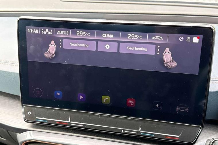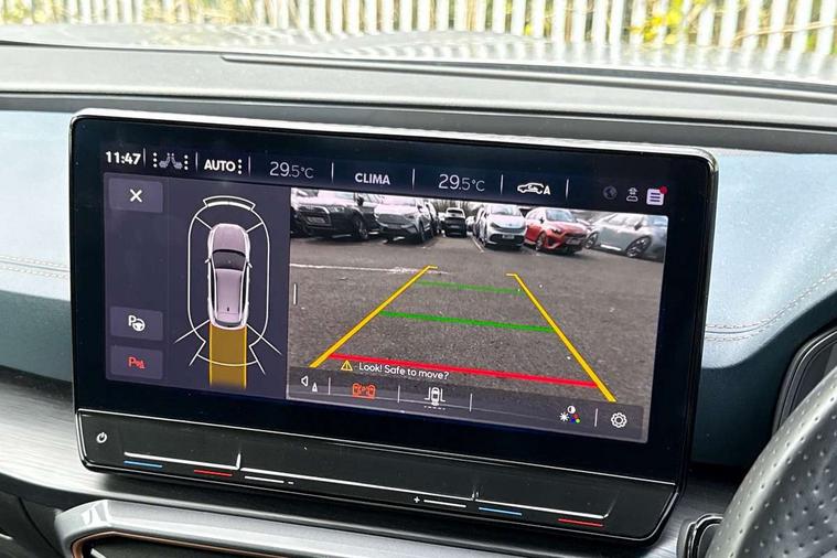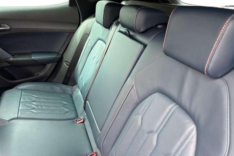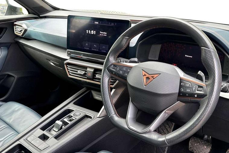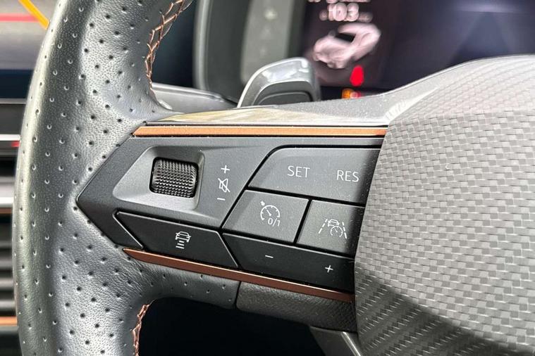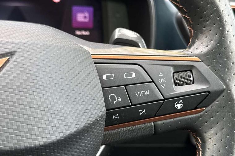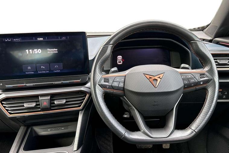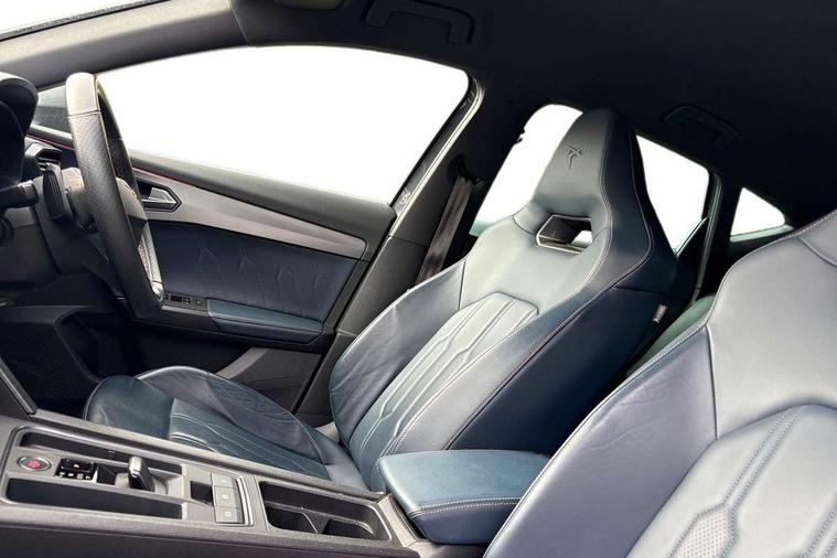 Digital cockpit and configurable dashboard, Driver alert system, Driving profile selection, Forward collision warning with automatic braking, Lane assist, Navigation system with 12'' Touchscreen Display, Park assist (inc front/rear parking sensors), PAS, Predictive adaptive cruise control with speed limiter, Rear view camera, RPM, trip computer, outside temp gauge, instrument light brightness, low fuel warning light, lights on reminder, gearshift indicator, Service interval indicator, Start/stop system with regenerative braking, Voice control system, Wireless apple carplay, Wireless phone charger, Electronic locking differential and dynamic traction support, Standard suspension, 2 front and 2 rear USB type C sockets, Auxiliary input socket, DAB radio, Auto dimming rear view mirror, Body colour door handles, Body coloured bumpers, Dark grey wing mirror, Daytime running light with automatic headlight control and coming home feature, Dynamic headlight range control, Electric front/rear windows, Electrically adjustable heated and folding door mirrors with memory function, Front fog lamps with cornering function, Gloss black roof rails and window surrounds, LED Headlights, LED Taillights with dynamic indicator, Rain sensing wipers, Rear diffuser with black simulated exhaust pipes, Rear side wing doors, Rear wash/wipe, Third brake light, Tinted rear windows, Welcome lights, 12v power supply in centre console, 12V socket, 12v socket in loadspace, 2 front and 2 rear reading lights, 230V socket, 3 seat bench in 2nd row, 60/40 split rear bench seat with armrest and mechanical seat release, Black headlining, Dust/pollen filter, Front and rear head restraints, Front centre armrest, Height/reach adjust steering wheel, Illuminated interior front door sills, Illuminated sunvisor with mirror, Isofix, Leather multi function heated steering wheel with gear shift paddles, Luggage tie-down hooks, Single front passenger seat, Three zone climate control with control panel in rear, Variable luggage/load compartment floor, Wraparound lighting, Genuine Nappa leather Pack - Cupra, 3 point seatbelts on all rear seats, ABS, Brake control system - ESC and brake booster, Child proof door locks, Driver and front passenger airbags with front passenger airbag de-activation, Electronic parking brake, Front and rear disc brakes, Front side curtain airbags, Hill hold control, Public e-call, Seat belt reminder for front and rear seats, Tyre pressure monitoring system, Anti theft alarm system, Keyless entry and start system (KESSY), Locking wheel bolts, Copper and aluminium interior detailing, 19" 'Exclusive' machined sport matte black and silver alloy wheels,
