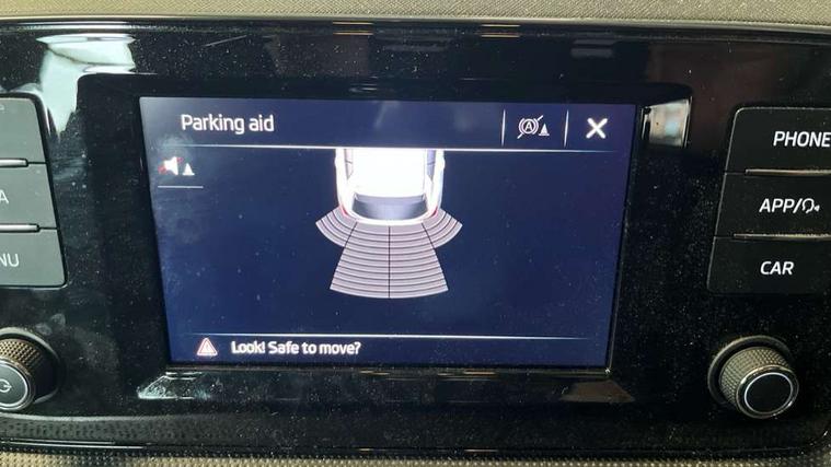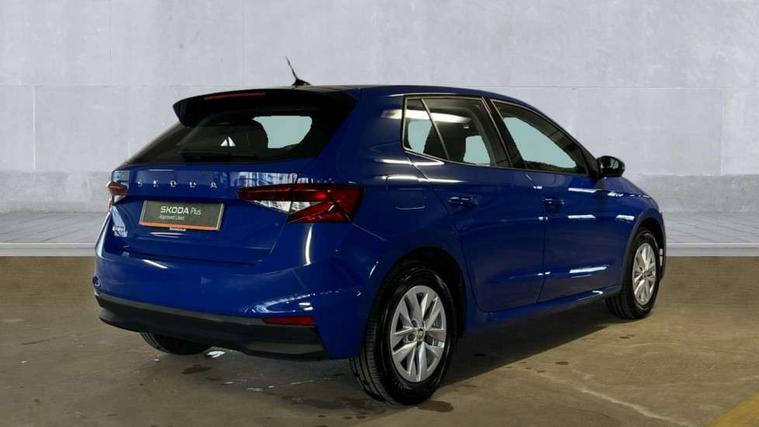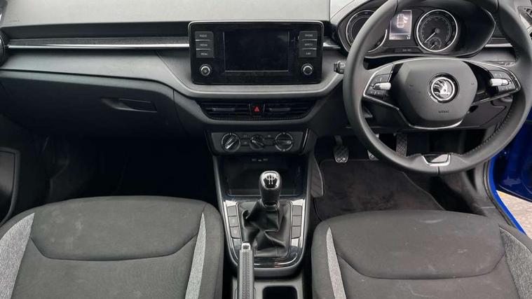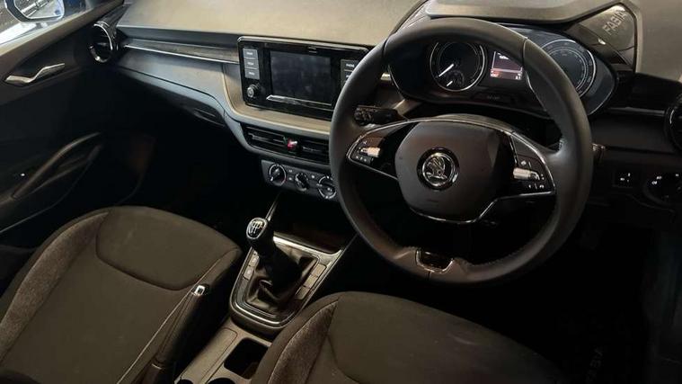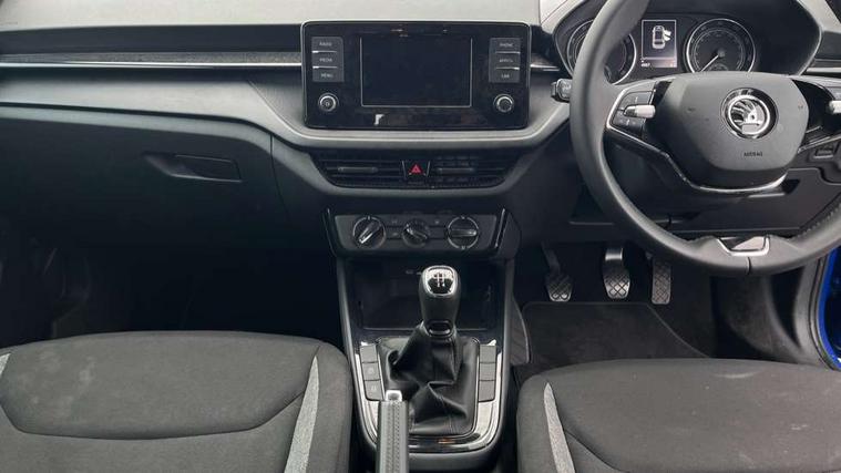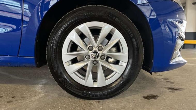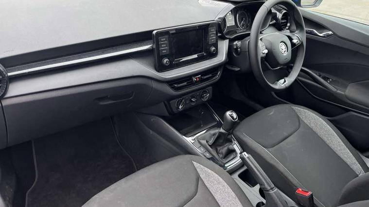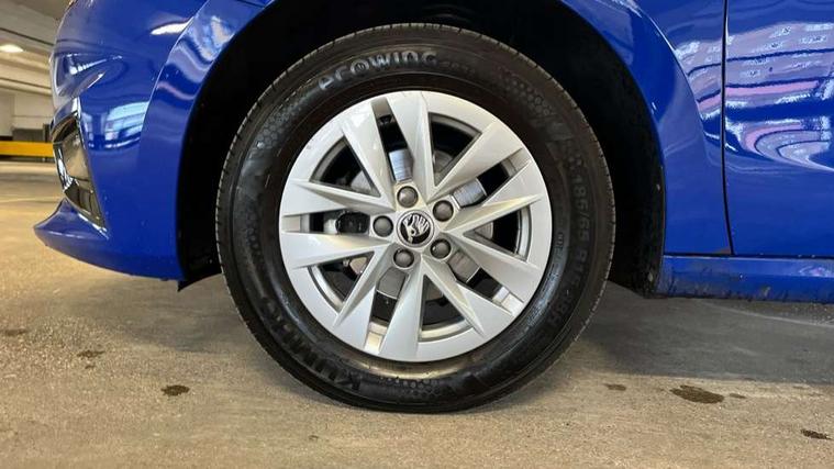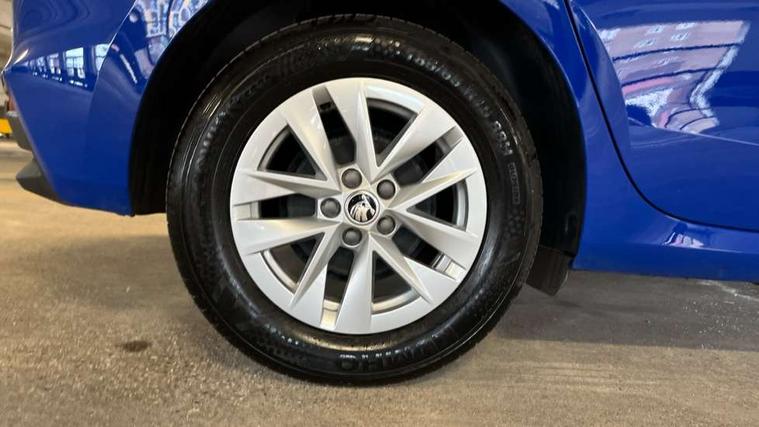Bluetooth connection, Driver alert system - DAS, Electromechanical power steering, Exterior temperature gauge, Lane assist including road edge detection, Multifunction trip computer in black and white, Service interval indicator, Speed limiter, 2x USB-C in the front (for data transmission and charging), 4 speakers in front, Auxiliary socket for external MP3 player, DAB digital radio reception, Radio Swing with 6.5" colour display, Basic LED Headlights, Body colour door mirrors, Body coloured bumpers, Dimming rear view mirror with black frame, Door mirror integrated indicators, Electrically adjustable and heated door mirrors, Electrically adjustable front windows with function auto up/down, Front fog lights, Front window wiper intermittent control, Headlight range control - Automatic, Ice scraper in fuel cap, LED daytime running lights with coming and leaving home feature, Mechanical adjustable rear windows, Rain sensor, Rear LED fog light, Rear side wing doors, Rear window wiper with washing nozzles, Roof mounted spoiler, SKODA tailgate lettering in chrome, Third brake light, 2 reading lights in front and 2 reading lights in rear, 2 spoke leather multifunction steering wheel, 3 rear headrests, Backrest split and folding, Central console with fixed cup holder and storage box, Chrome handbrake release button, Fabric upholstery, Gearshift knob/handle in leather, Grain satin black interior door handles, Hand brake lever handle in leather, Height adjustable front headrests, Height adjustable front seats, Height adjustable steering wheel, ISOFIX and TopTether anchorage points to the outer rear seats, ISOFIX and TopTether on the front passenger seat, Luggage compartment lighting, Manual air conditioning, Manually adjustable lumbar support in front seats, Pollen filter, Rear seat bench unsplit, Single front passenger seat, Storm grey headlining, Sun visors with mirror and airbag label on passenger side, Ticket holder, 3-point height adjustable front seats belts with pretensioner and force limiter, Automatic warning lights in case of crash, Driver and passengers airbag with switch off function, e-Call+, ESC including ABS, MSR, ASR, EDS, HBA and XDS, Front and rear seat belt warning, FRONT ASSIST (AEB City and AEB Inter Urban), Front side airbags, Head airbags, One tone horn, Pedestrian protection, Three rear 3-points safety seat belts with pretensioner and force limiter including stop function for outer rear seat belts, Tyre pressure monitoring system, Anti-theft alarm system including immobiliser, interior monitoring, backup horn, and towing protection, Central locking with radio remote control, interior controls, SAFE function and 2 foldable keys, Black painted air vents, Glossy black decorative trim, Grain satin black central console cover, Grain satin black lower decorative trim, Satin black door and side trim panel in front, Anti-theft wheel bolts protection, Super-low rolling resistance tyres,