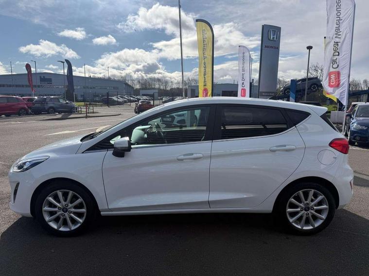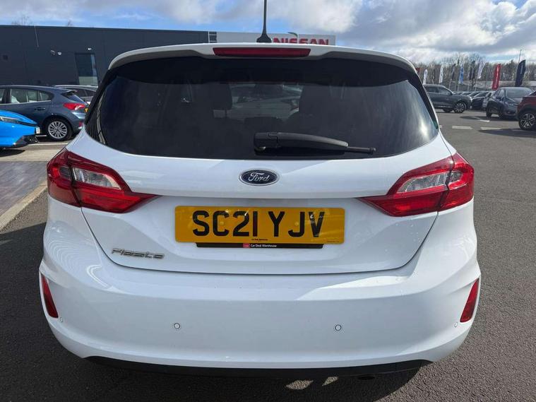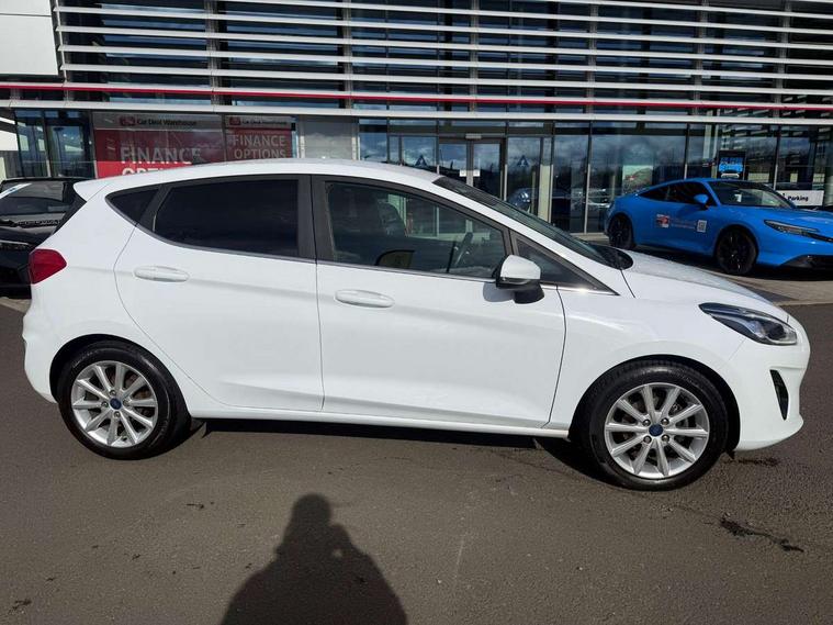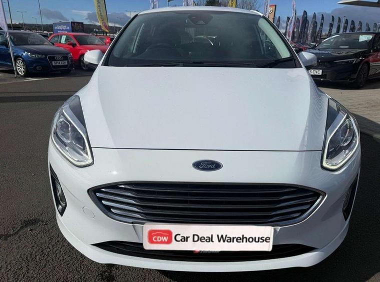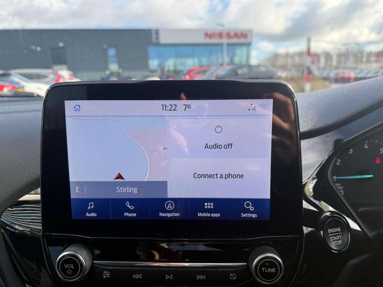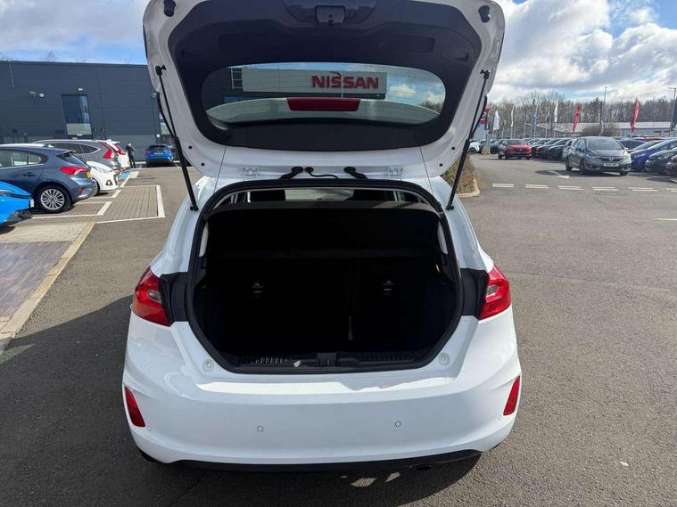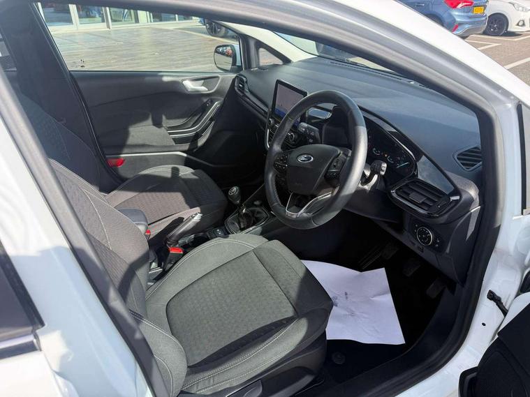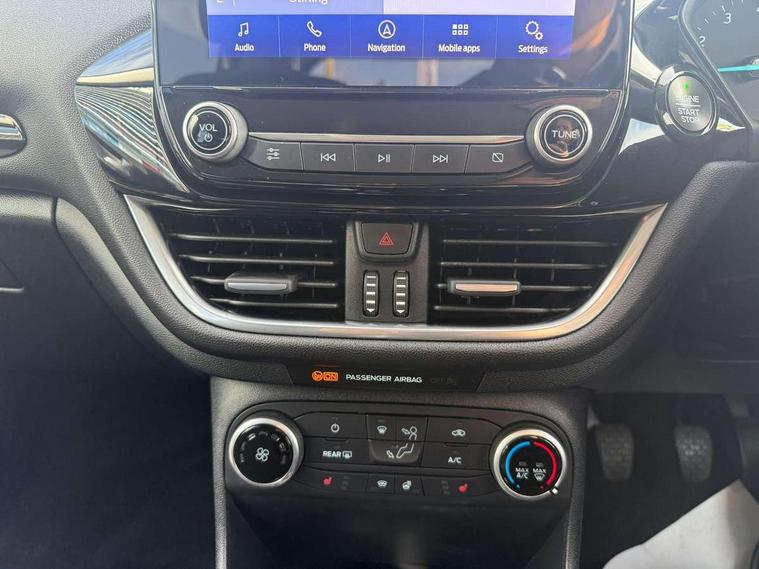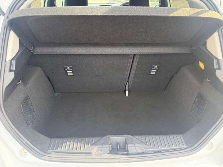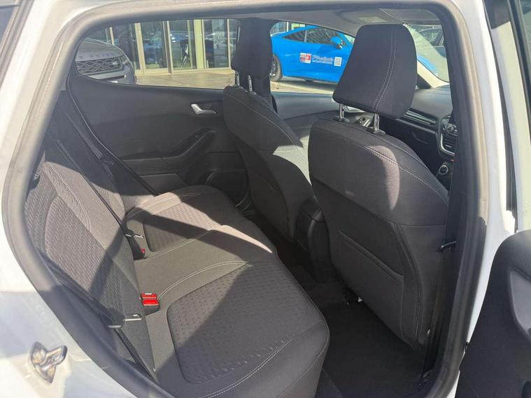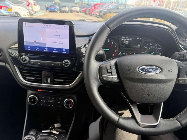 Bluetooth system, Electric power steering, Ford easy fuel, Ford SYNC 3 Navigation system incl 8" touchscreen, 7 speakers, FordPass connect, Apple carplay, android auto, voice control and emergency assistance, Rear parking distance sensors, Selectable drive modes (Normal, Sport, Track), Trip computer, 2 USB ports, Auxiliary input socket, DAB Digital radio, Steering wheel mounted controls, Body colour bumpers, Body colour door handles, Body colour rear spoiler, Body coloured electrically operated and heated door mirrors with side indicators, Chrome beltline trim, Chrome front grille, Chrome lower window surround, Cornering front fog lights, Electric front windows/one touch facility, Electric rear windows, Quickclear heated windscreen, Rain sensing wipers and auto dimming rear view mirror, Rear privacy glass, Rear wiper, 3 spoke leather trimmed steering wheel with audio control, 60/40 split folding rear seat, Adjustable head restraints, Boot carpet, Centre console with opening armrest, 2x cupholders, 12v and USB, Chrome inner door handles, Cloth upholstery, Footwell illumination, Front floor mats in velour, Front map reading lights, Front seat and rear pockets, Illuminated glovebox, Leather gaiter, Load area light, Luxury woven headliner, Manual 2 way passenger seat adjust, Manual 4-way driver seat adjust, Manual air conditioning, Overhead console with sunglasses holder, Pollen filter, Rake/reach adjustable steering wheel, Sensico wrapped steering wheel, NCAP Pack - Fiesta, 3 point seatbelts on all rear seats, ABS+EBA, Curtain airbags, Driver and passenger airbags, Drivers knee airbag, Electronic stability control with hill start assist, Front passenger airbag deactivation, Front side airbags, Seatbelt warning, Two tone horn, Tyre pressure monitoring system, Keyless start with 'Ford Power' starter button, MyKey system, Remote central locking & engine immobiliser, Thatcham Cat.1 alarm, 16" 10 spoke alloy wheels,