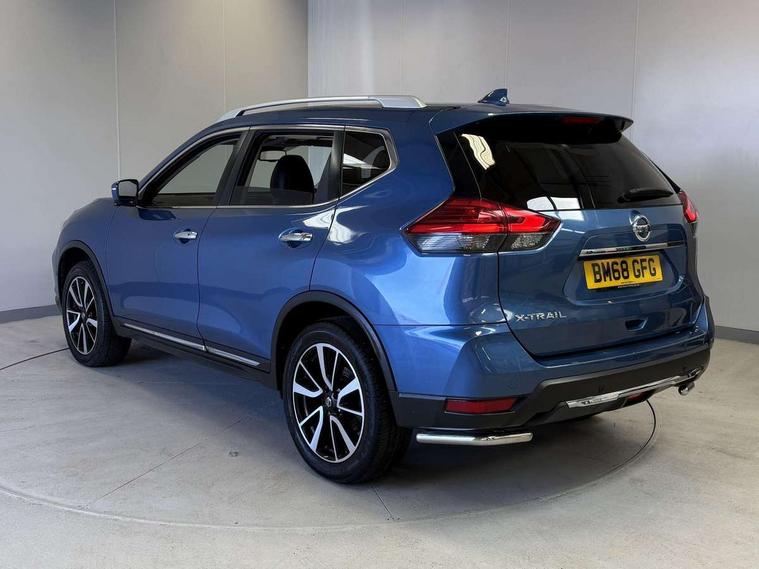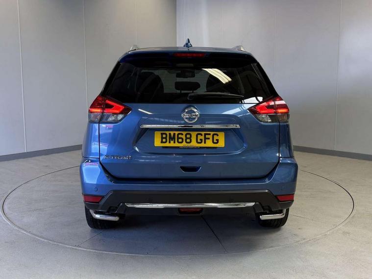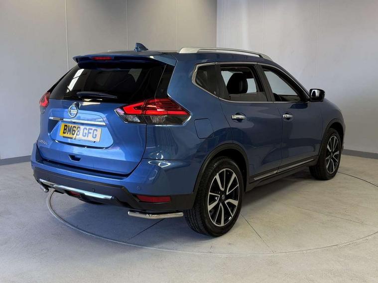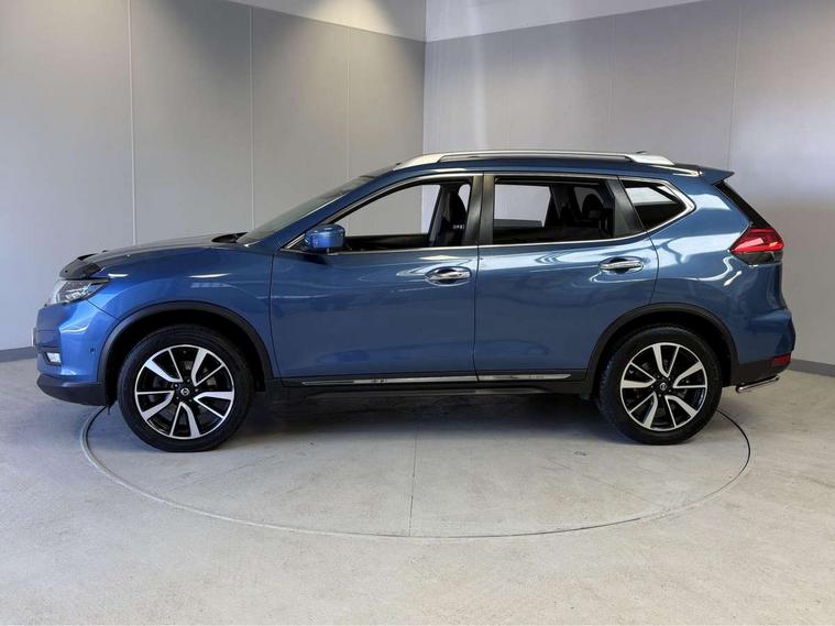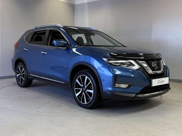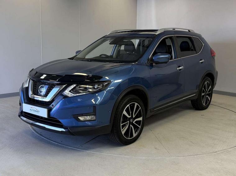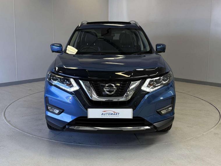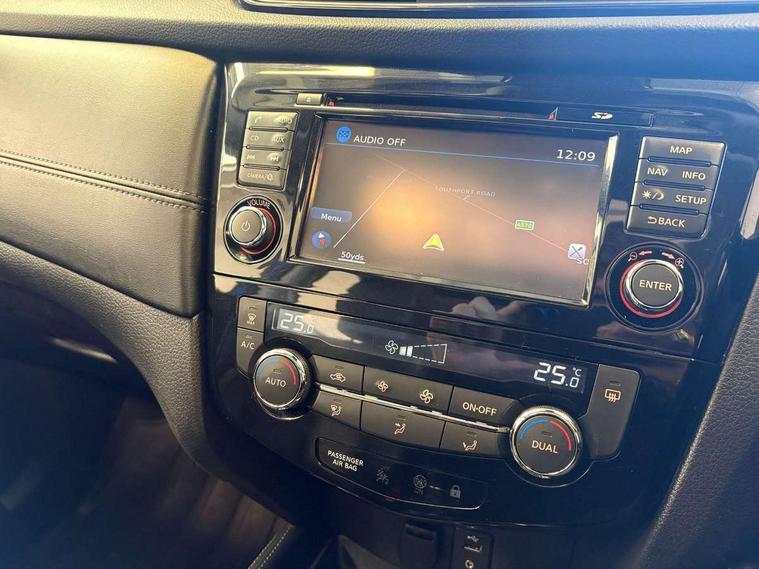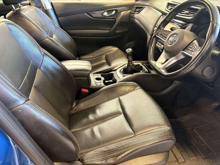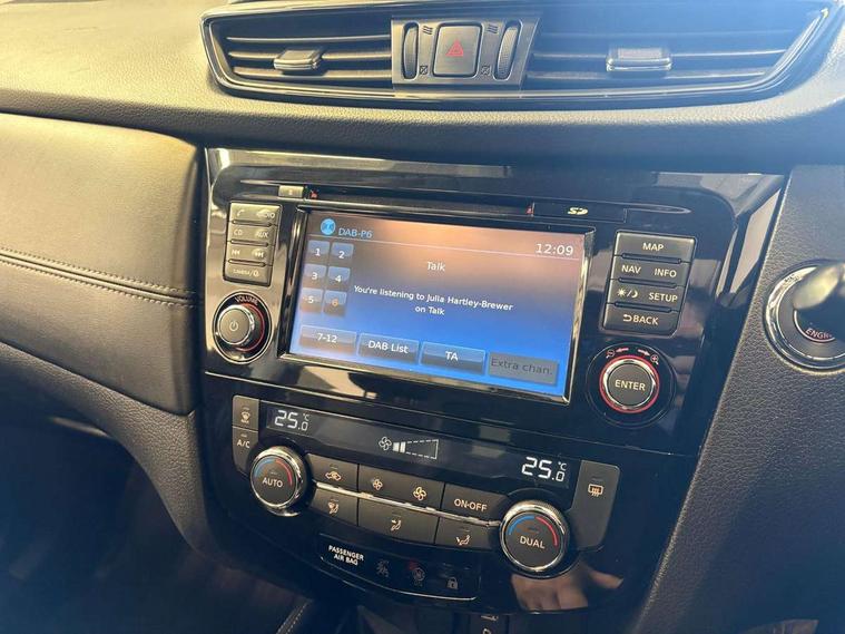 5" TFT driver information centre, Around View Monitor, Attention assist, Automatic tailgate opening, Blind spot monitoring, Bluetooth phone integration system, Cruise control + speed limiter, Engine start button, Front and rear parking sensors, Intelligent parking assist, Lane departure warning system, Moving object detection, Nissan connect sat nav system, PAS, Rear cross traffic alert, Traffic sign recognition, Trip computer, 6 speakers, Audio remote control in steering wheel, DAB Digital radio, Radio/CD, Smartphone apps, USB/aux input socket, Adaptive front lighting system, Auto dimming rear view mirror, Automatic headlights, Automatic rain sensing wipers, Black honeycomb front grille, Body colour door mirrors, Chrome door handles, Chrome side mouldings, Chrome window surround, Electric folding door mirrors, Electric heated door mirrors, Front and rear power windows, Front fog lights, High beam assist, LED daytime running lights, LED Headlights, Panoramic sunroof, Rear privacy glass, Satin silver roof rails, Shark fin roof aerial, 3 rear headrests, 60/40 split rear bench seat, Centre console storage box/armrest, Configurable luggage board system, Dual zone climate control, Electric adjustable front seats including height adjust, Front and rear door pockets with bottle holders, Front cupholders, Heated front seats, Heated rear seats, Heated steering wheel, Height adjustable front headrests, Individual rear reading lights, Isofix child seat attachment, Leather steering wheel and gear knob, Lumbar support, Pollen filter, Rake/reach adjustable steering wheel, Rear armrest, Synthetic leather instrumental panel inserts, Synthetic leather knee pad, 3 point seatbelts on all seats, ABS, Child locks on rear doors, Driver and passenger airbags, EBD + Brake Assist, Electronic parking brake, ESP + traction control, First aid kit, Front and rear curtain airbags, Hill hold assist, Intelligent emergency braking with pedestrian recognition, Seatbelt warning, Tyre pressure monitoring system, Warning triangle, Alarm, Immobiliser, Intelligent Key, Remote central locking, Full size spare wheel,