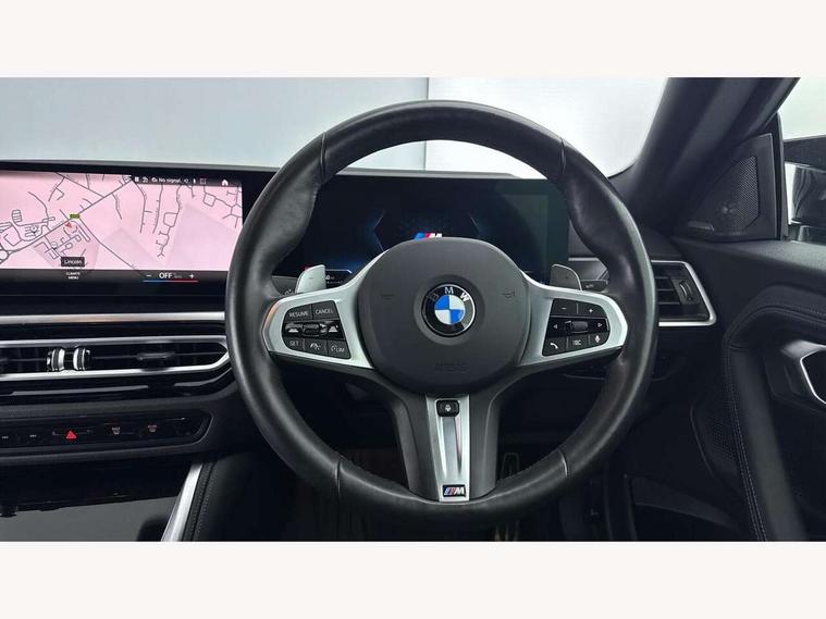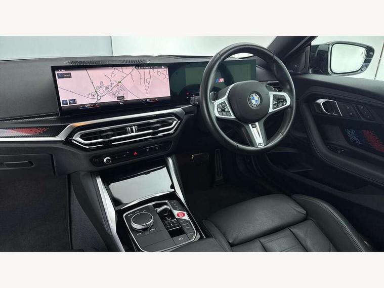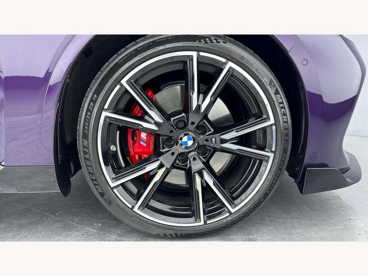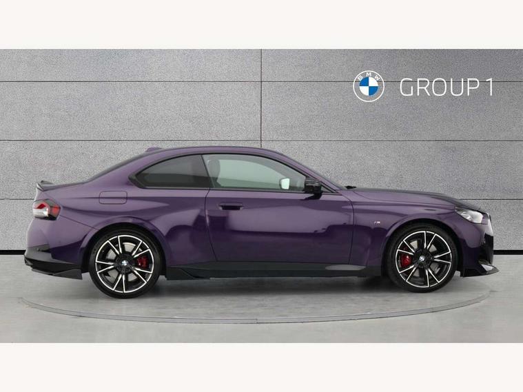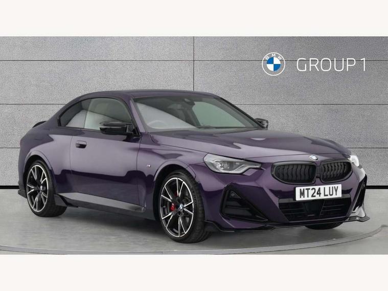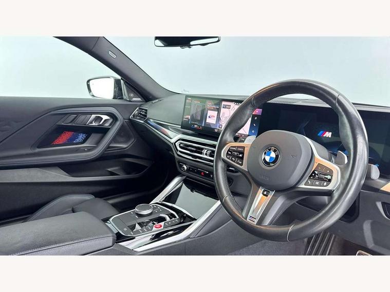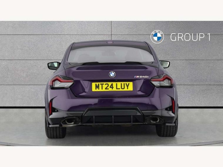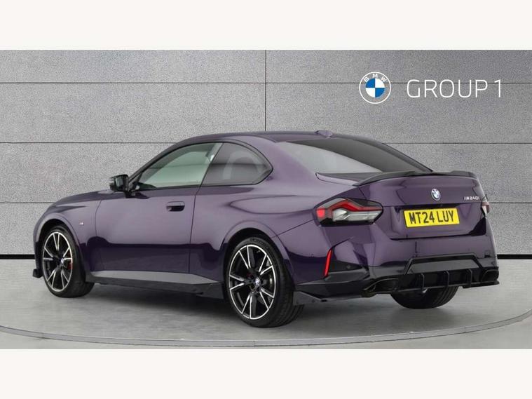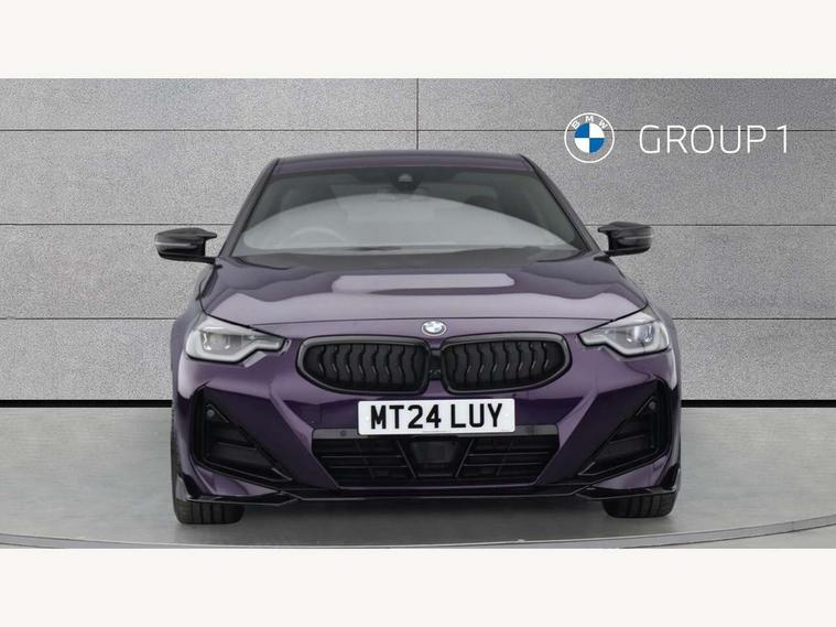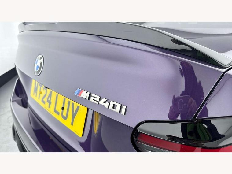 2 USB connections for charging and transferring data, 4G LTE connectivity with hard wired 4G network sim card, Attentiveness assist, Bluetooth with USB, BMW ConnectedDrive online services, BMW Intelligent Personal Assistant, BMW operating system 8 with variable, configurable widgets display information in real time, BMW Teleservices, Check Control warning system for monitoring of lights and door/luggage compartment open warning, Direct selection buttons, Drive off assistant, Driving experience switch with sport+ mode, Eco pro mode, Electric power steering, Front and rear parking sensors, Front/rear Parking distance control, iDrive controller with turn and press function, Integrated owners handbook, Intelligent functions, Live cockpit plus with nav function 12.3" instrument cluster and 14.9" centre display, Oil sensor for level and grade, Optimum shift indicator, Personal Profile, Touch operation on control display, Variable sport steering, Widescreen multi-media display, WiFi interface for wireless connection of mobile terminal devices, Aluminium lightweight construction, Balancer shaft, BMW TwinPower Turbo inline 6-cylinder petrol engine, Double VANOS, Drive performance control with ECO PRO comfort + sport mode, High precision injection, M Sport differential, Petrol Particulate Filter, Sport automatic steptronic transmission with gearshift paddles, manual gearshift time display, launch control, coasting idle ECO PRO/COMFORT modes, Twin scroll turbocharger with Valvetronic, xDrive with rear orientated application, DAB tuner, Acoustic windscreen wipers for reduced driving noise, Adaptive LED Headlights, Automatic windscreen wipers and automatic headlight, Automatically dimming rear view mirror, BMW individual lights shadow line, Body colour door handles flush with door surface, Body colour front and rear bumpers, Daytime running lights, Electric windows - front and rear, with open/close fingertip control and trap release, Exhaust tailpipes x 2 - free form finisher in black chrome in left and right, Exterior air inlets in front bumper with embellishers in high gloss black, Fading support, Flap controlled M Sport exhaust system, Front and rear bumper system with replaceable deformation elements, Front door sill finishers in black plastic with BMW designation, Front ornamental grille frame in high gloss black, Front windscreen wipers with integrated washer jets, Green tinted heat protection glazing, High beam assistant, High gloss black exterior M mirror caps, High gloss black sill, bumper trim sides and diffuser insert, High gloss shadowline exterior trim in mirror triangle cover, mirror cover panel, mirror bezel and window border, High level third brake light, Indicators integrated int mirror housing, LED registration plate light, LED technology rear tail lights, brake lights and turn indicators, Lightweight engineering, M Sport spoiler - Gurney in body colour, Model designation and M badges in cerium grey, Model designation on right side of tailgate, Rear boot, Rear fog lights, Reversing light in rear light cluster, Shark fin antenna, Side frame decorative moulding black high gloss, Single part LED rear lights with smoked glass components, Sun protection glass, Trailer stabilisation logic, Visible VIN plate, xDrive designation on left tailgate, 12V power socket in front centre console with blanking plug, 2 cupholders in front centre console, 2 zone automatic air conditioning, Ambient lighting, Compartment in front of cupholder, Conditioned based service, Driver seat backrest width adjustment, Electric front seat adjustment with driver memory, Front and rear side armrests integrated into door trim, Front armrest, Front door pockets, Front head restraints, Front M Sport seats, Front passenger seat lumbar support, Heated front seats, Illuminated glove compartment with separate small compartment, Lumbar support for driver, M headliner Anthracite, M sport leather steering wheel, M240i badge in instrument cluster, Manually adjustment steering wheel column, Rear seat backrest with manual 40:20:40 split folding, Rear seat centre foldable armrest with integrated cup holder, Single front passenger seat, Storage compartment between rear seats, Storage tray and compartment with cover in centre console, Sun visors with vanity mirrors and insert tab, Through loading system with 40/20/40 split folding 2 rear seat in 2nd row, Two folding rear seat headrests, Velour floor mats, Vernasca leather upholstery, Additional storage compartment pack without USB - 2 Series Coupe, Connected pack professional - 2 Series Coupe, Interior and exterior mirror pack - 2 Series Coupe, M Sport exterior styling aerodynamics pack - 2 Series Coupe M240i, 2 tone horn, Anti lock braking system (ABS) with cornering brake control, Automatic Stability Control (ASC), BMW emergency call, Brake drying, Child seat ISOFIX attachment for the two outer rear seats, Crash sensor activating of airbags, Unlocking doors, hazard warning lights, interior light, safety battery terminal, Deactivation of fuel pump in the event of a crash, Driver and front passenger airbags, Driver and front passenger side airbags, integrated in the door side seat backrest bolsters for all seat variants, Dynamic brake control, Dynamic stability control + (DSC+), Dynamic Traction Control - DTC, Electrically operated hand brake including automatic hold function and automatic release when driving off, Front and rear disc brakes, Head airbags for all 4 outer seats, M seat belts, M Sport brake with red calipers, Manual deactivation of front passenger airbag, Seat belt security check for driver and front passenger, Seatbelt warning, Side impact protection, Three point seat belts on 4 seats including front belt stopper, pyrotechnic belt tensioners and belt force limiters, Tyre pressure sensor, Warning triangle and first aid kit, Alarm system (Thatcham 1) with remote control and electronic engine immobiliser, Central locking switch for all doors, fuel filler cap and luggage
