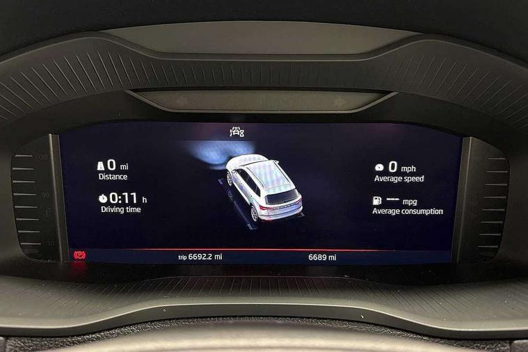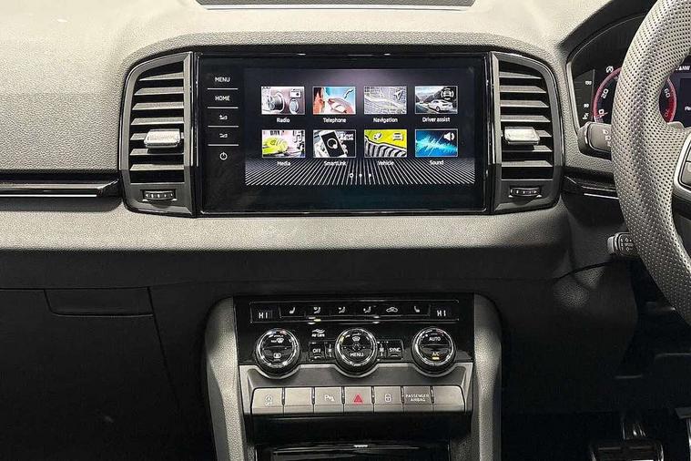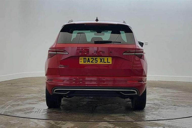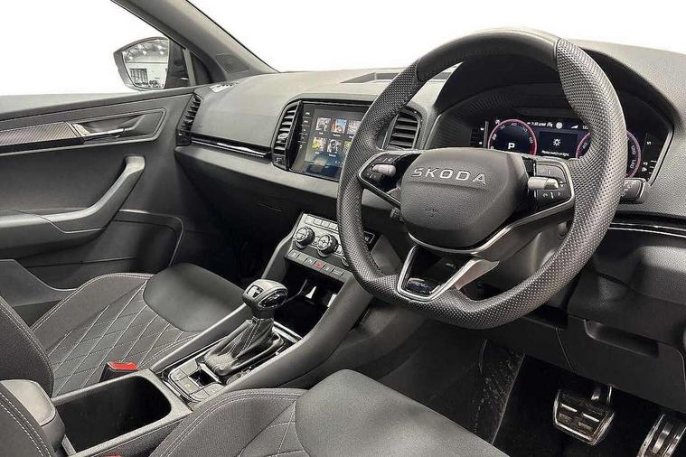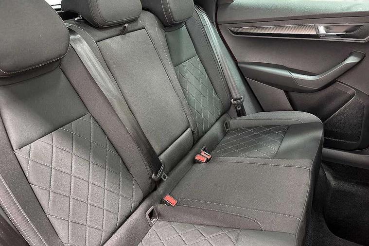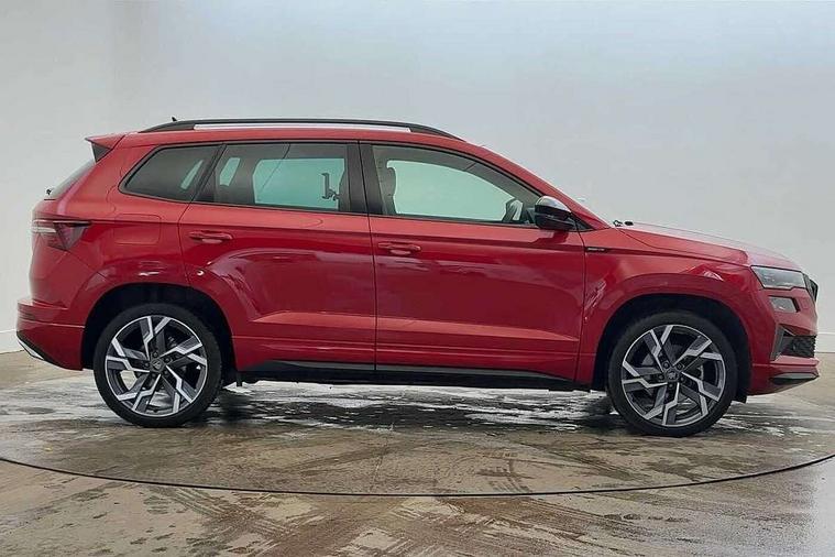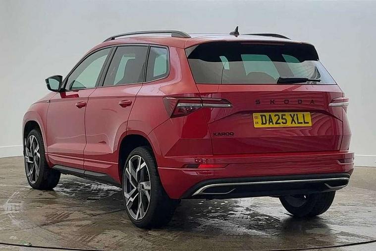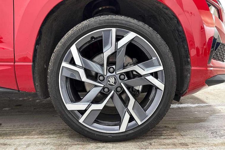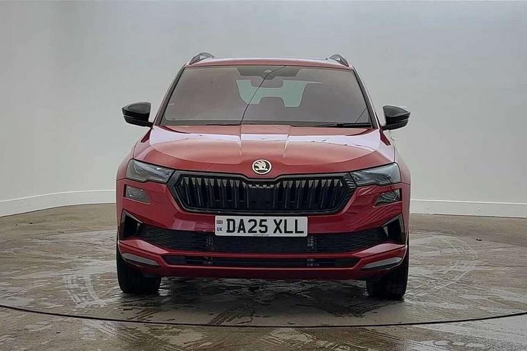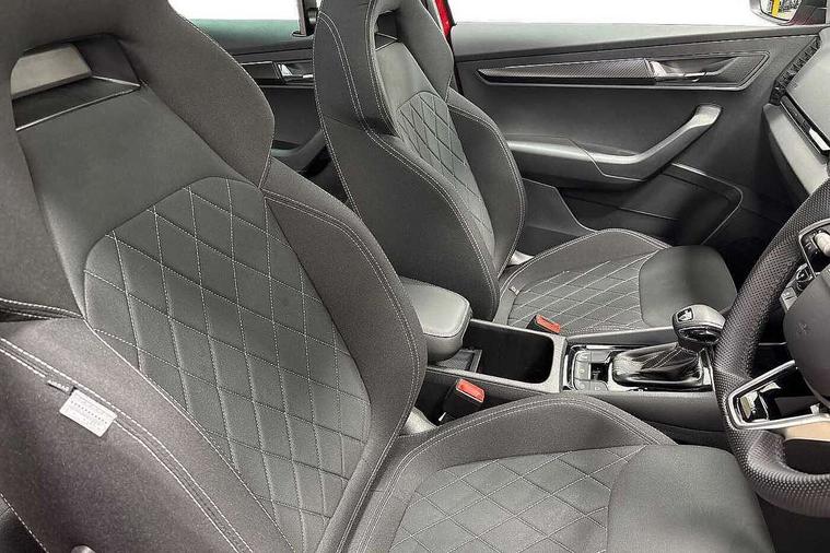 Advanced driver attention and drowsiness monitor, Emergency services call system, Outside temperature gauge, Sensor for driver assistance systems, Service interval indicator, SmartLink wireless for Apple and wired for Android, Start/stop system with regenerative braking, Traffic sign recognition, USB C Port x 2 in front centre console, Virtual Cockpit - 10.25" digital display, Virtual pedal with electrically operated boot door, Wireless smartphone charging, DAB radio with Bluetooth, USB connection, Acoustic glass, Aero front windscreen wipers with intermittent function, Auto dimming rear view mirror with light and rain sensors, Black door mirrors, Black electric window control buttons, Black radiator grille, Black roof rails, Body colour door handles, Electric front and rear windows with child proof lock, Extended rear roof spoiler, Front door steps with SportLine logo, Heated rear windscreen, LED daytime running lights, LED rear lights with high functionality welcome effect and dynamic indicators, Light assistant (coming/leaving home/tunnel light), Panoramic sliding sunroof, Plastic scuff plates in door apertures, Privacy glass, Protective door side sills in body colour, Rear diffuser, Rear side wing doors, Rear window wiper with washer system and intermittent control, Safety reflectors on front doors, Skoda lettering on tailgate in black, Sportline badge on front fender, Sports front and rear bumpers, Third brake light, Unique dark chrome design logo on alloy wheels, 1.5 litre bottle holders in driver and front passenger door panels, 12V socket in boot, 12v socket in front centre armrest with storage compartment and rear air vents, 2 x Tablet holder, 3 rear height adjustable headrests, 3 seat bench in 2nd row, 3 spoke sports leather heated multifunction steering wheel with DSG paddles, 4 foldable roof handles with rear coat hooks, Black floor carpet, Cargo elements in boot, Chrome inner door handles, Foldable hooks in the boot, Front head restraints, Height adjustable front three point seats belts with tensioners, Height/reach adjust steering wheel, Ice scraper, Illuminated glovebox, Illuminated luggage compartment, Isofix child seat preparation for front passenger seat, Isofix child seat preparation outer rear, Manual lumbar support for front seats, Pen holder, Pollen filter, Rear backrest release from boot, Rear boot cover, Rear package tray, Rear reading lights, Rear seats fixed folding and divided 60:40, Rubbish bin door, Safety vest holder, Single front passenger seat, Skoda lettering on steering wheel, Sportline decorative inserts, Storage box in upper central dashboard closed, Sunvisors with illuminated vanity mirrors, Textile floor mats, Ticket holder, Titan black interior ceiling, Umbrella under passenger seat, Under passenger seat storage compartment, Columbus pack - Karoq, LED Interior lighting pack with Skoda welcome logo - Karoq, Light Pack - Karoq, Non Smokers pack, Performance pack - Karoq, Winter plus pack with heated front and rear seats - Karoq, Automatic door unlocking in case of crash, Automatic fuel cut off in case of crash, Driver airbag, Electronic parking brake with auto hold function, Emergency rear braking signal, ESC (incl. ABS+MSR+ASR+EDS+HBA+DSR+RBS+MKB), Front side airbags, Head airbags, Hill hold control, Knee airbags, Passenger airbag with switch-off function, Pedestrian monitor, Seatbelt reminder signalisation and pretensioner for all seats, Three point seatbelts rear, Two tone horn, Tyre pressure monitor, Alarm with interior monitoring, back up horn and tilt sensor with safe function, Electronic engine immobiliser, Keyless entry and start/stop, Remote central locking with 2 remote folding keys, Black air vent surround, Black centre console, carbon door decor, Satin black dashboard, Satin black door trim, 19" Sagittarius anthracite alloy wheels, Anti-theft wheel bolts protection, Breakdown and tool kit,