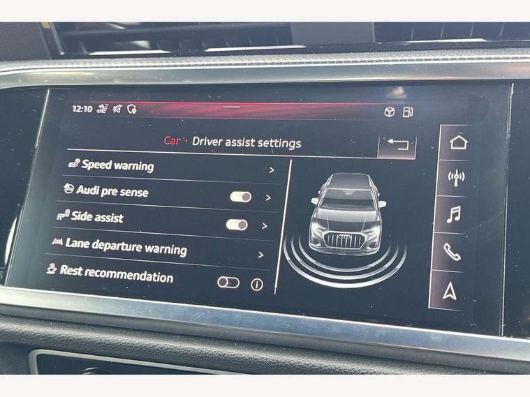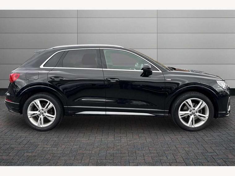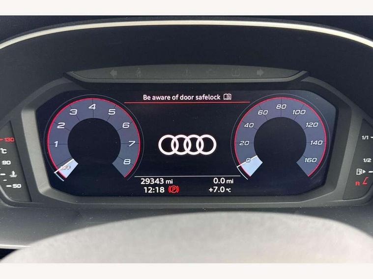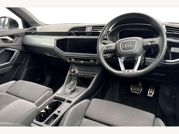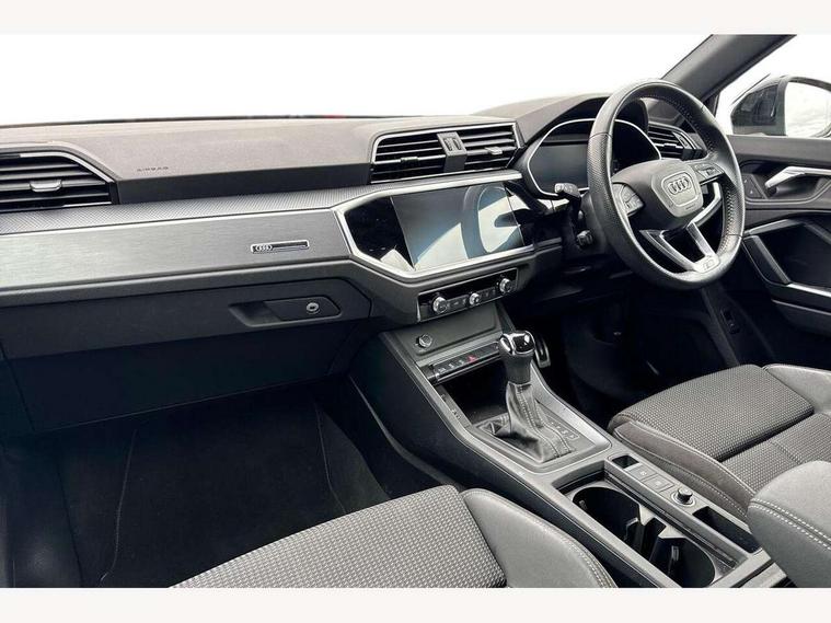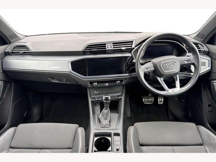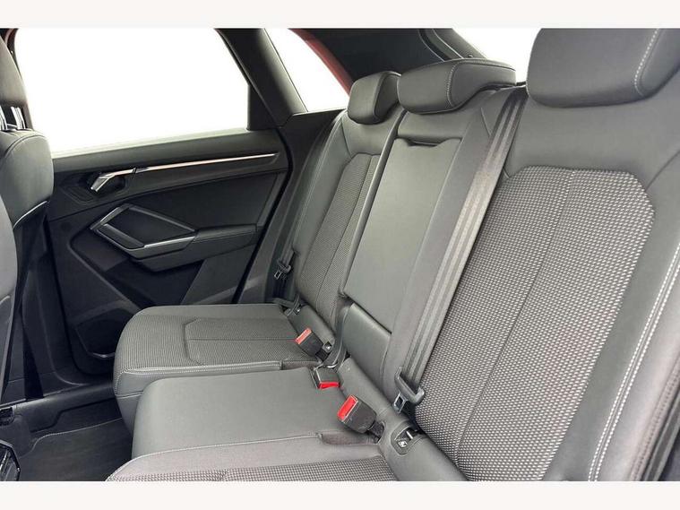 Audi connect safety and service (e-call), Audi drive select, Audi lane departure warning, Audi side assist, Audi smartphone interface includes wireless Apple carplay/Android Auto, Audi Virtual Cockpit - 10.25" display, Bluetooth interface, Camera based traffic sign recognition, MMI Navigation Plus with high resolution 10.1 inch touchscreen colour display, Power operated tailgate, Progressive steering, Service interval indicator, Start stop system with recuperation, Voice control system with natural language interaction, 48V Mild hybrid technology, Sports suspension, 1 x USB type C and 1 USB type A charging points, 6 passive loudspeakers, DAB digital radio module, Acoustic windscreen, Aluminium roof rails, Aluminium window trim, Auto dimming frameless rear view mirror, Body coloured bumpers, Electrically folding, adjustable and heated door mirrors with integrated LED side indicators and kerb view function for passenger side, Front and rear electric windows, Front fog lights, Front side air inlets in matt platinum grey, Front spoiler blade in matt platinum grey, Grille vertical bars in aluminium silver/Matt, High gloss black finish B and C pillars, LED headlights with LED daytime running lights and dynamic rear indicator, LED rear lights, Privacy glass dark tinted rear and rear-side windows (from B-pillar backwards), Rain and light sensors, Rear diffuser strip in matt titanium black, S line badges on front wings, S Line front and rear bumpers, Side skirt insert in matt Platinium grey, Silver chrome grille surround, Titanium black radiator grille, 12V socket in rear centre console, 40:20:40 folding with manual adjustment for 60:40 forwards/backwards position and backrest angle, Adjustable rear seat bench/backrest with centre armrest and cupholder, Black cloth headlining, Dual zone electronic climate control, Front and rear black floor mats with contrast stitching in rock grey, Front and rear headrests, Front and rear roof module including reading lights, Front centre armrest, Glove compartment lighting, Height and reach adjustable steering wheel, Illuminated door sill trims with S logo, ISOFIX child seat mounting for front passenger with airbag deactivation and outer rear seat including top tether attachment point for outer rear seats, Luggage compartment light, Manual front seats with height adjustment, Perforated leather gearknob, Stainless steel luggage compartment sill finisher, Stainless steel pedals, Tool kit, Non smoking pack - Q3, 3x3 point rear seatbelts, 6 airbags - Driver, front passenger, curtain and side windows, Electrically operated child locks on rear doors, Electromechanical parking brake, Electronic stabilisation control including ABS, ASR and EDL, Hill descent control, Hill hold assist, Pre sense basic, Seatbelt monitoring, Tyre pressure warning, Warning triangle and first aid kit, Anti theft alarm, Anti theft wheel bolts, Audi pre-sense front with pedestrain and cyclist recognition, Remote central locking, Dark matt brushed aluminium inlay, Leatherette door armrest, MMI touch colour display in glass look, black with surround in aluminium look, Tyre repair kit,