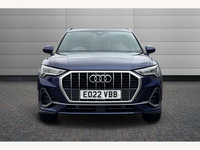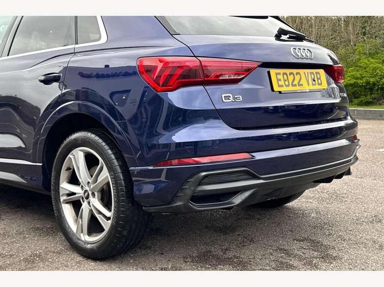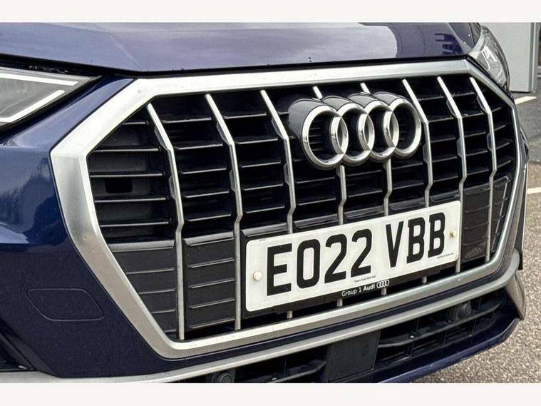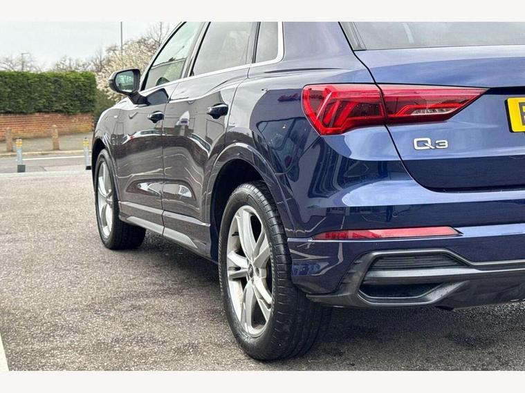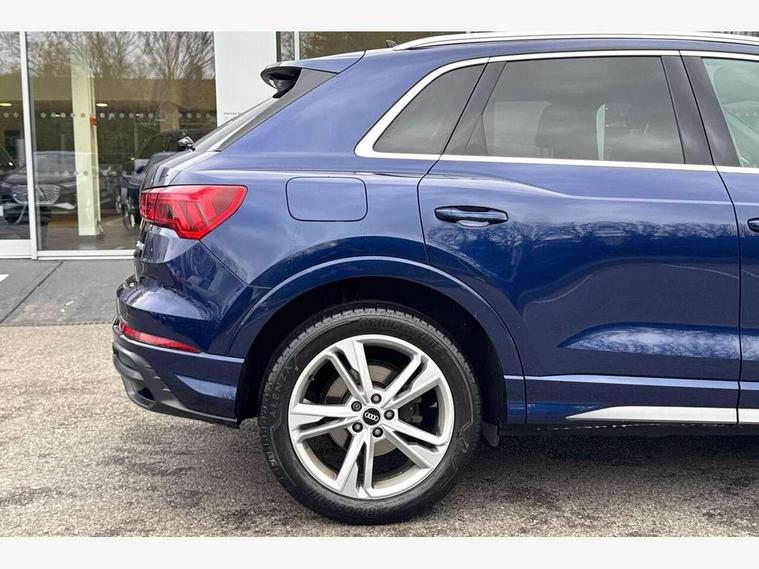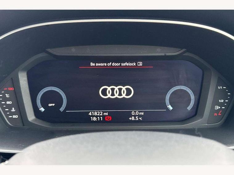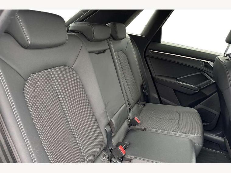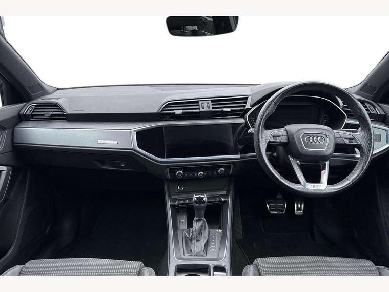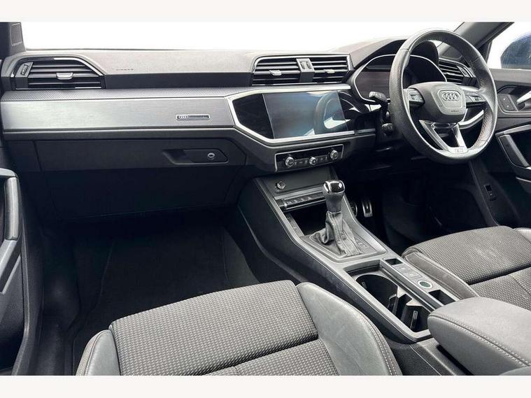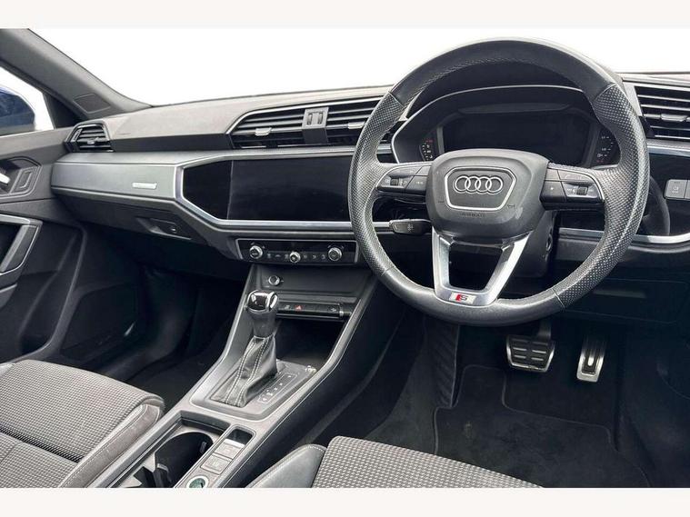 Amazon alexa Integration, Audi connect safety and service (e-call), Audi drive select, Audi lane departure warning, Audi Virtual Cockpit - 10.25" display, Bluetooth interface, Camera based traffic sign recognition, MMI Navigation Plus with high resolution 10.1 inch touchscreen colour display, Power operated tailgate, Progressive steering, Service interval indicator, Smartphone interface includes wireless Apple carplay/Android Auto, Start stop system with recuperation, Voice control system with natural language interaction, Diesel particulate filter, Sports suspension, 2 USB-C ports with charge and data functions, 6 passive loudspeakers, DAB digital radio module, Acoustic windscreen, Aluminium roof rails, Aluminium window trim, Auto dimming frameless rear view mirror, Body coloured bumpers, Electrically folding, adjustable and heated door mirrors with integrated LED side indicators and kerb view function for passenger side, Front and rear electric windows, Front fog lights, Front side air inlets in matt platinum grey, Front spoiler blade in matt platinum grey, Grille vertical bars in aluminium silver/Matt, High gloss black finish B and C pillars, LED headlights with LED daytime running lights, LED rear lights, LED third brake light, Privacy glass dark tinted rear and rear-side windows (from B-pillar backwards), Rain and light sensors, Rear diffuser strip in matt titanium black, Rear side wing doors, Rear wiper, S line badges on front wings, S Line front and rear bumpers, Side skirt insert in matt Platinium grey, Silver chrome grille surround, Tinted rear windows, Titanium black radiator grille, Variable front intermittent wipers, 12V socket in rear centre console, 3 seat bench in 2nd row, 40:20:40 folding with manual adjustment for 60:40 forwards/backwards position and backrest angle, Adjustable rear seat bench/backrest with centre armrest and cupholder, Black cloth headlining, Dual zone electronic climate control, Front and rear black floor mats with contrast stitching in rock grey, Front and rear headrests, Front and rear roof module including reading lights, Front centre armrest, Glove compartment lighting, Height and reach adjustable steering wheel, Illuminated door sill trims with S logo, ISOFIX child seat mounting for front passenger with airbag deactivation and outer rear seat including top tether attachment point for outer rear seats, Luggage compartment light, Manual front seats with height adjustment, Perforated leather gearknob, Single front passenger seat, Stainless steel luggage compartment sill finisher, Stainless steel pedals, Non smoking pack - Q3, 3x3 point rear seatbelts, 6 airbags - Driver, front passenger, curtain and side windows, Audi pre-sense front with pedestrain and cyclist recognition, Electrically operated child locks on rear doors, Electromechanical parking brake, Electronic stabilisation control including ABS, ASR and EDL, Front seatbelt reminder, Hill descent control, Hill hold assist, Pre sense basic, Seatbelt monitoring, Tyre pressure warning, Warning triangle and first aid kit, Anti theft alarm, Anti theft wheel bolts, Immobiliser, Remote central locking, Dark matt brushed aluminium inlay, Detail dashboard around MMI touch colour display in glass look, black with surround in aluminium look, Leatherette door armrest,