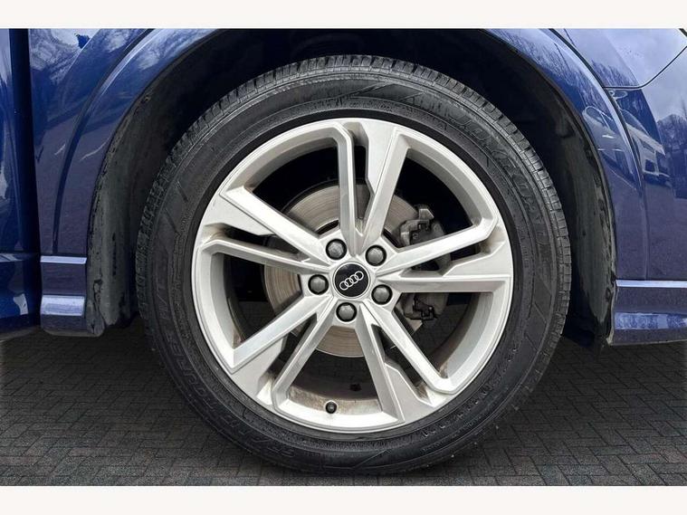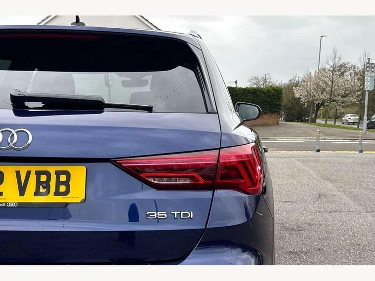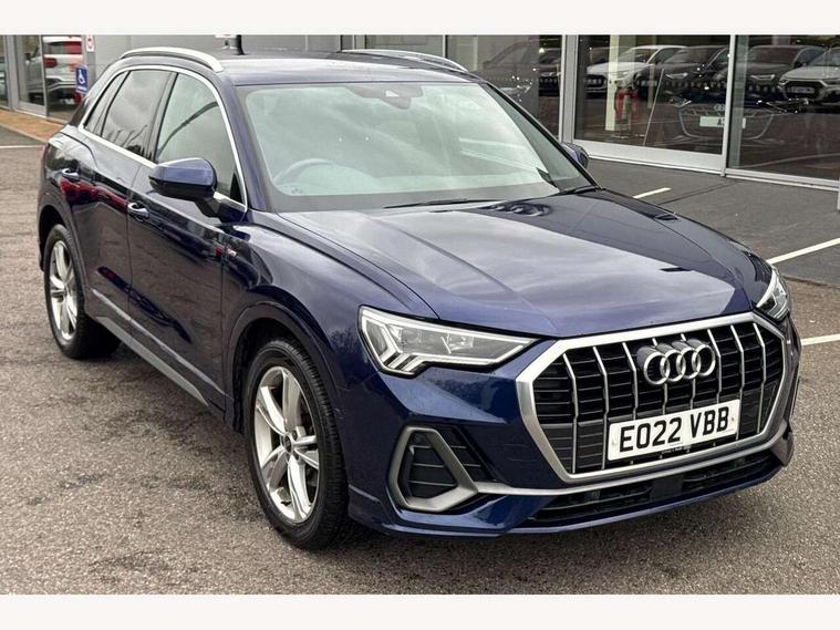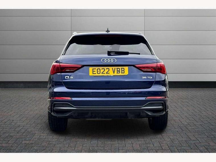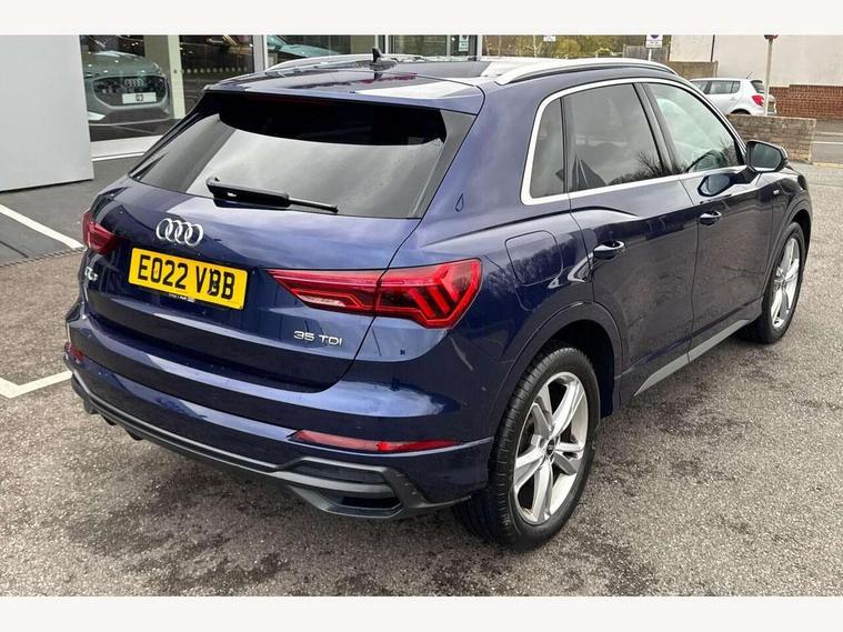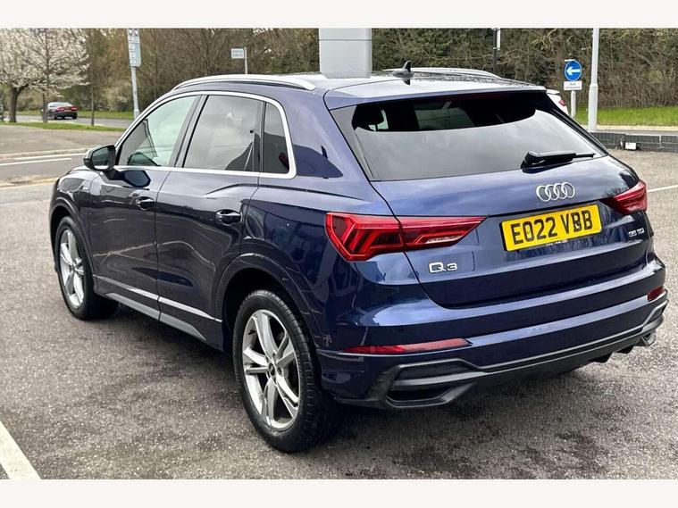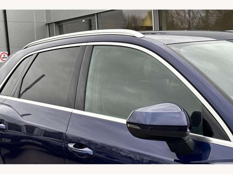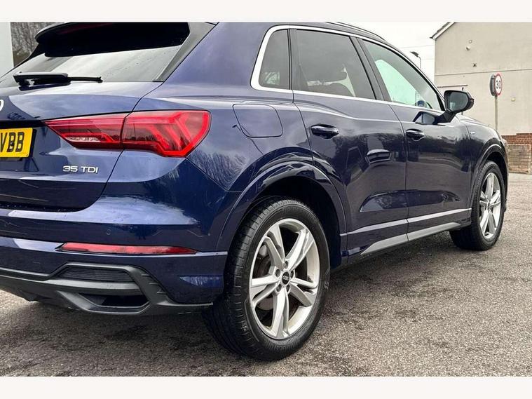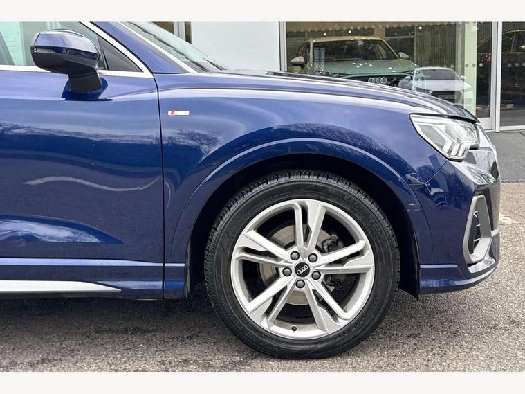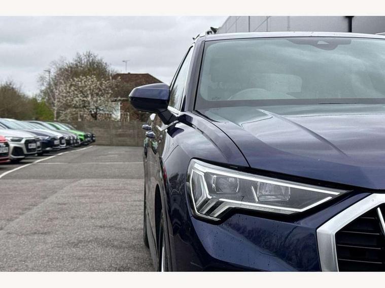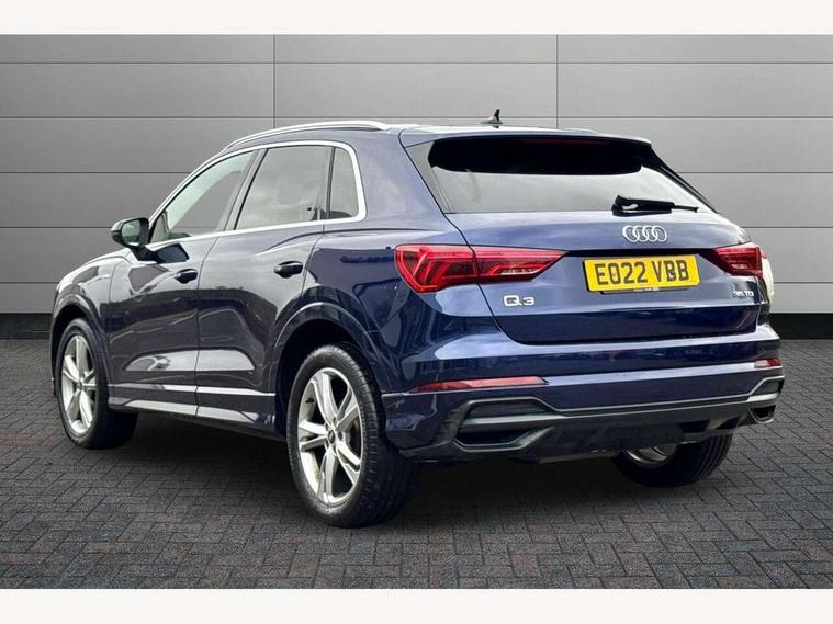 Amazon alexa Integration, Audi connect safety and service (e-call), Audi drive select, Audi lane departure warning, Audi Virtual Cockpit - 10.25" display, Bluetooth interface, Camera based traffic sign recognition, MMI Navigation Plus with high resolution 10.1 inch touchscreen colour display, Power operated tailgate, Progressive steering, Service interval indicator, Smartphone interface includes wireless Apple carplay/Android Auto, Start stop system with recuperation, Voice control system with natural language interaction, Diesel particulate filter, Sports suspension, 2 USB-C ports with charge and data functions, 6 passive loudspeakers, DAB digital radio module, Acoustic windscreen, Aluminium roof rails, Aluminium window trim, Auto dimming frameless rear view mirror, Body coloured bumpers, Electrically folding, adjustable and heated door mirrors with integrated LED side indicators and kerb view function for passenger side, Front and rear electric windows, Front fog lights, Front side air inlets in matt platinum grey, Front spoiler blade in matt platinum grey, Grille vertical bars in aluminium silver/Matt, High gloss black finish B and C pillars, LED headlights with LED daytime running lights, LED rear lights, LED third brake light, Privacy glass dark tinted rear and rear-side windows (from B-pillar backwards), Rain and light sensors, Rear diffuser strip in matt titanium black, Rear side wing doors, Rear wiper, S line badges on front wings, S Line front and rear bumpers, Side skirt insert in matt Platinium grey, Silver chrome grille surround, Tinted rear windows, Titanium black radiator grille, Variable front intermittent wipers, 12V socket in rear centre console, 3 seat bench in 2nd row, 40:20:40 folding with manual adjustment for 60:40 forwards/backwards position and backrest angle, Adjustable rear seat bench/backrest with centre armrest and cupholder, Black cloth headlining, Dual zone electronic climate control, Front and rear black floor mats with contrast stitching in rock grey, Front and rear headrests, Front and rear roof module including reading lights, Front centre armrest, Glove compartment lighting, Height and reach adjustable steering wheel, Illuminated door sill trims with S logo, ISOFIX child seat mounting for front passenger with airbag deactivation and outer rear seat including top tether attachment point for outer rear seats, Luggage compartment light, Manual front seats with height adjustment, Perforated leather gearknob, Single front passenger seat, Stainless steel luggage compartment sill finisher, Stainless steel pedals, Non smoking pack - Q3, 3x3 point rear seatbelts, 6 airbags - Driver, front passenger, curtain and side windows, Audi pre-sense front with pedestrain and cyclist recognition, Electrically operated child locks on rear doors, Electromechanical parking brake, Electronic stabilisation control including ABS, ASR and EDL, Front seatbelt reminder, Hill descent control, Hill hold assist, Pre sense basic, Seatbelt monitoring, Tyre pressure warning, Warning triangle and first aid kit, Anti theft alarm, Anti theft wheel bolts, Immobiliser, Remote central locking, Dark matt brushed aluminium inlay, Detail dashboard around MMI touch colour display in glass look, black with surround in aluminium look, Leatherette door armrest,