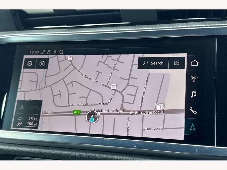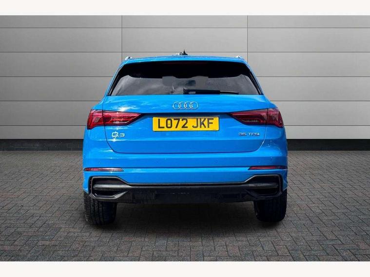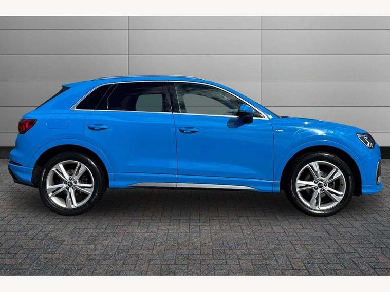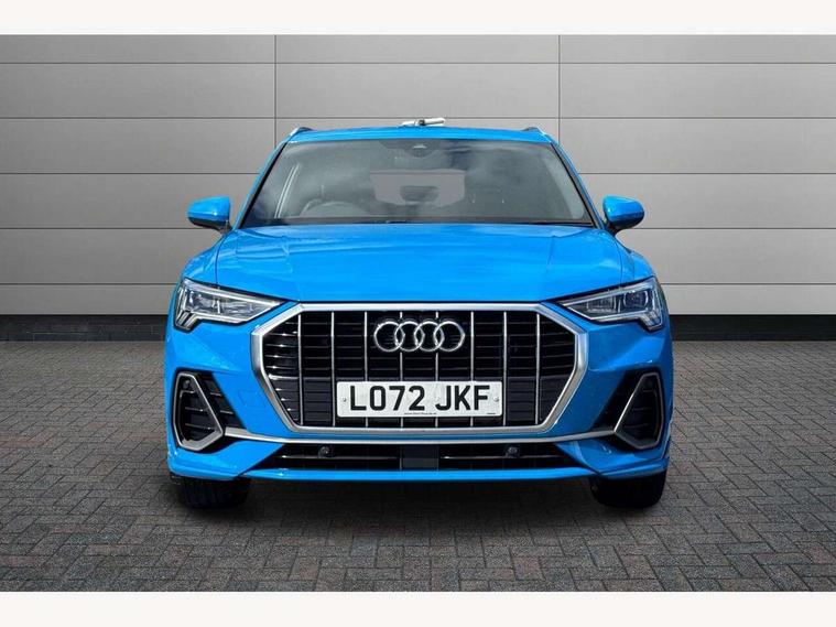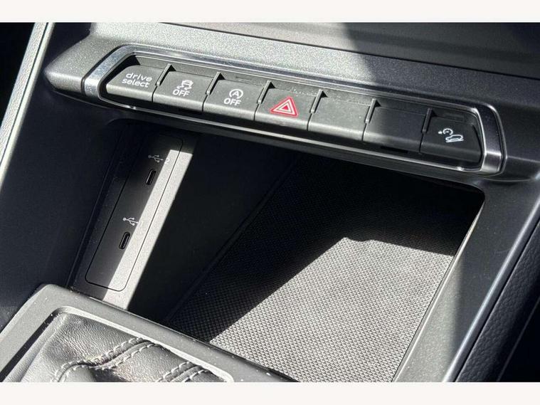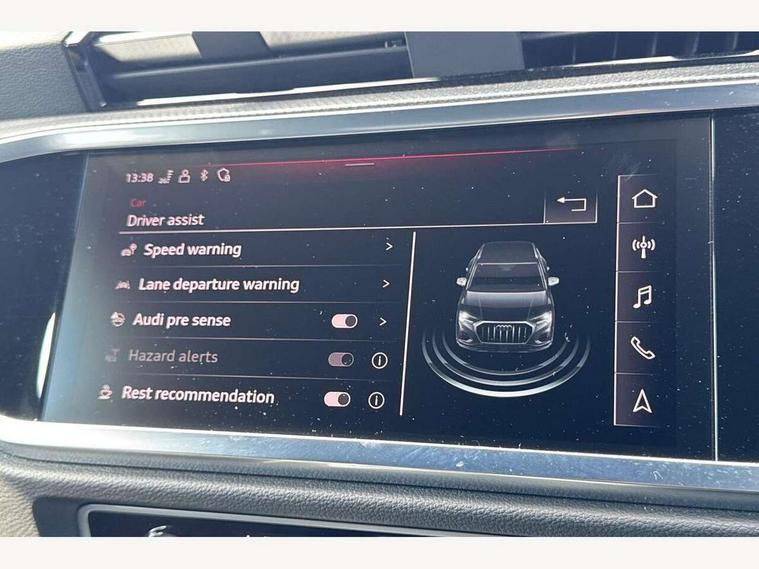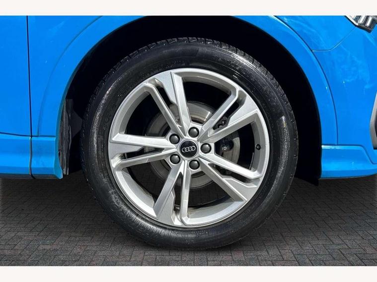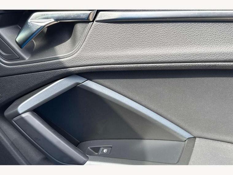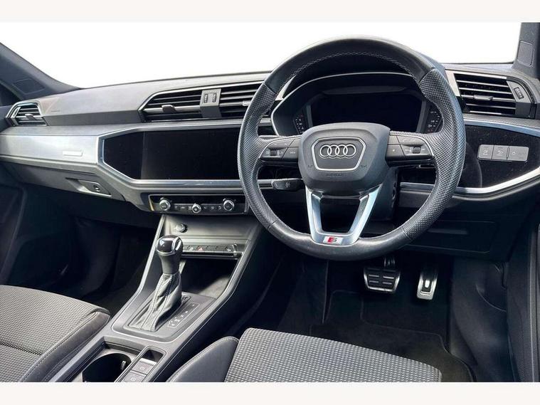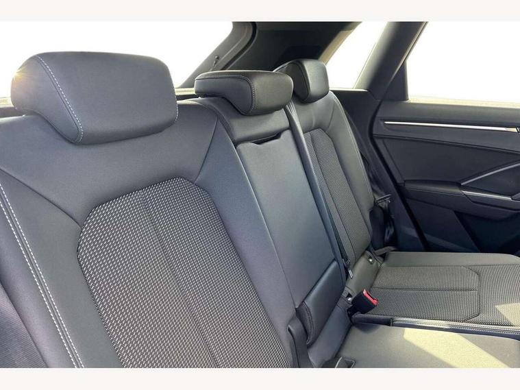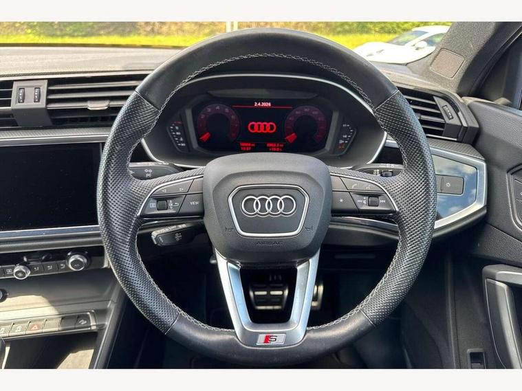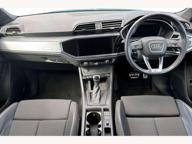 Amazon alexa Integration, Audi drive select, Audi lane departure warning, Audi Virtual Cockpit - 10.25" display, Bluetooth interface, Camera based traffic sign recognition, Legal emergency call, MMI Navigation Plus with high resolution 10.1 inch touchscreen colour display, Power operated tailgate, Progressive steering, Service interval indicator, Smartphone interface includes wireless Apple carplay/Android Auto, Start stop system with recuperation, Voice control system with natural language interaction, Sports suspension, 2 USB-C ports with charge and data functions, 6 passive loudspeakers, DAB digital radio module, Acoustic windscreen, Aluminium roof rails, Aluminium window trim, Auto dimming frameless rear view mirror, Body colour front spoiler blade, Body coloured bumpers, Electrically folding, adjustable and heated door mirrors with integrated LED side indicators and kerb view function for passenger side, Front and rear electric windows, Front fog lights, Front side air inlets in matt platinum grey, Grille vertical bars in aluminium silver/Matt, High gloss black finish B and C pillars, LED Dynamic rear indicators, LED headlights with LED daytime running lights, LED rear lights, LED third brake light, Privacy glass dark tinted rear and rear-side windows (from B-pillar backwards), Rain and light sensors, Rear diffuser grille in grained matt black, Rear diffuser strip in matt titanium black, Rear side wing doors, Rear wiper, S line badges on front wings, S Line front and rear bumpers, Side skirt insert in matt Platinium grey, Titanium black radiator grille, Variable front intermittent wipers, 12V socket in rear centre console, 3 seat bench in 2nd row, 40:20:40 folding with manual adjustment for 60:40 forwards/backwards position and backrest angle, Adjustable rear seat bench/backrest with centre armrest and cupholder, Black cloth headlining, Dual zone electronic climate control, Front and rear black floor mats with contrast stitching in rock grey, Front and rear headrests, Front and rear roof module including reading lights, Front centre armrest, Glove compartment lighting, Height and reach adjustable steering wheel, Illuminated door sill trims with S logo, ISOFIX child seat mounting for front passenger with airbag deactivation and outer rear seat including top tether attachment point for outer rear seats, Luggage compartment light, Manual front seats with height adjustment, Perforated leather gearknob, Single front passenger seat, Stainless steel luggage compartment sill finisher, Stainless steel pedals, Ambient lighting pack - Q3, Non smoking pack - Q3, 3x3 point rear seatbelts, 6 airbags - Driver, front passenger, curtain and side windows, Audi pre-sense front with pedestrain and cyclist recognition, Electrically operated child locks on rear doors, Electromechanical parking brake, Electronic stabilisation control including ABS, ASR and EDL, Front seatbelt reminder, Hill descent control, Hill hold assist, Pre sense basic, Seatbelt monitoring, Tyre pressure warning, Warning triangle and first aid kit, Anti theft alarm, Anti theft wheel bolts, Immobiliser, Remote central locking, Dark matt brushed aluminium inlay, Detail dashboard around MMI touch colour display in glass look, black with surround in aluminium look, Leatherette door armrest,